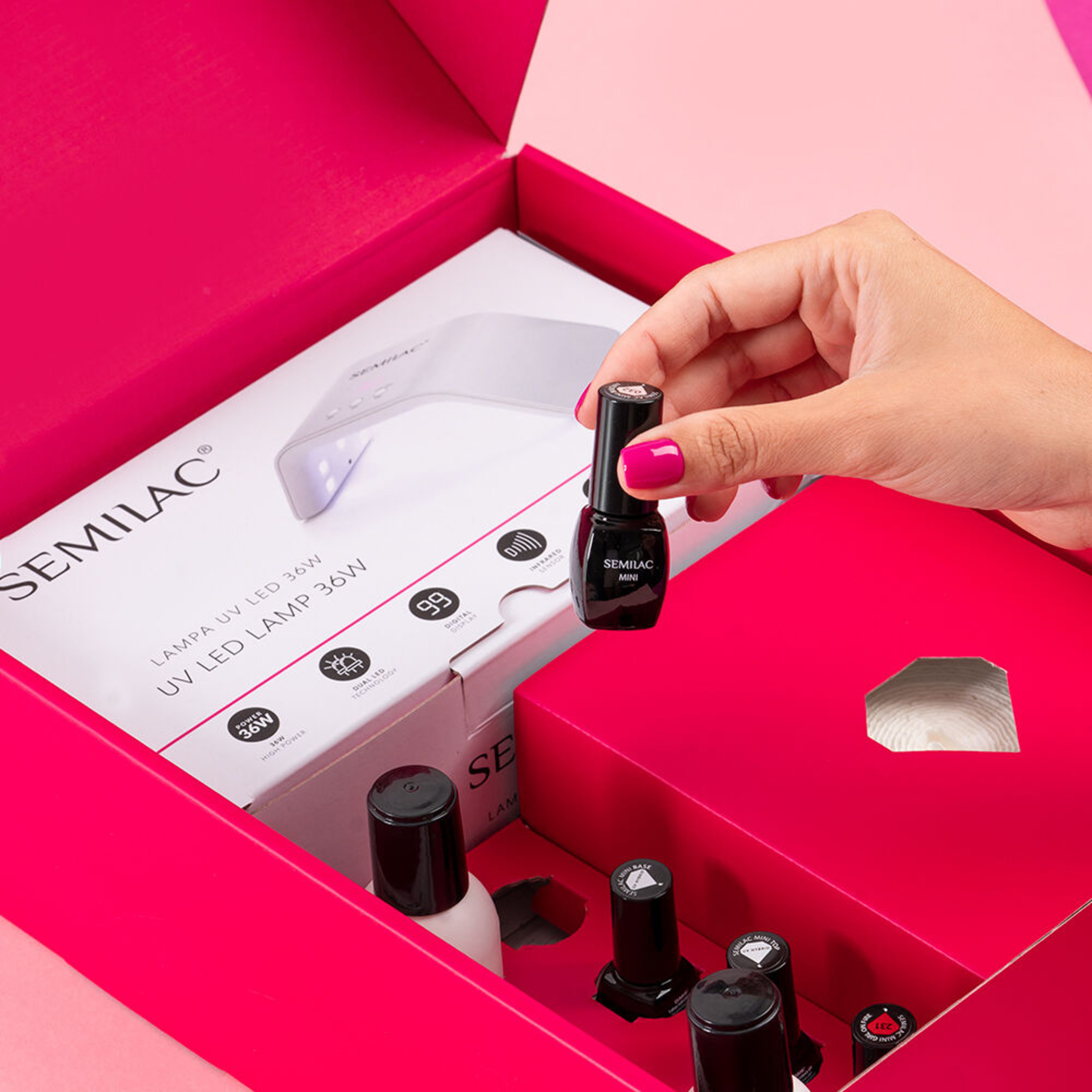 UV-LED-LAMPE - Das Set zeichnet sich durch eine großartige LED24 / 36W-Lampe aus, die mit einem Bewegungssensor ausgestattet ist, welcher automatisch aktiviert wird, und einem Temperaturmodus, welcher die Hitze reguliert. Dank dessen können Sie sicher sein, dass der Lack richtig aushärtet ist.