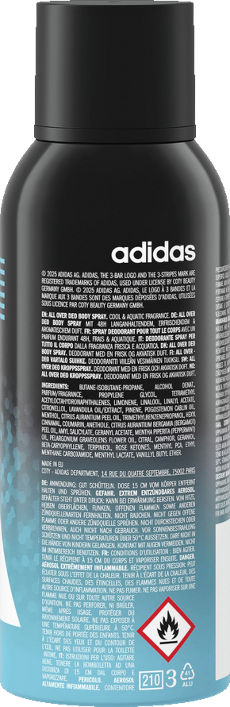 Das adidas Ice Dive Deo Body Spray für ihn fängt die belebenden Momente des Sports ein – maximales Frischeerlebnis mit extralanganhaltender Duft-Komposition bis zu 48 Stunden. Das Deo Body Spray bietet ein erfrischend-aquatisches Dufterlebnis mit ätherischem Zitronenöl. Die vegane Formel ist dermatologisch getestet und enthält keine Aluminiumsalze. Auch die Kleidungwird geschont: Das Ice Dive Deo Body Spray schützt zuverlässig ohne Flecken zu hinterlassen. In puncto Nachhaltigkeit kann das Deo ebenfalls punkten: Die Dose besteht aus recycelbarem Aluminium und recycelbarer Kunststoff-Kappe.