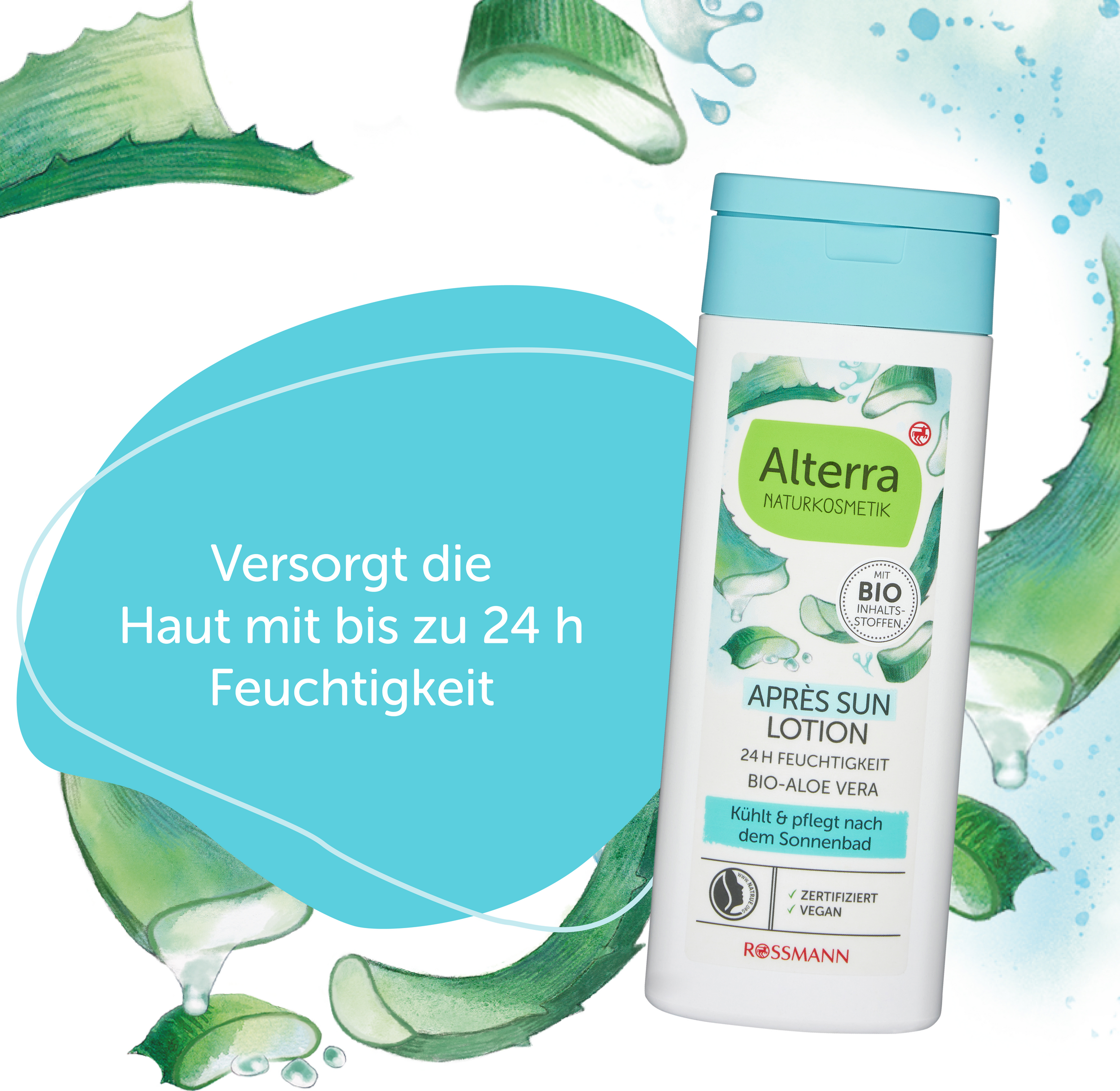 Unsere Alterra Après Sun Lotion mit Bio-Avocadoöl und Bio-Kokosöl pflegt und kühlt Ihre Haut nach dem Sonnenaufenthalt, versorgt sie für 24 Stunden mit Feuchtigkeit – und duftet dabei herrlich erfrischend sommerlich.