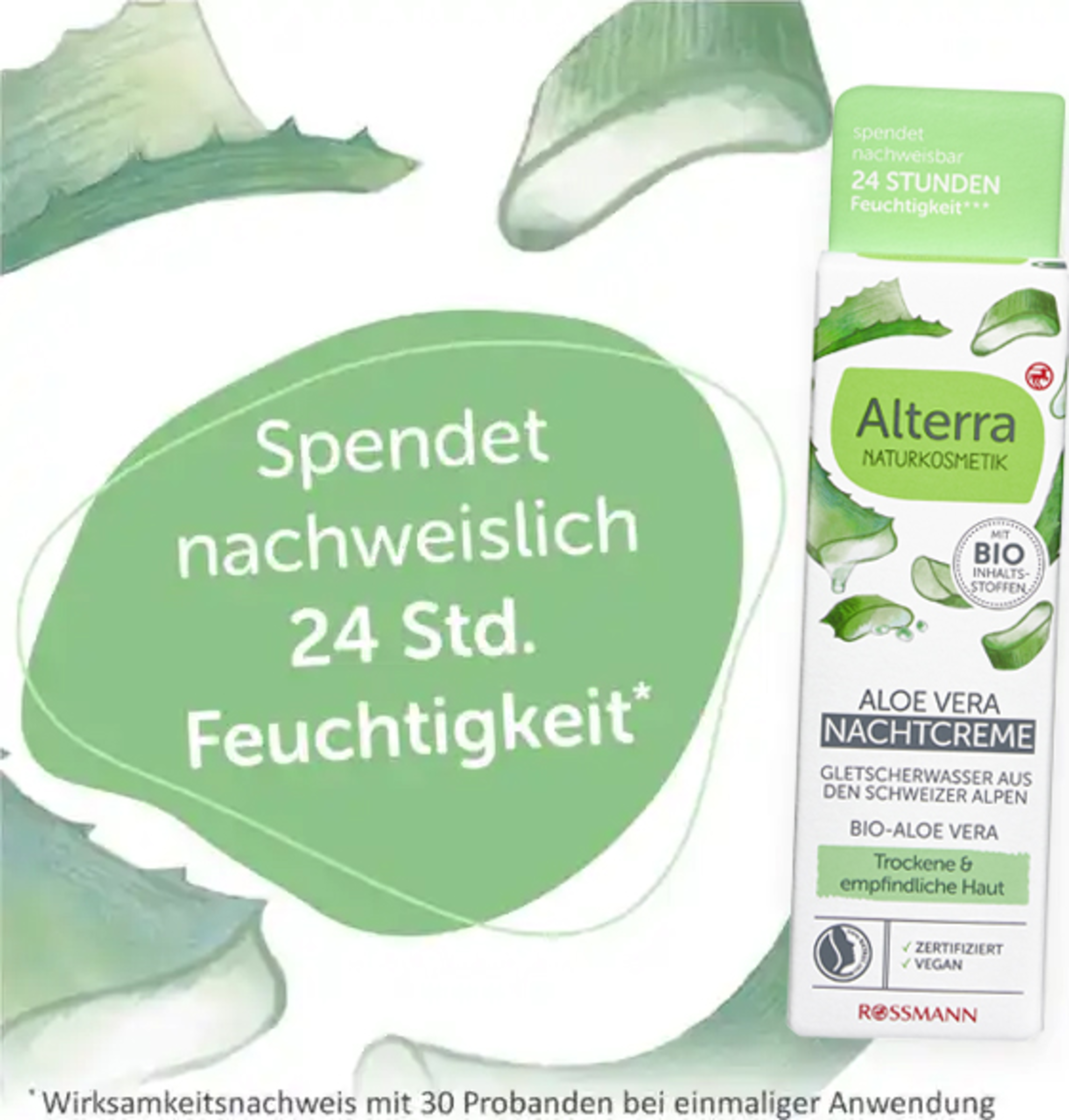 Bio-Aloe Vera ist eine beruhigende und harmonisierende Pflege speziell für die besonderen Bedürfnisse der trockenen und empfindlichen Haut während der Nacht. Pflanzliches Glycerin gleicht den Feuchtigkeitshaushalt der Haut aus. Das kostbare und natürliche Gletscherwasser aus den Schweizer Alpen verleiht Ihnen ein Gefühl von Frische und Reinheit. Die reichhaltige Kombination mit Bio-Sonnenblumenöl und Bio-Sheabutter pflegt die Haut und sorgt für ein samtweiches Hautgefühl. Kakaobutter und beruhigendes Bisabolol sorgen für eine Extraportion