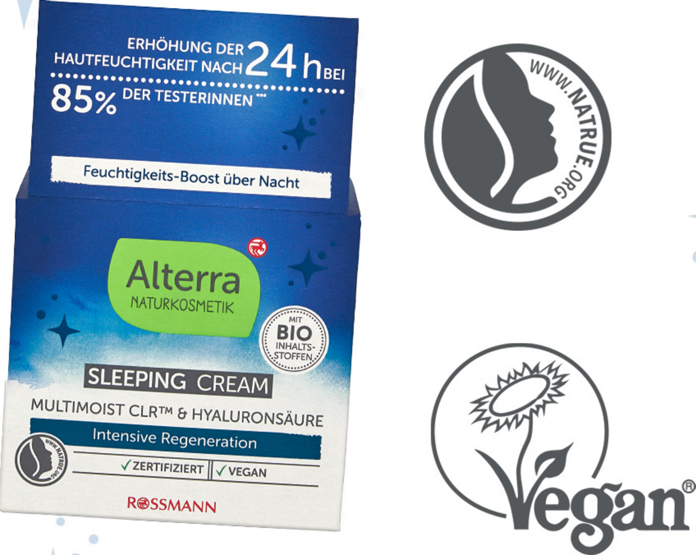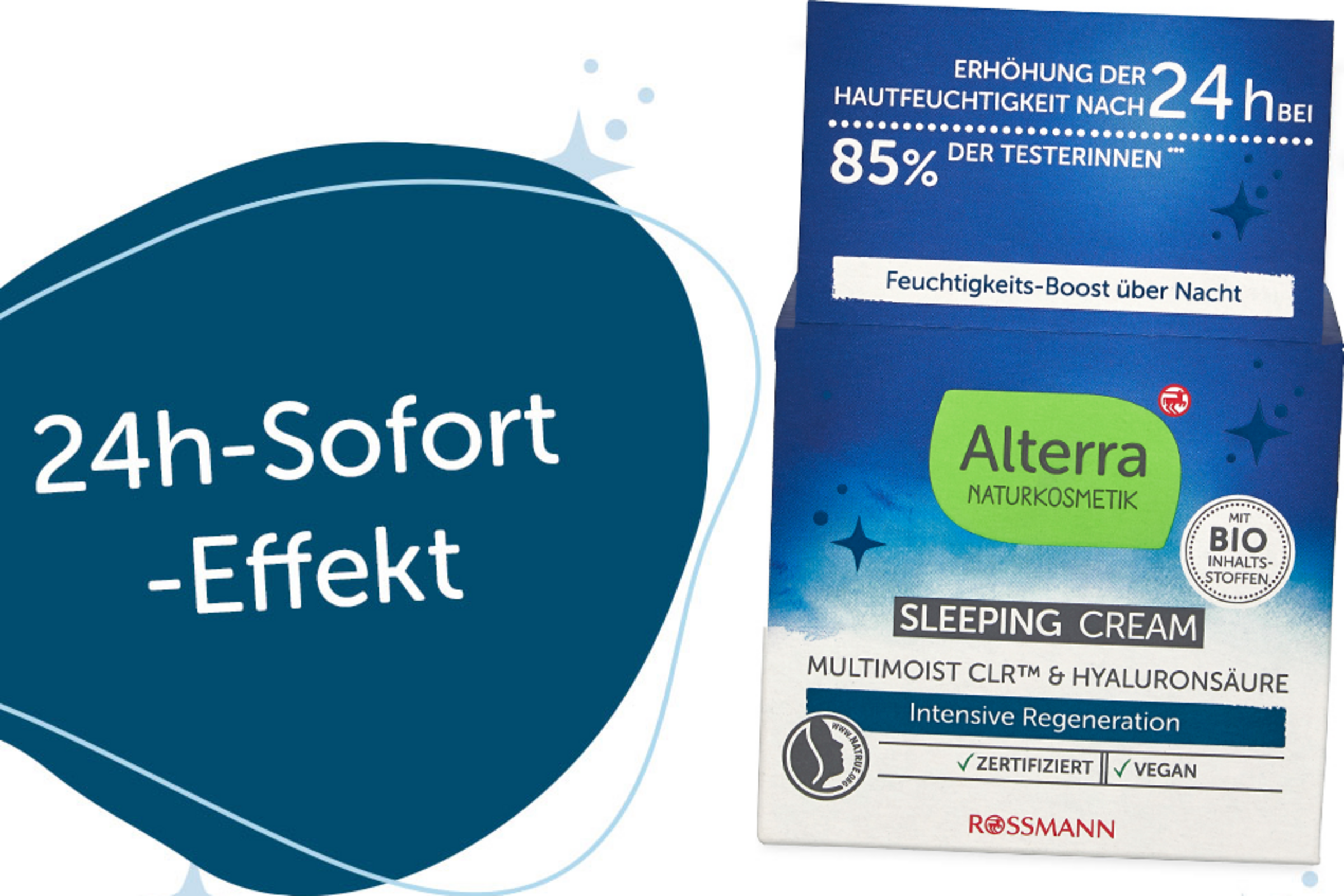 Gehen Sie schlafen: Abends aufgetragen, versorgt Multimoist CLR™ in der Alterra Sleeping Cream Ihre Haut über Nacht mit Feuchtigkeit - für ein erfrischtes Aussehen und weniger Trockenheitsfältchen dank der speziellen "Anti-Müde-Haut"-Formel mit Mandelblütenextrakt, Hyaluronsäure, Vitamin E sowie Bio-Aprikosenkernöl und Bio-Mandelöl.