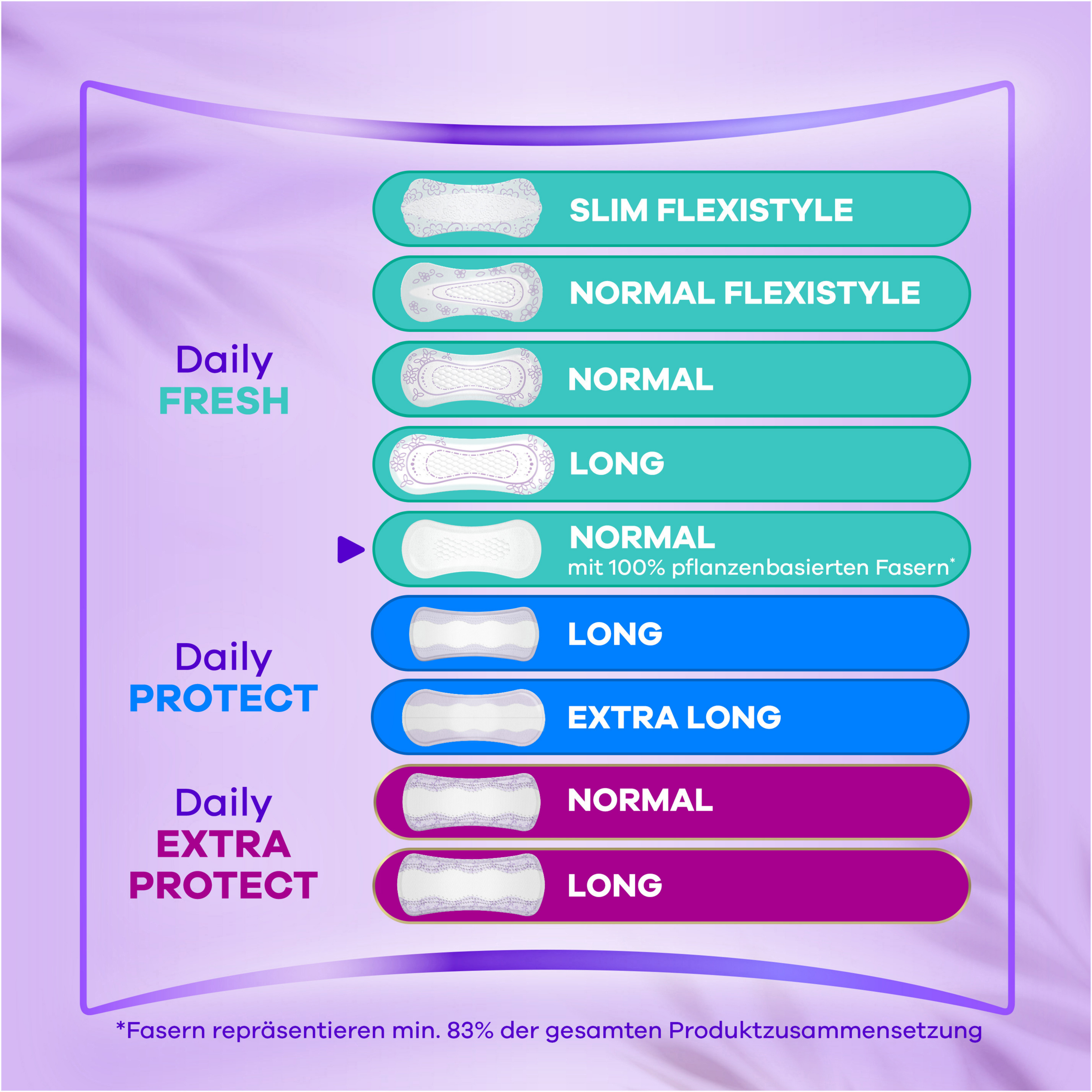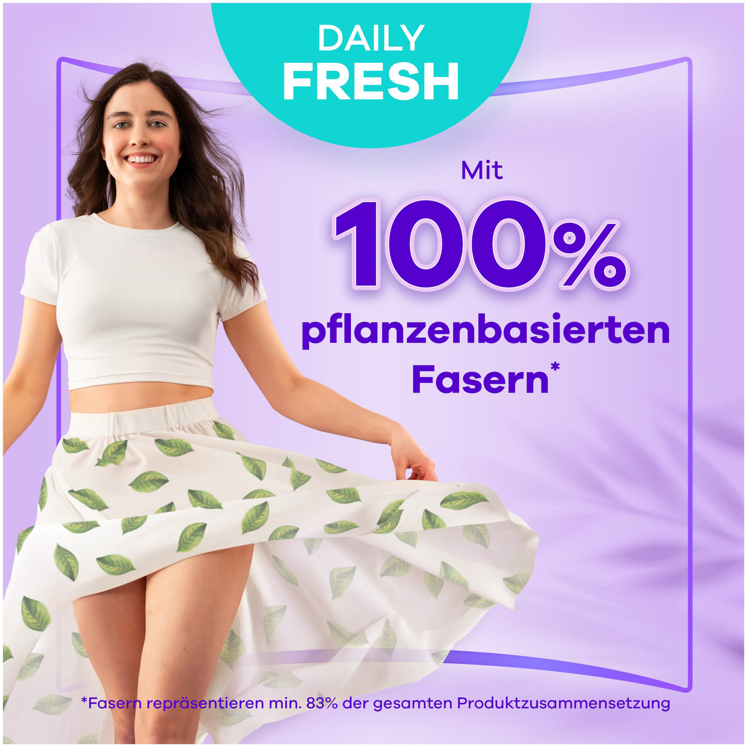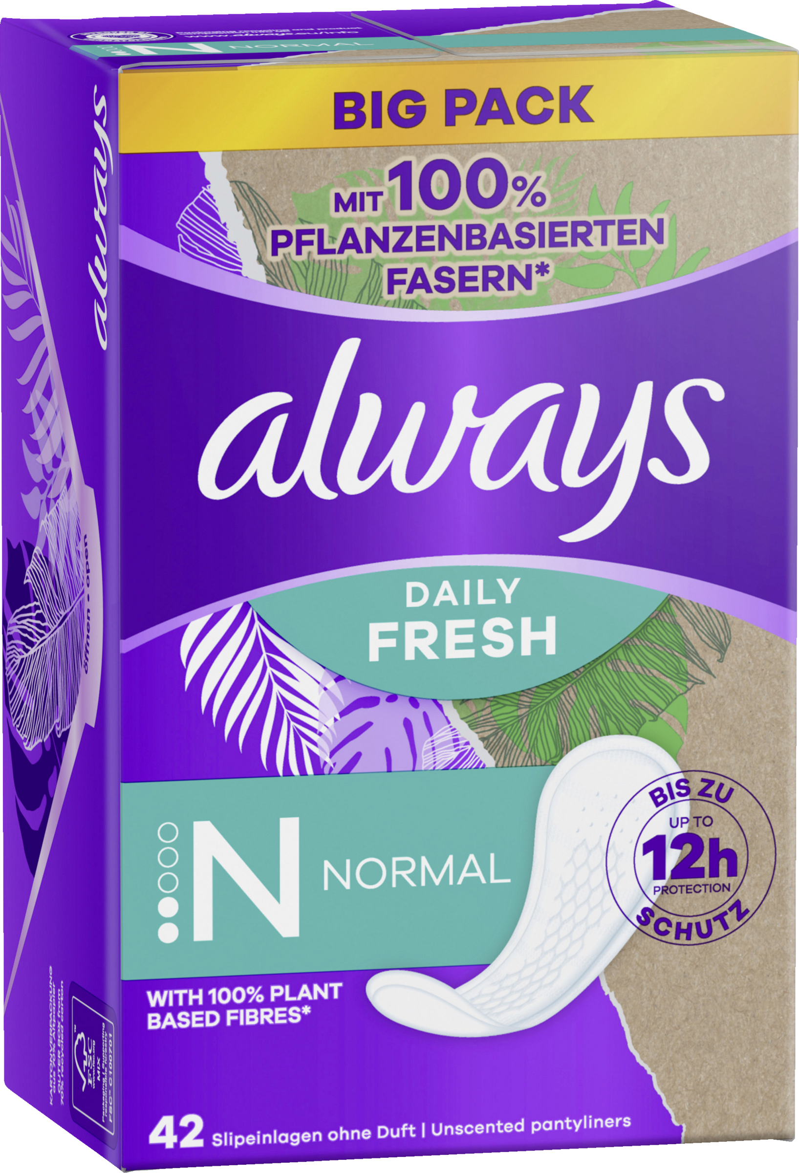 Angenehme Frische den ganzen Tag mit Always Daily Fresh Slipeinlagen Normal, jetzt mit 100 % pflanzenbasierten Fasern. Diese Slipeinlagen bieten bis zu 12 Stunden Schutz. 0 % Plastik auf der Haut und ohne Duft. Sie sorgen den ganzen Tag für Frische und Schutz gegen Schweiß, Ausfluss und bei unregelmäßiger und leichter Periode. Genieße jeden Tag das frische Gefühl eines sauberen Slips.