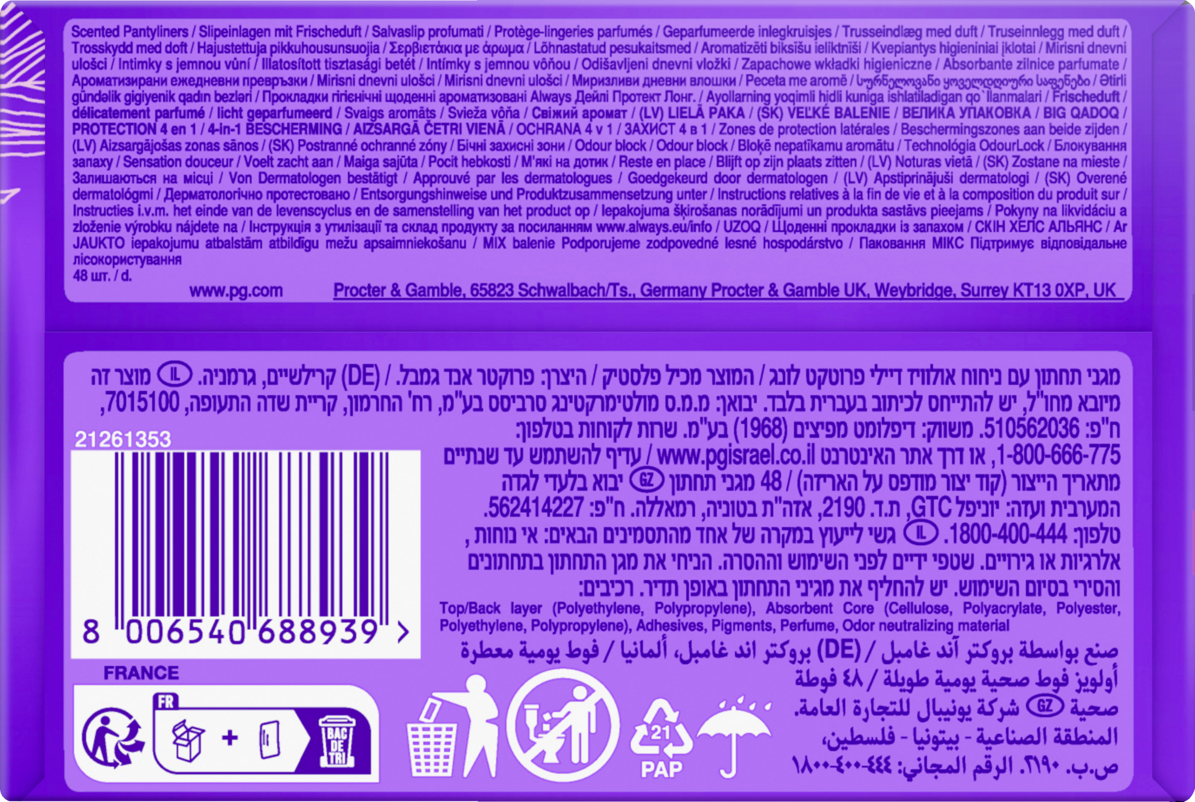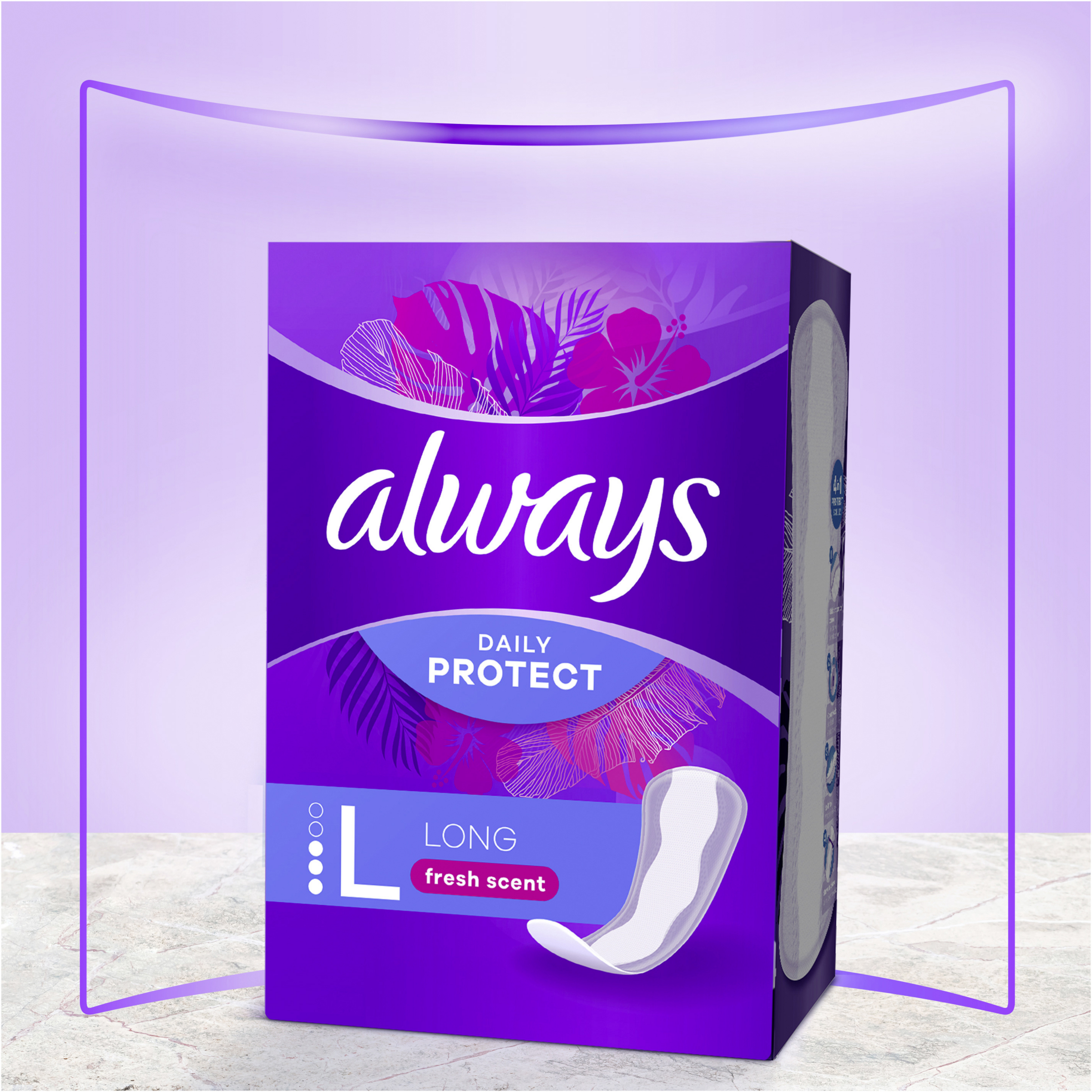 Bleibe den ganzen Tag über geschützt mit Always Daily Protect Long Slipeinlagen. Diese Slipeinlagen verfügen über eine zusätzliche Länge und Breite für extra Schutz sowie über einen exklusiven Blütenduft. Mit ihrer absorbierenden Zone und seitlichem Auslaufschutz sind sie dein zusätzlicher Schutz bei vaginalem Ausfluss, unregelmäßiger und leichter Periode oder bei leichter Blasenschwäche. Genieße das frische Gefühl eines sauberen Höschens.