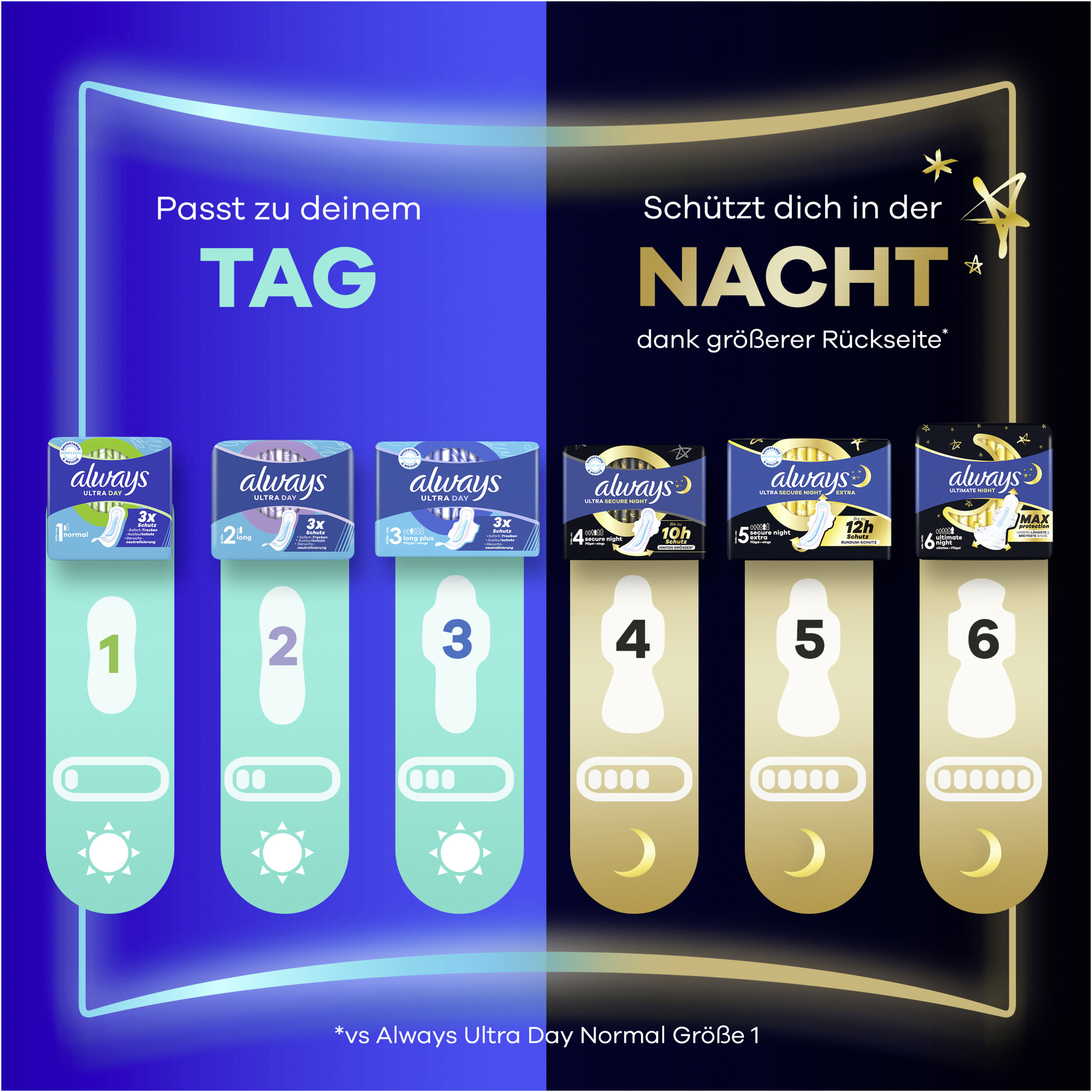 Gib dich nicht mit weniger als 3-fachem Schutz zufrieden: ALWAYS Ultra Normal (Größe 1) Damenbinden verwenden die neueste Technologie, um eine multifunktionale Binde mit 3 Schutzfunktionen zu bieten. Das InstantDry-System absorbiert die Flüssigkeit in Sekunden und hält die Feuchtigkeit von der Haut fern. Die LeakGuard-Technologie schließt die Flüssigkeit ein und verhindert das Auslaufen. Die Binde ist außerdem mit der OdourLock-Technologie ausgestattet, die Gerüche neutralisiert, sodass du dich während deiner Periode frisch und geschützt fühlst. Mit ALWAYS Ultra kannst du unbeschwert deinen Alltag gestalten. Hinterfrage deinen aktuellen Schutz & hol dir den 3-fach Schutz mit ALWAYS.Dermatologisch von der Skin Health Alliance bestätigt. Teste ALWAYS Ultra Secure Night Extra, die besten Damenbinden von ALWAYS für den Schutz während der Nacht.Mit ALWAYS My Fit findest du die richtige Passform für deine Bedürfnisse.