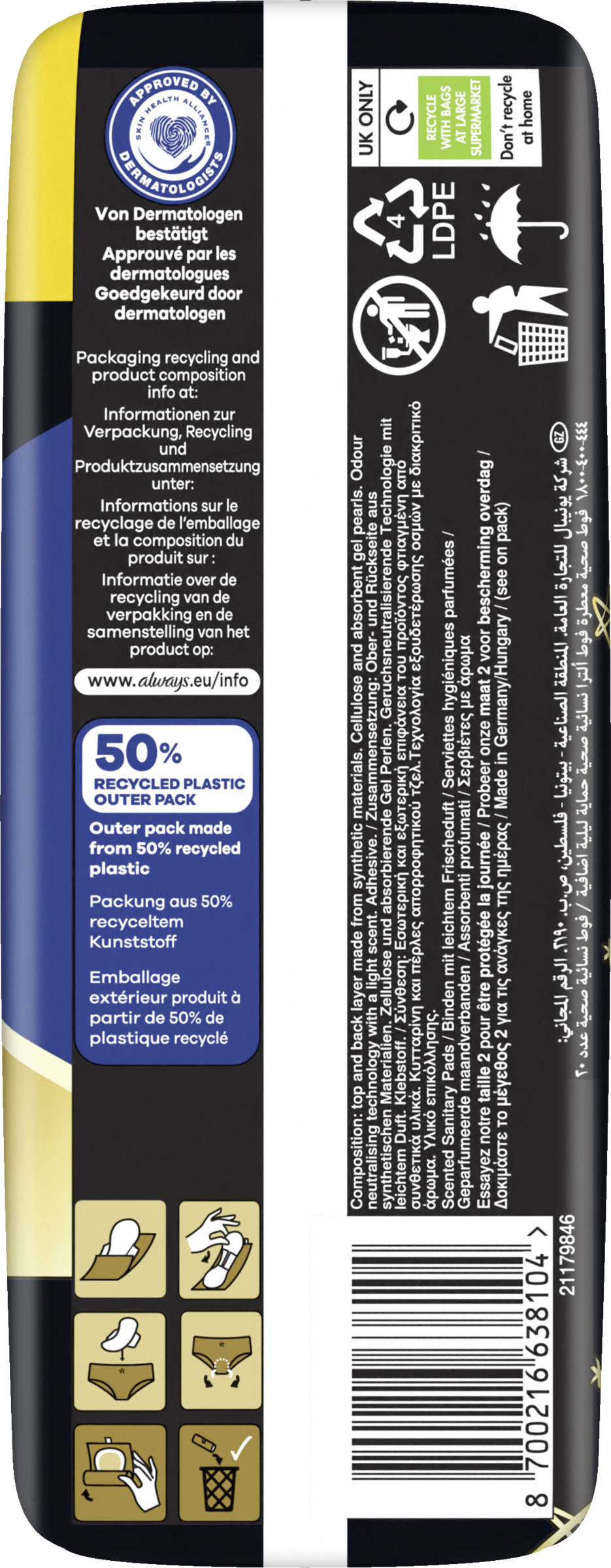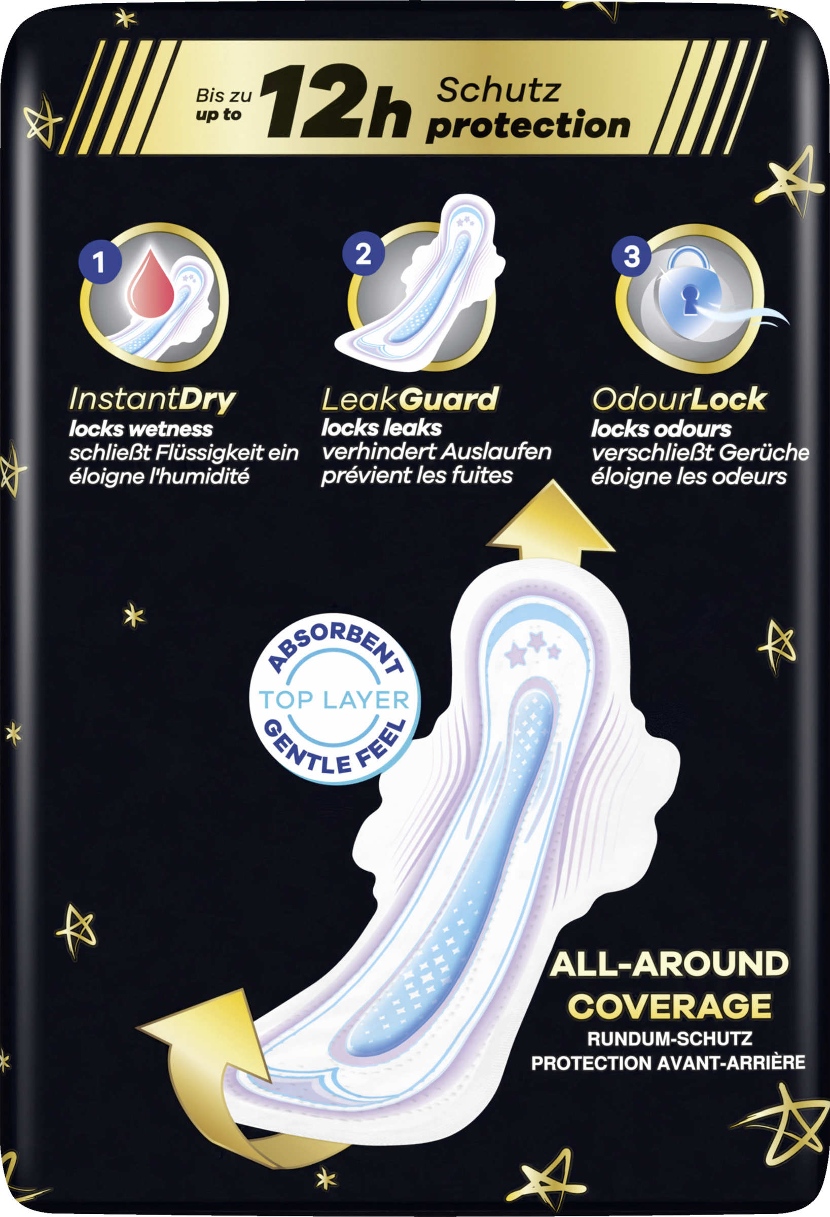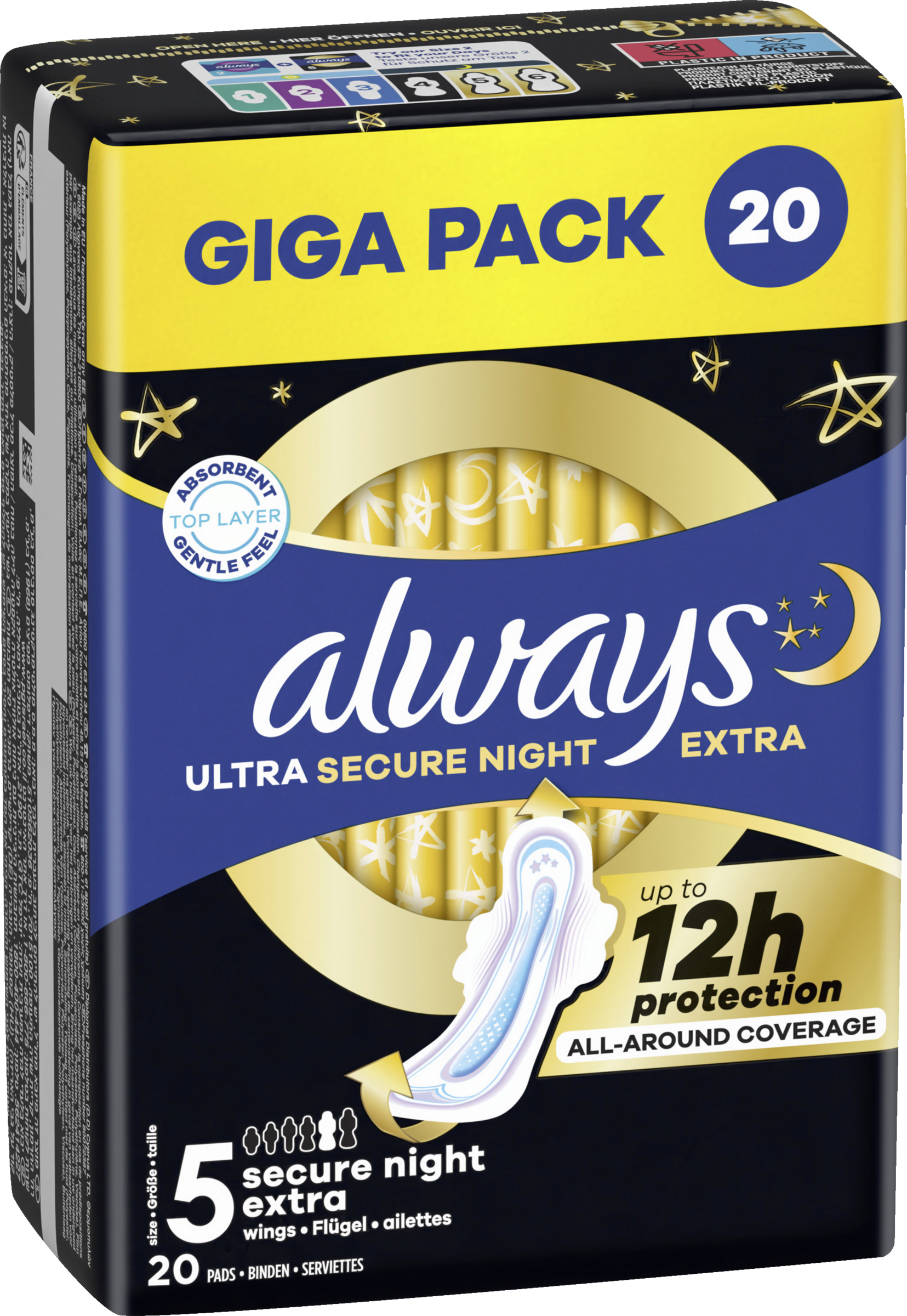 Gib dich nicht mit nicht weniger zufrieden als mit einem guten Schlaf mit bis zu 12 Std. Schutz: Always Ultra Secure Night Extra (Größe 5) Damenbinden mit Flügeln und saugstarker und weicher Oberfläche sind mit 3 Schutzfunktionen ausgestattet, damit du nicht mitten in der Nacht aufwachst, um das Auslaufen zu überprüfen oder deine Binde wechseln zu müssen. Eine um 9% größere Vorderseite und eine um 85% größere Rückseite (im Vergleich zu Always Ultra Normal Größe 1) in Kombination mit der LeakGuard-Technologie sorgen für Rumdum-Schutz, um Auslaufen während der Periodennächte zu vermeiden. Always Ultra Binden sind von der Skin Health Alliance dermatologisch bestätigt.