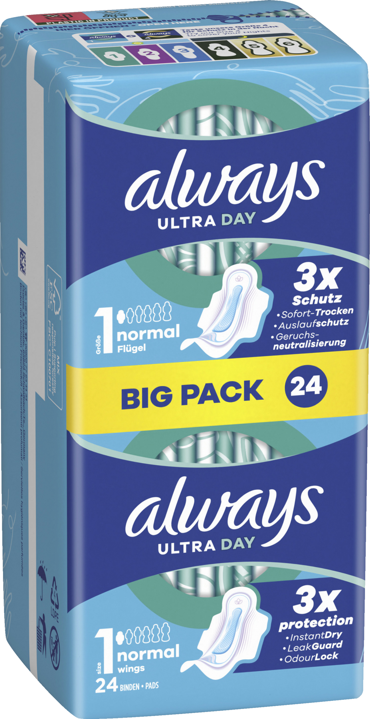 Gib dich nicht mit weniger als dem 3-fachen Schutz der Always Ultra Day Normal (Größe 1) Damenbinden zufrieden. Die Binden mit saugfähiger und weicher Oberfläche absorbieren Blut dank der InstantDry-Technologie in Sekundenschnelle. Die LeakGuard- und OdourLock-Technologien verhindern das Auslaufen von Flüssigkeit und neutralisieren Gerüche. Ihre einzigartigen ComfortLock-Flügel passen sich jeder Art von Unterwäsche an. Für zusätzlichen Schutz in der Nacht werden die Always Ultra Nacht Größen empfohlen. Always Ultra Binden sind von der Skin Health Alliance dermatologisch bestätigt.