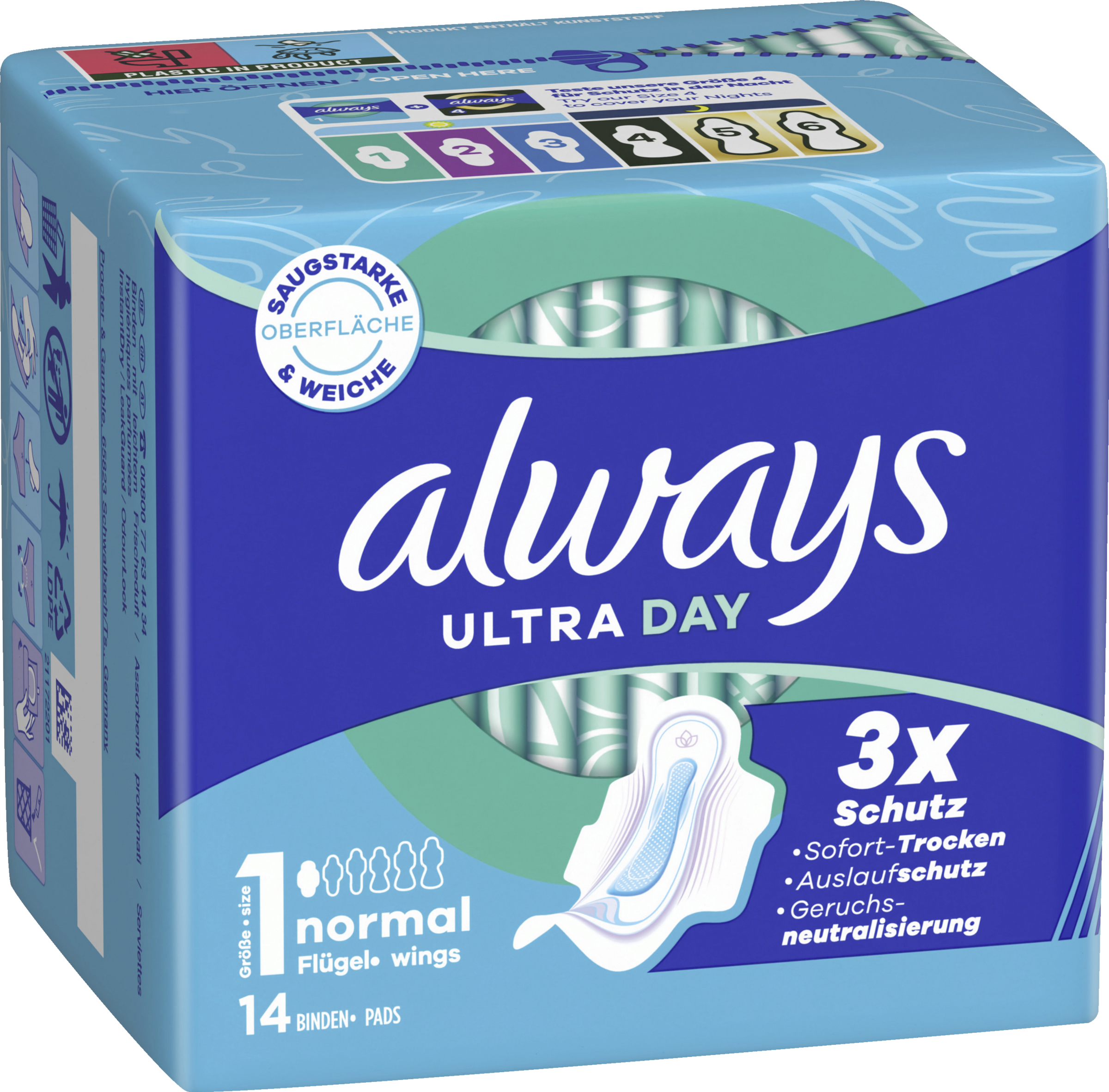 Gib dich nicht mit weniger als dem 3-fachen Schutz der Always Ultra Day Normal (Größe 1) Damenbinden zufrieden. Die Binden mit saugfähiger und weicher Oberfläche absorbieren Blut dank der InstantDry-Technologie in Sekundenschnelle. Die LeakGuard- und OdourLock-Technologien verhindern das Auslaufen von Flüssigkeit und neutralisieren Gerüche. Ihre einzigartigen ComfortLock-Flügel passen sich jeder Art von Unterwäsche an. Für zusätzlichen Schutz in der Nacht werden die Always Ultra Nacht Größen empfohlen. Always Ultra Binden sind von der Skin Health Alliance dermatologisch bestätigt.