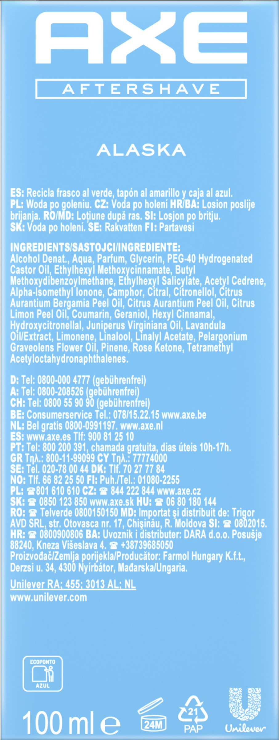 Die anregende Kombination aus Grapefruit und Bergamotte hält in jeder Situation frisch, Melone und Ananas bieten Balance, selbst bei Gratwanderungen. Der maskuline Bernstein-Sandelholz-Komplex stellt sich gelassen der Zähmung durch Jasmin und Lavendel. Ein paar Spritzer genügen. Die Haut fühlt sich wohl nach der Rasur, und der Träger fühlt sich wohl in seiner Haut. AXE Aftershave Alaska ist das vitalisierende Aftershave mit dem natürlichen Duft, der fokussiert, motiviert und an jedem Tag auf allen Wegen eine gute Dosis Abenteuer ins Spiel bringt.