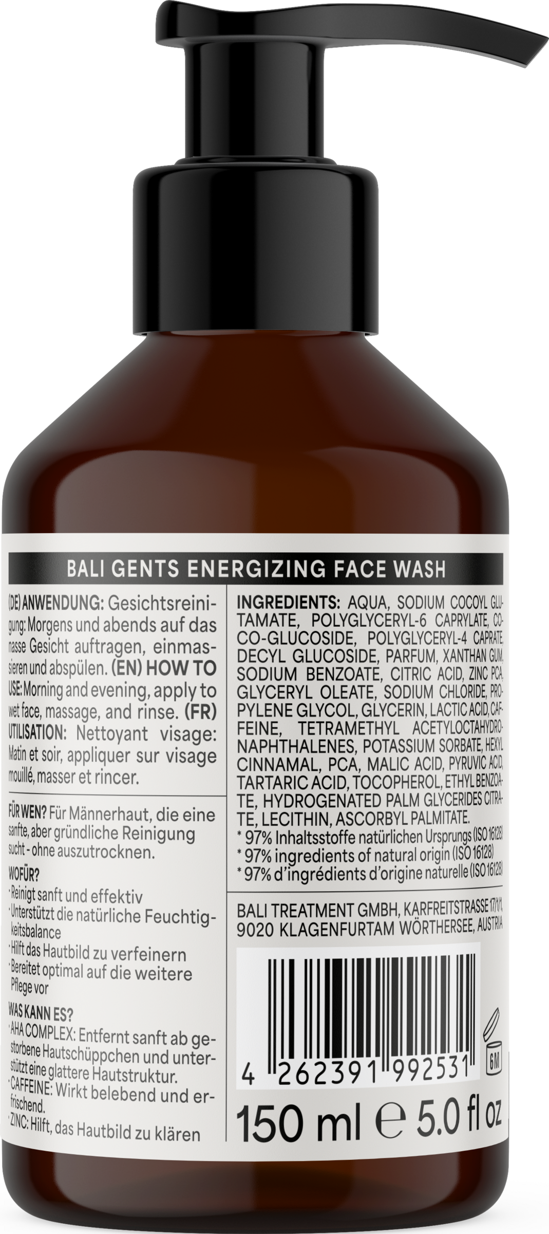AQUA, SODIUM COCOYL GLUTAMATE, POLYGLYCERYL-6 CAPRYLATE, COCO-GLUCOSIDE, POLYGLYCERYL-4 CAPRATE, DECYL GLUCOSIDE, PARFUM, XANTHAN GUM, SODIUM BENZOATE, CITRIC ACID, ZINC PCA, GLYCERYL OLEATE, SODIUM CHLORIDE, PROPYLENE GLYCOL, GLYCERIN, LACTIC ACID, CAFFEINE, TETRAMETHYL ACETYLOCTAHYDRONAPHTHALENES, POTASSIUM SORBATE, HEXYL CINNAMAL, PCA, MALIC ACID, PYRUVIC ACID, TARTARIC ACID, TOCOPHEROL, ETHYL BENZOATE, HYDROGENATED PALM GLYCERIDES CITRATE, LECITHIN, ASCORBYL PALMITATE. 97% Inhaltsstoffe natürlichen Ursprungs (ISO 16128)