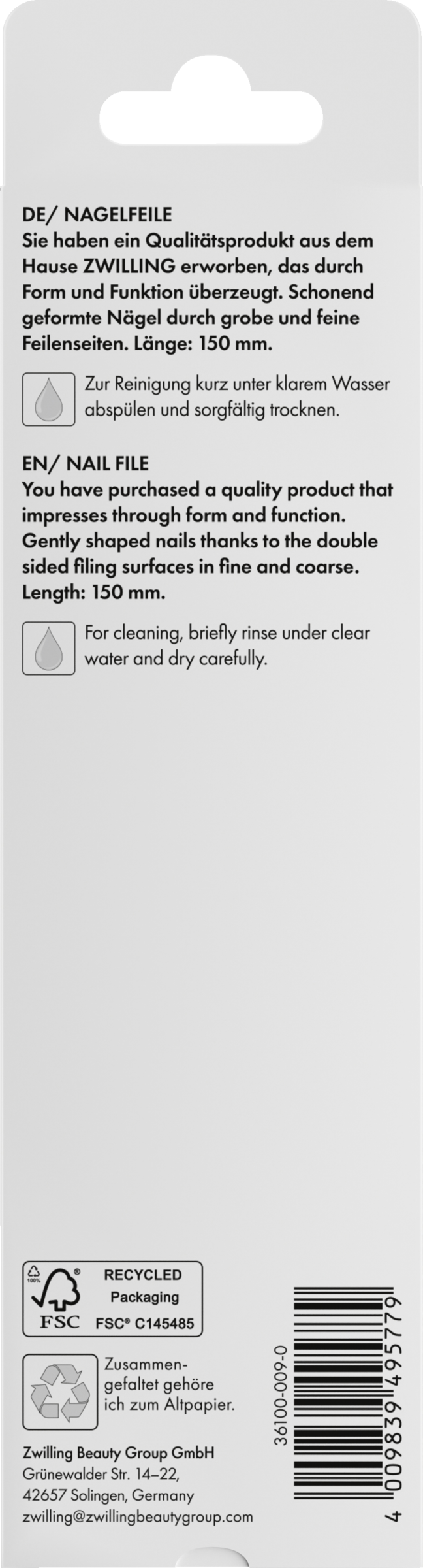 Dies ist ein Qualitätsprodukt aus dem Hause ZWILLING, das durch Form und Funktion überzeugt. Schonend geformte Nägel durch grobe und feine Feilenseiten.