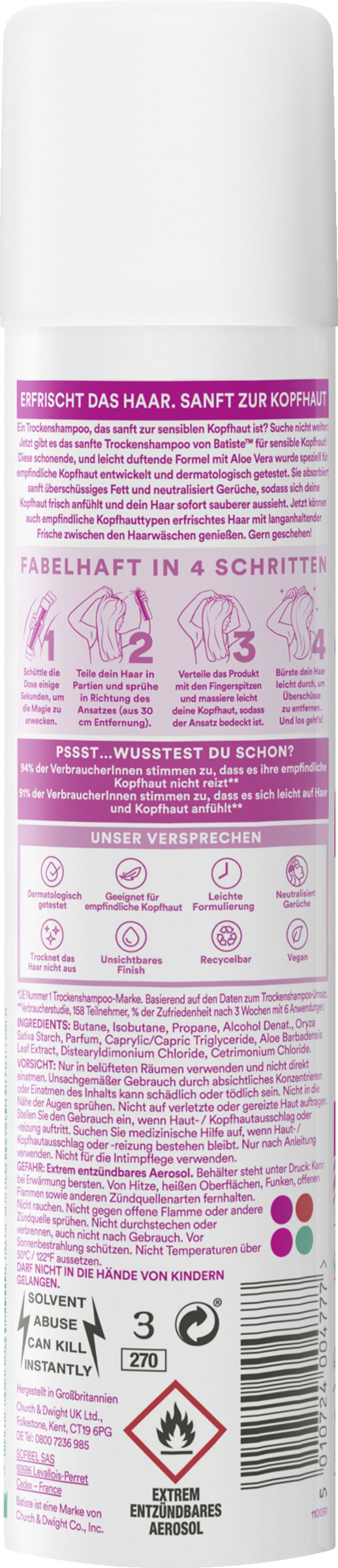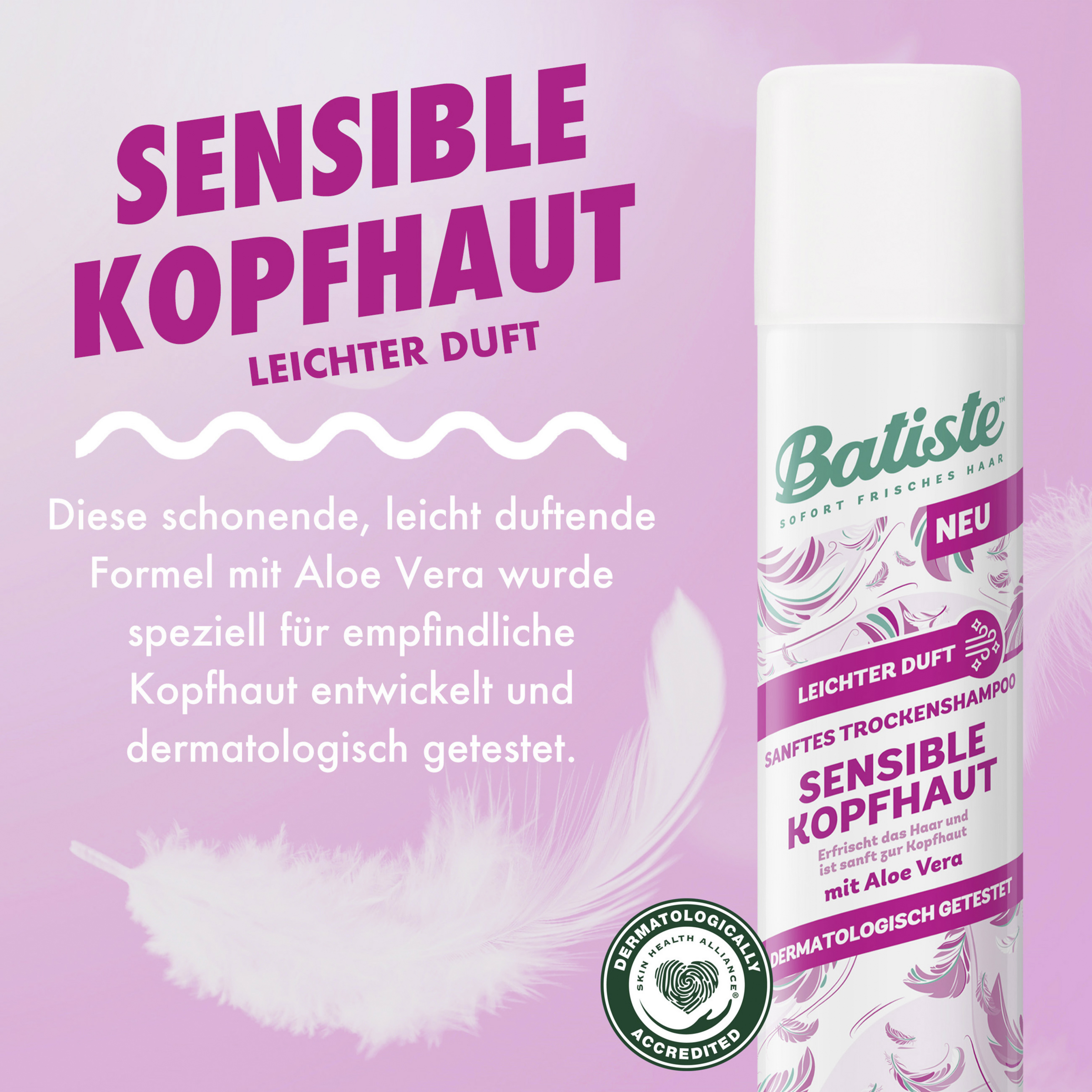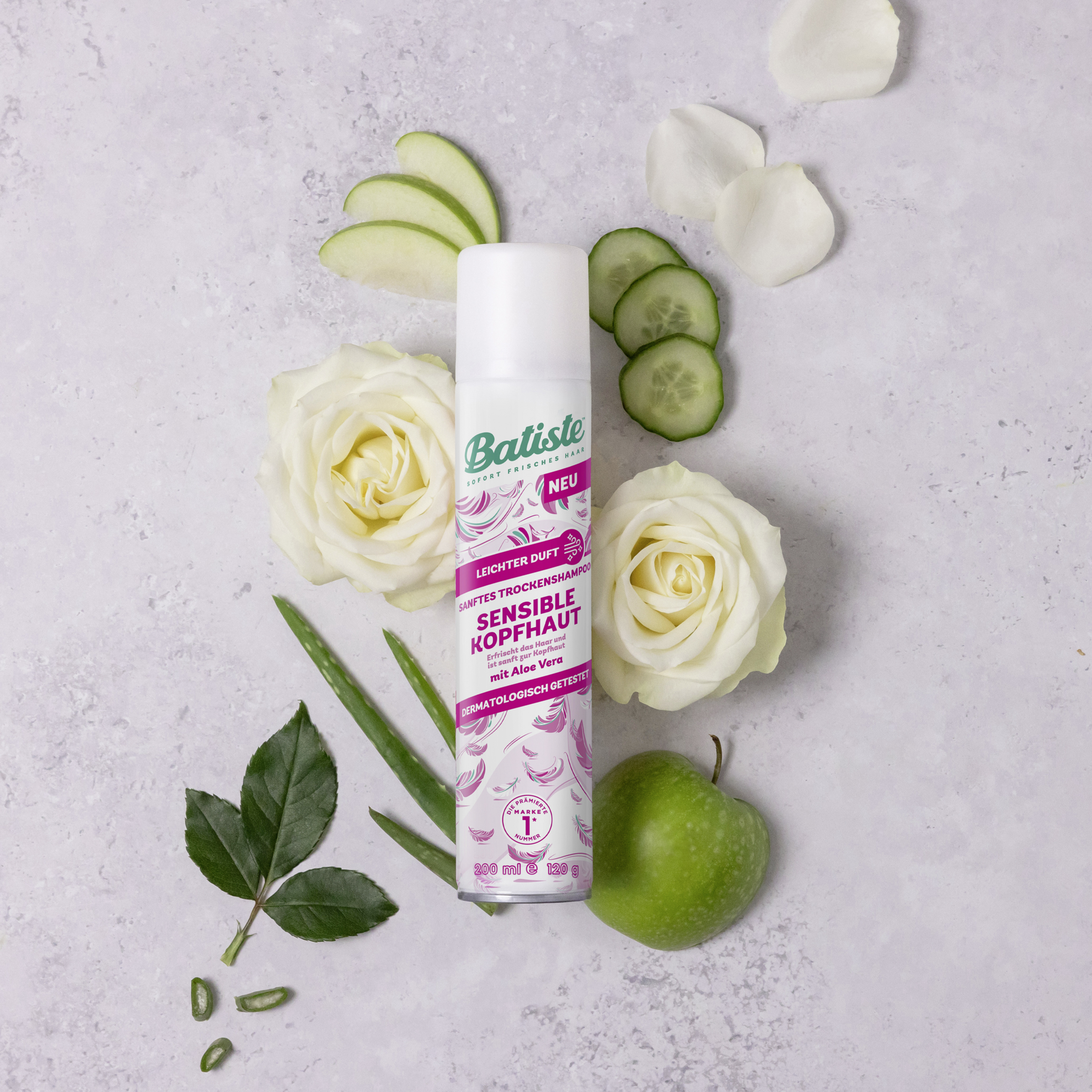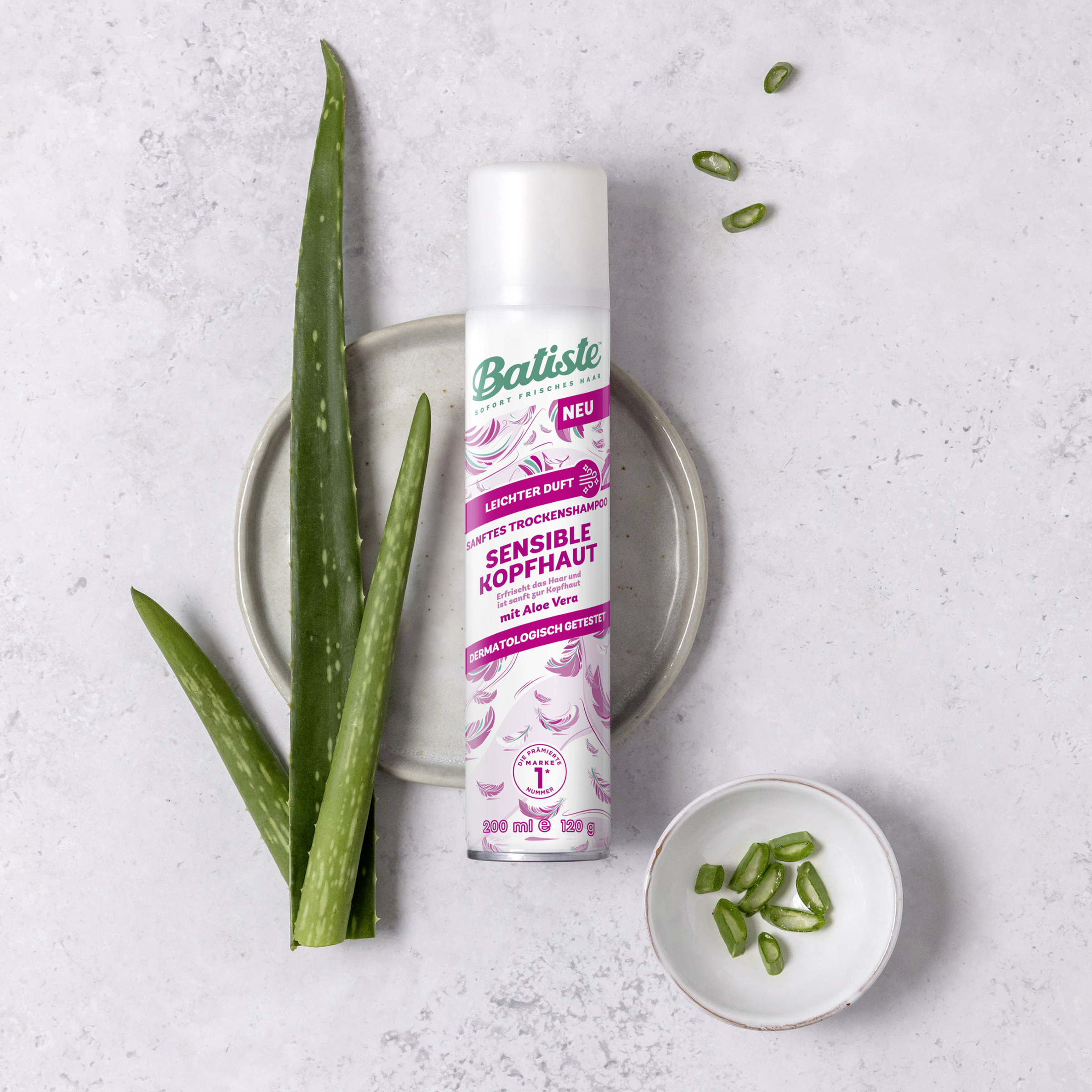 Erfrischt das Haar. Sanft zur Kopfhaut. Ein Trockenshampoo, das sanft zur sensiblen Kopfhaut ist? Suche nicht weiter: Jetzt gibt es das sanfte Trockenshampoo von Batiste für sensible Kopfhaut! Diese schonende, und leicht duftende Formel mit Aloe Vera wurde speziell für empfindliche Kopfhaut entwickelt und dermatologisch getestet. Sie absorbiert sanft überschüssiges Fett, sodass sich deine Kopfhaut frisch anfühlt und dein Haar sofort sauberer aussieht. Jetzt können auch empfindliche Kopfhauttypen erfrischtes Haar mit langanhaltender Frische zwischen den Haarwäschen genießen. Gern geschehen!