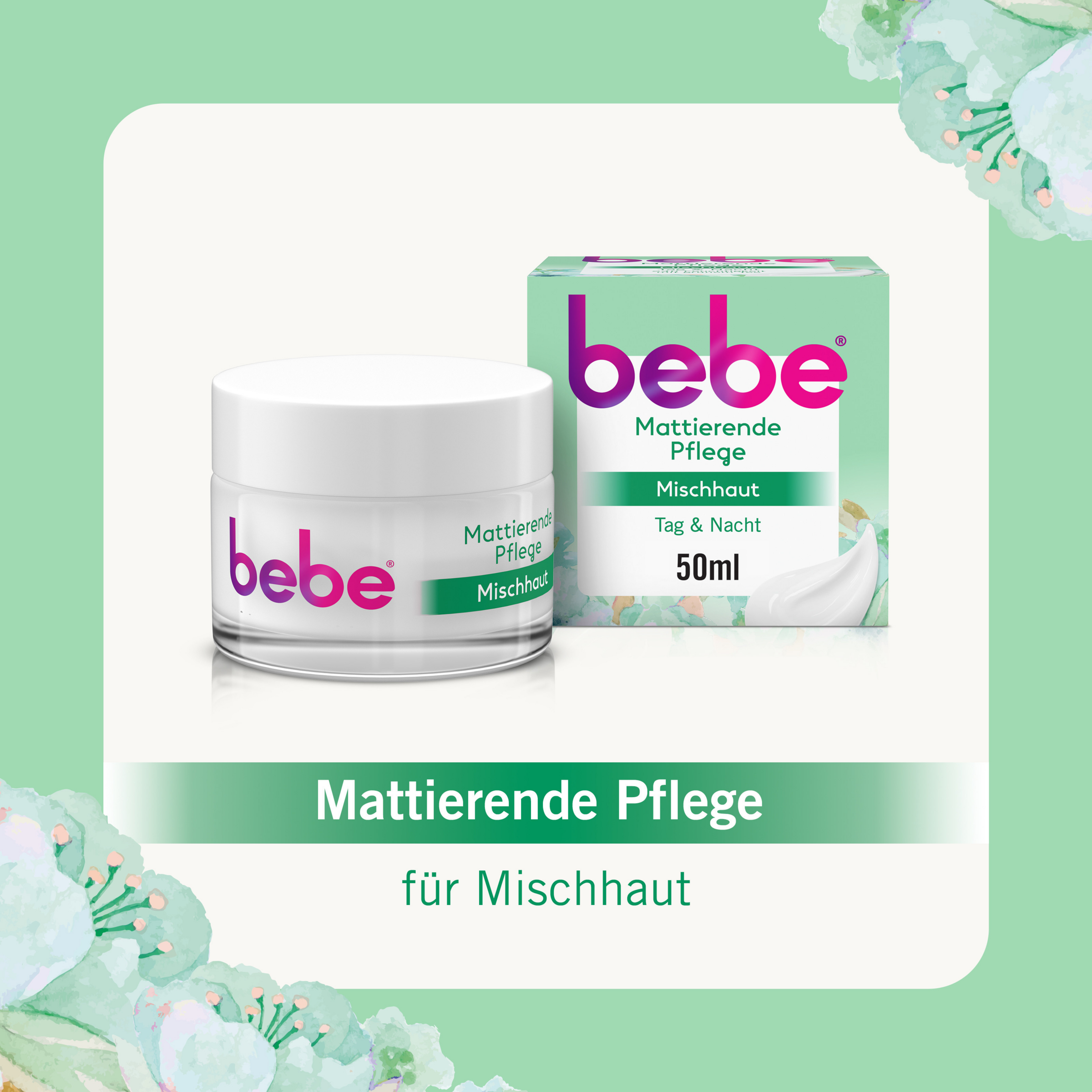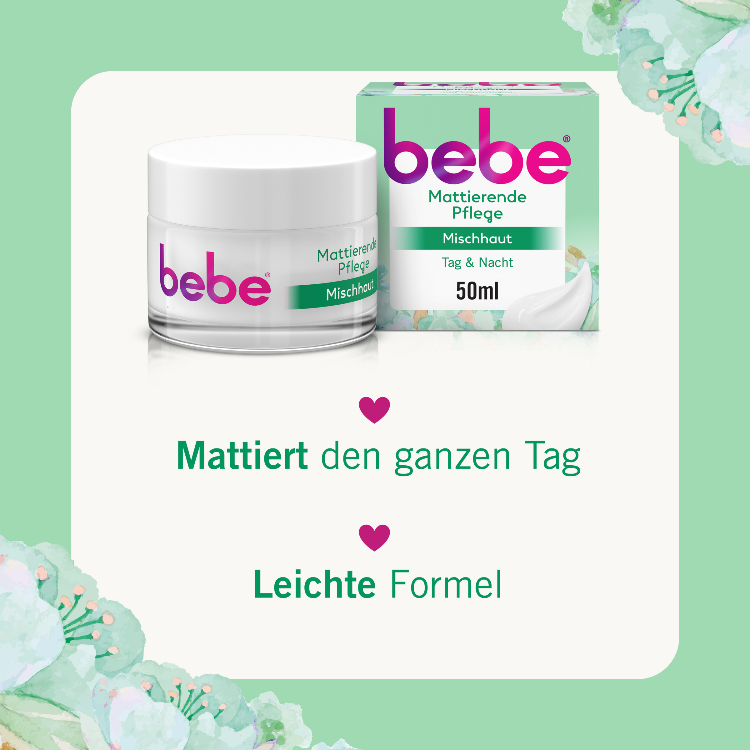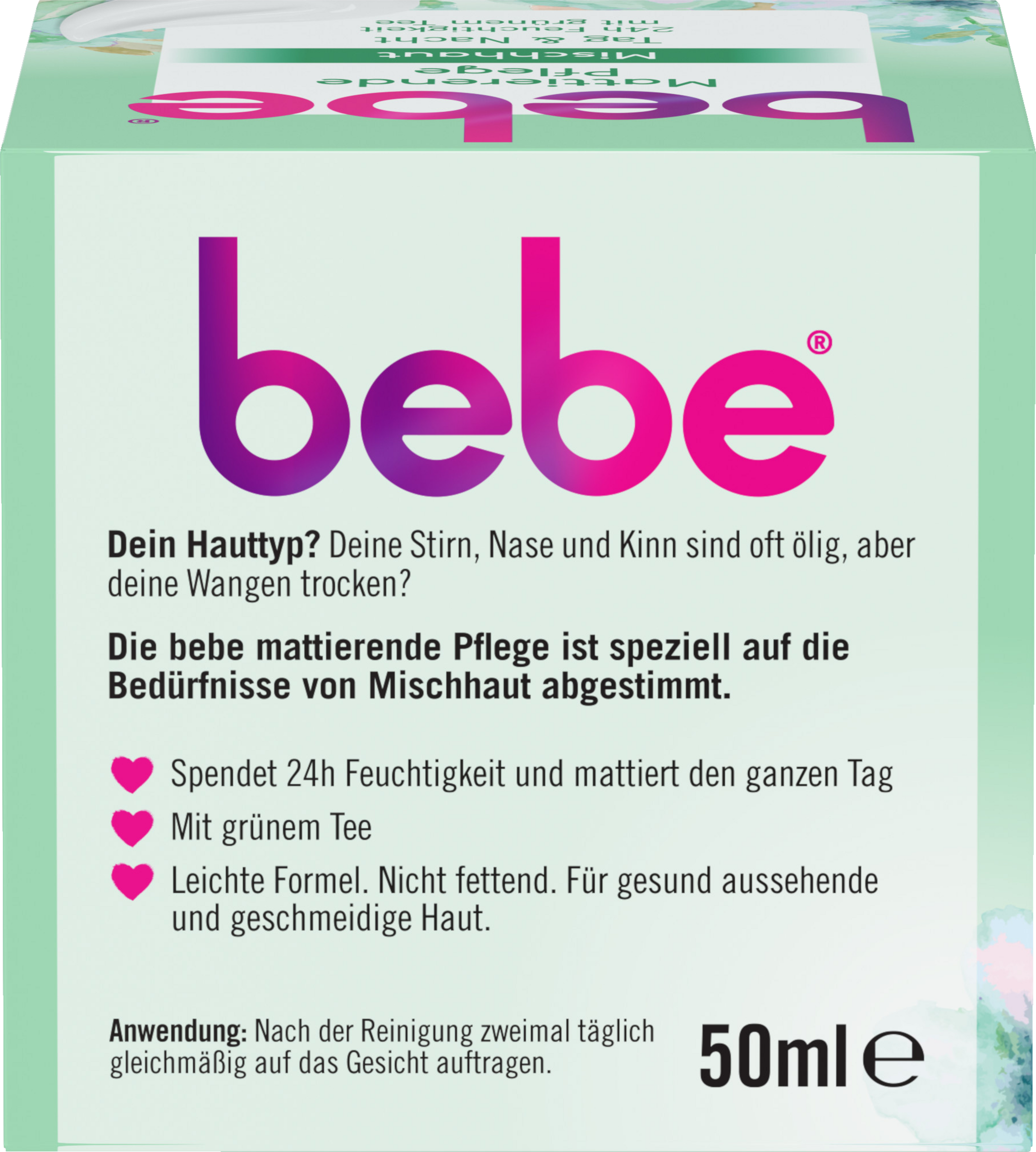 Die mattierende Gesichtscreme bietet dir die richtige ausgleichende Pflege: Sie mattiert und schenkt deiner Mischhaut wichtige Feuchtigkeit. Eine Feuchtigkeitspflege ist auch für deine Mischhaut wichtig, um sie schön und gesund aussehen zu lassen. Die Hautpflege Creme schenkt deiner Haut die 24h Feuchtigkeit und sorgt für eine wunderbar gesund aussehende Haut, zudemist die Hautverträglichkeit dermatologisch getestet. Das Ergebnis? 100% Du. bebe. be you. be true.