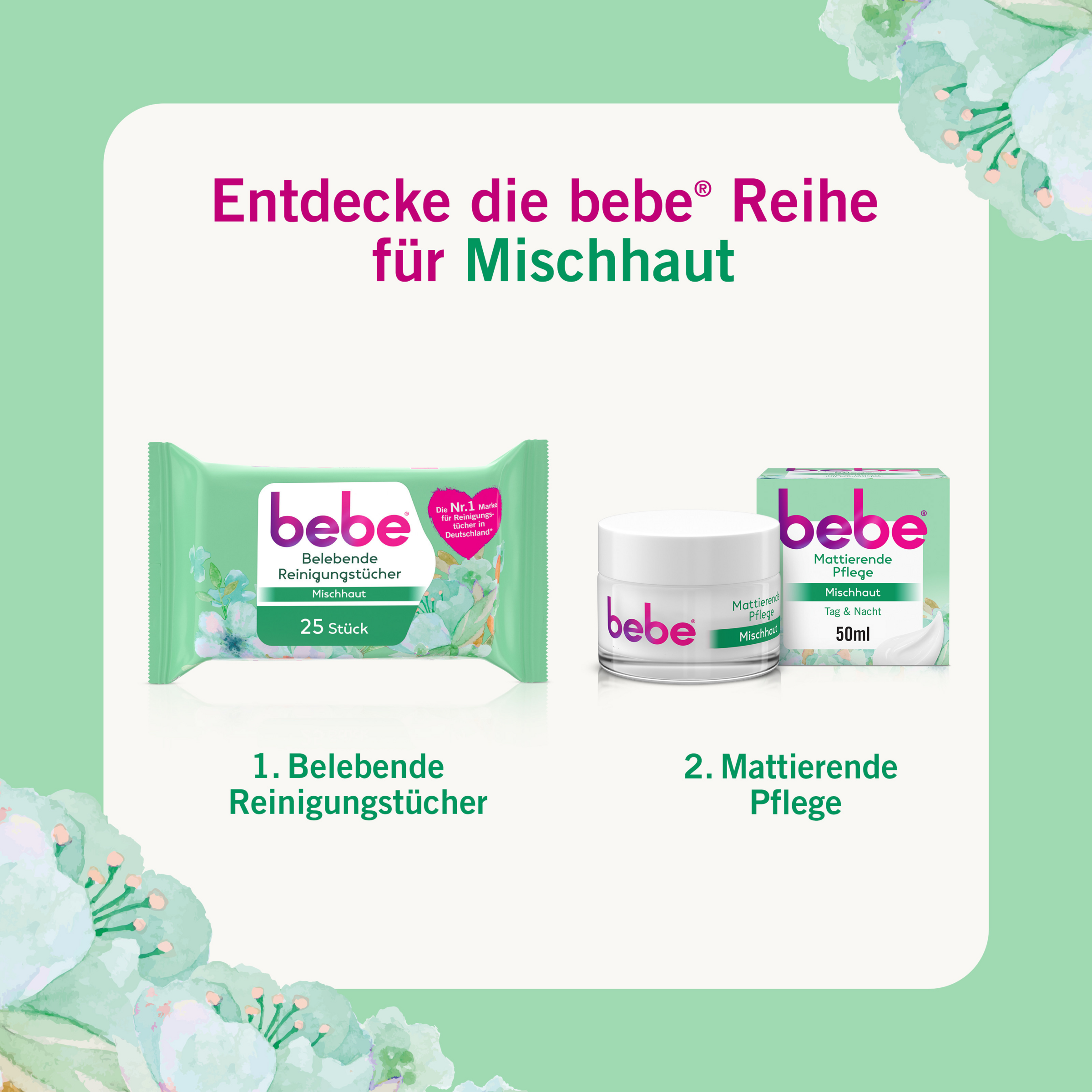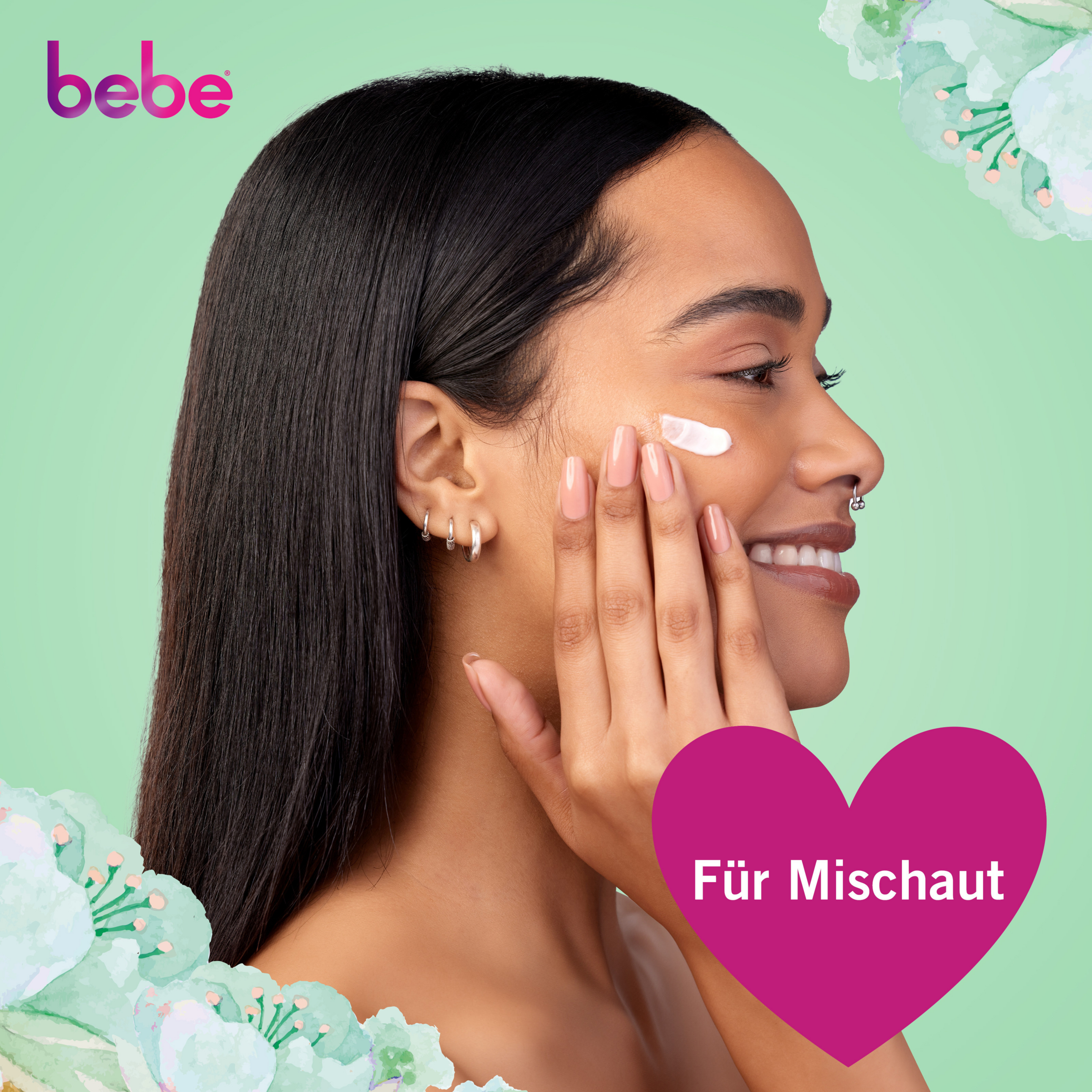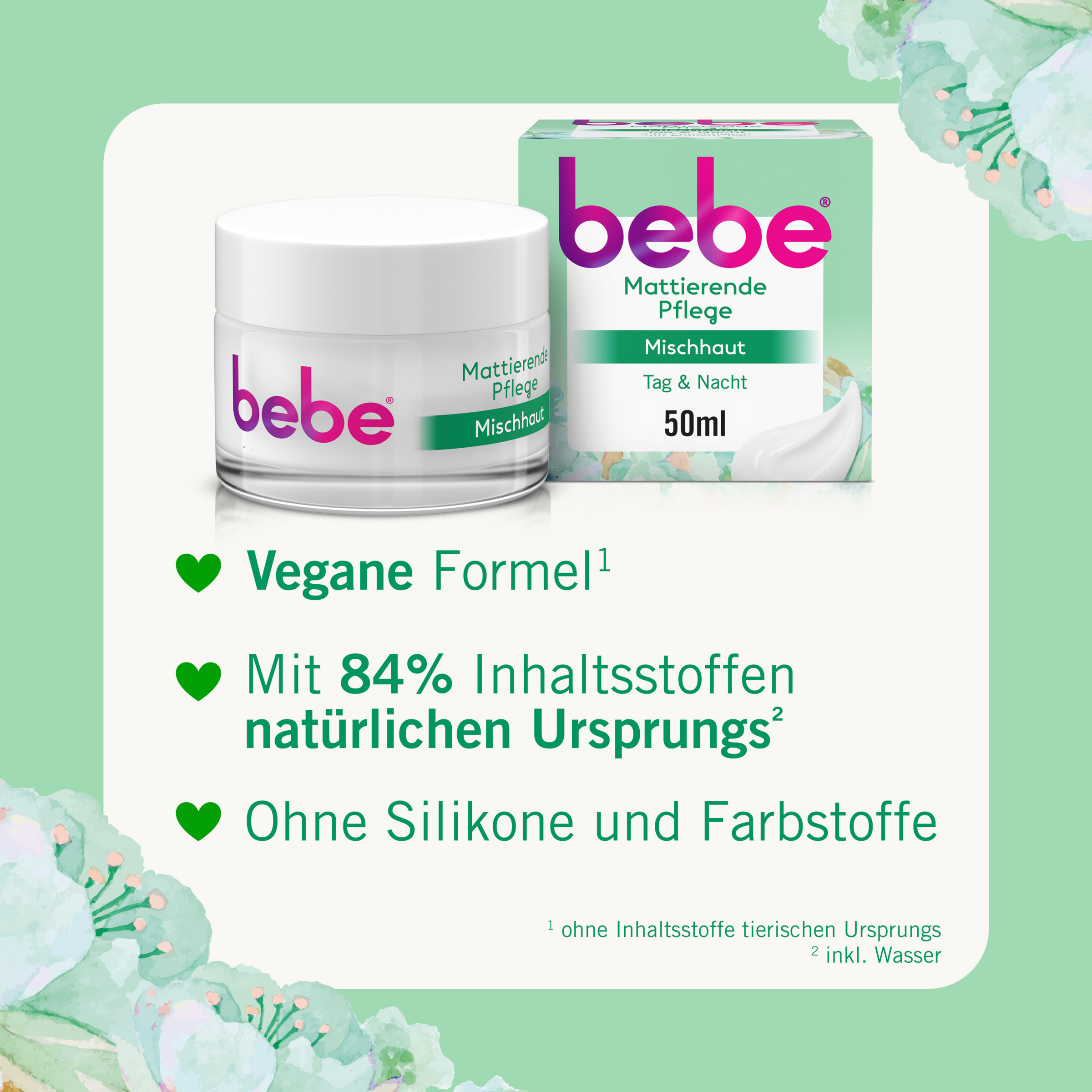 Die mattierende Gesichtscreme bietet dir die richtige ausgleichende Pflege: Sie mattiert und schenkt deiner Mischhaut wichtige Feuchtigkeit. Eine Feuchtigkeitspflege ist auch für deine Mischhaut wichtig, um sie schön und gesund aussehen zu lassen. Die Hautpflege Creme schenkt deiner Haut die 24h Feuchtigkeit und sorgt für eine wunderbar gesund aussehende Haut, zudemist die Hautverträglichkeit dermatologisch getestet. Das Ergebnis? 100% Du. bebe. be you. be true.