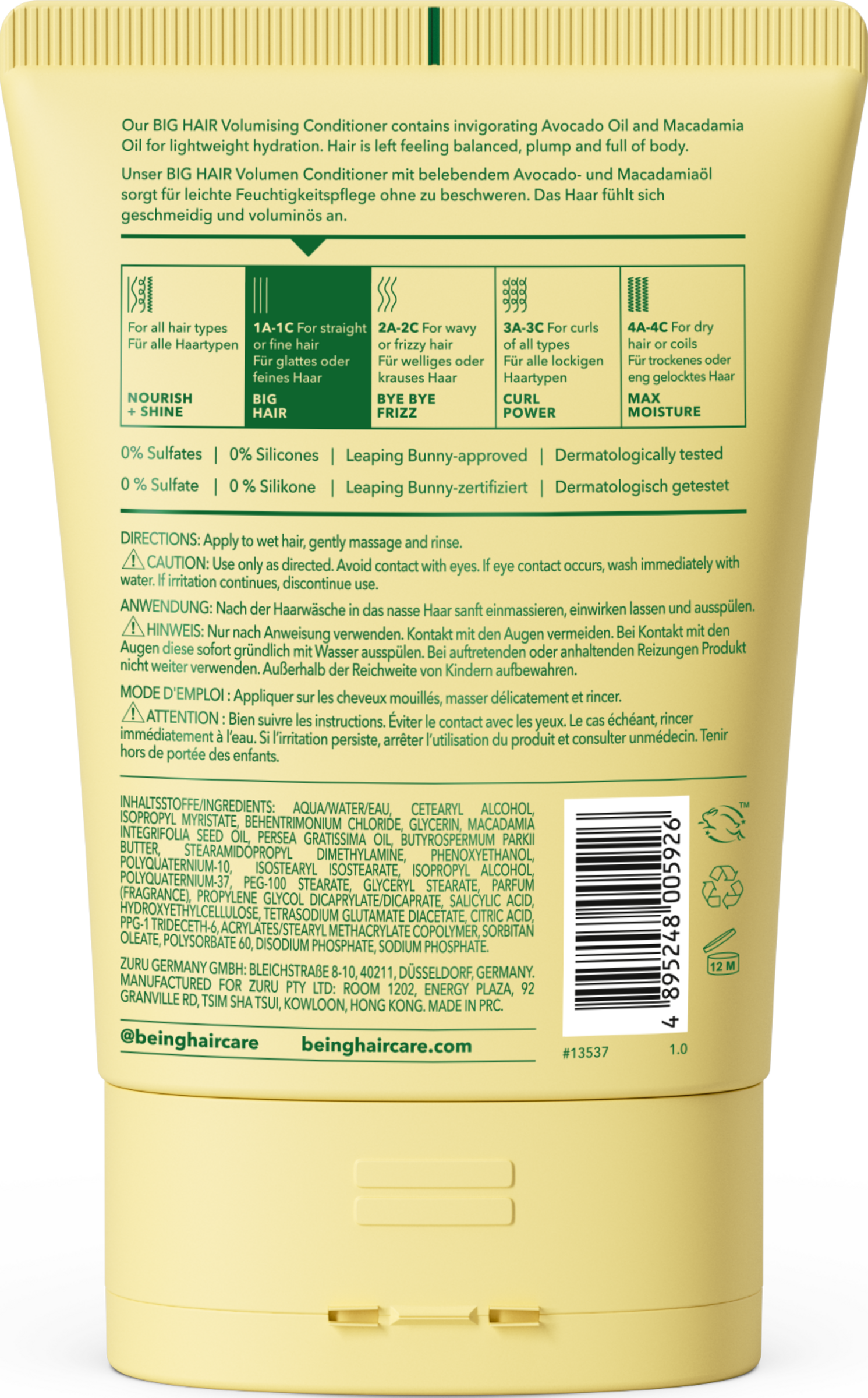 Der BIG HAIR Volumen Conditioner mit belebendem Avocado- und Macadamiaöl sorgt für leichte Feuchtigkeitspflege ohne zu beschweren. Das Haar fühlt sich geschmeidig und voluminös an.