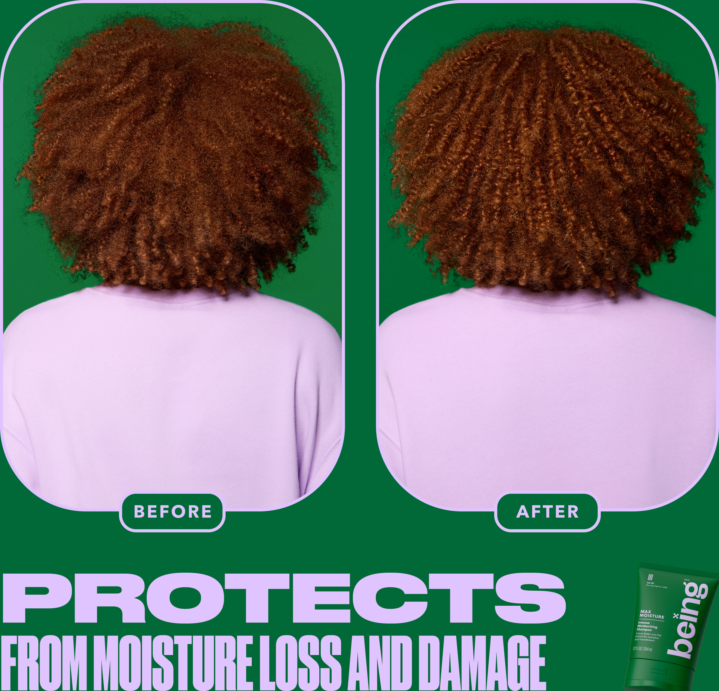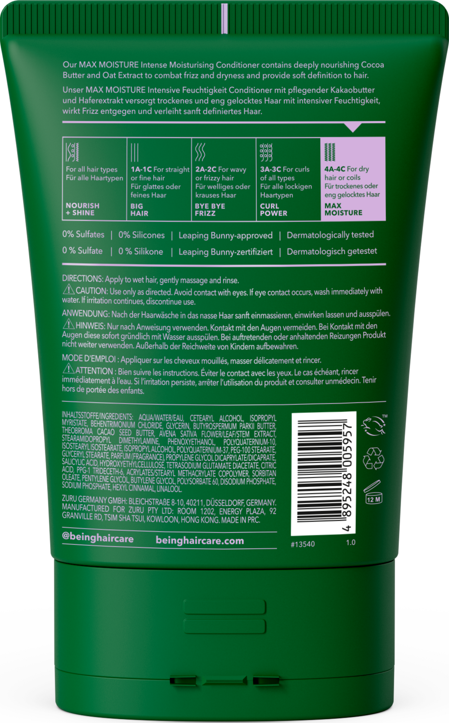 Unser MAX MOISTURE Intensive Feuchtigkeit Conditioner mit pflegender Kakaobutter und Haferextrakt versorgt trockenes und eng gelocktes Haar mit intensiver Feuchtigkeit, wirkt Frizz entgegen und verleiht sanft definiertes Haar.