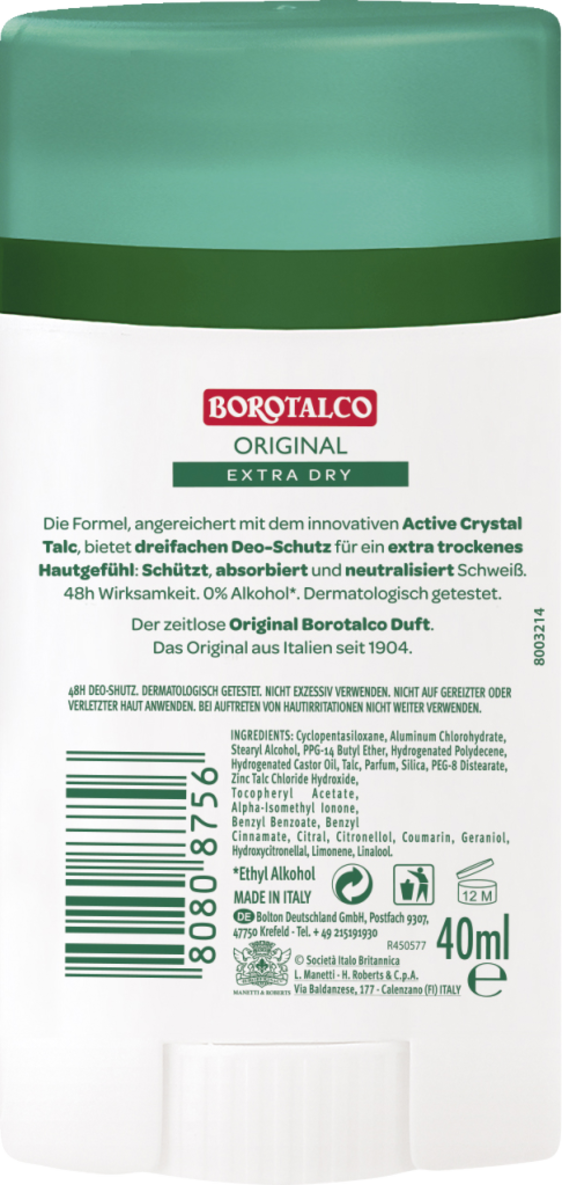 Die Formel, angereichert mit dem innovativen Active Crystal Talc, bietet dreifachen Deo-Schutz für ein extra trockenes Hautgefühl: Schützt, absorbiert und neutralisiert Schweiß. Der zeitlose Original Borotalco Duft. Das Original aus Italien seit 1904.