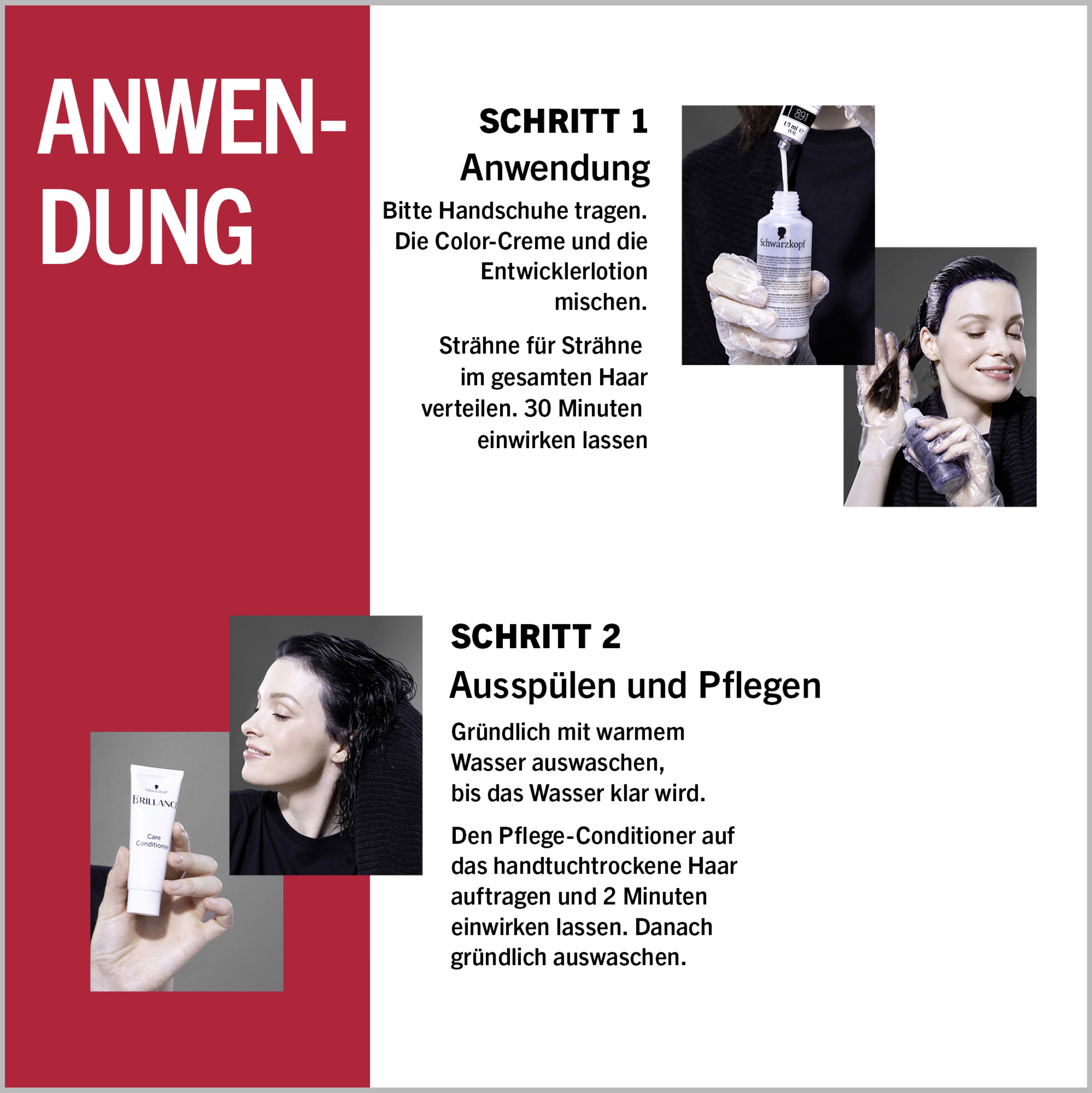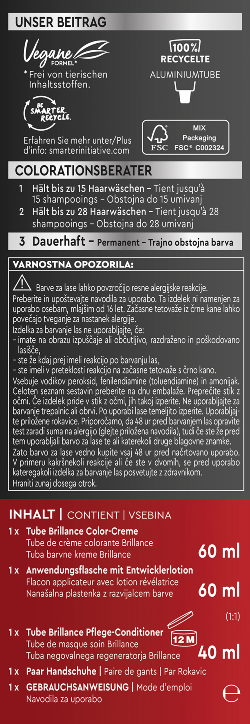 enthält: 1x Tube BRILLANCE Color-Creme 60ml 1x Anwendungsflasche mit Entwicklerlotion 60ml 1x Tube BRILLANCE Pflege-Conditioner 40ml 1x Paar Handschuhe 1x Gebrauchsanweisung