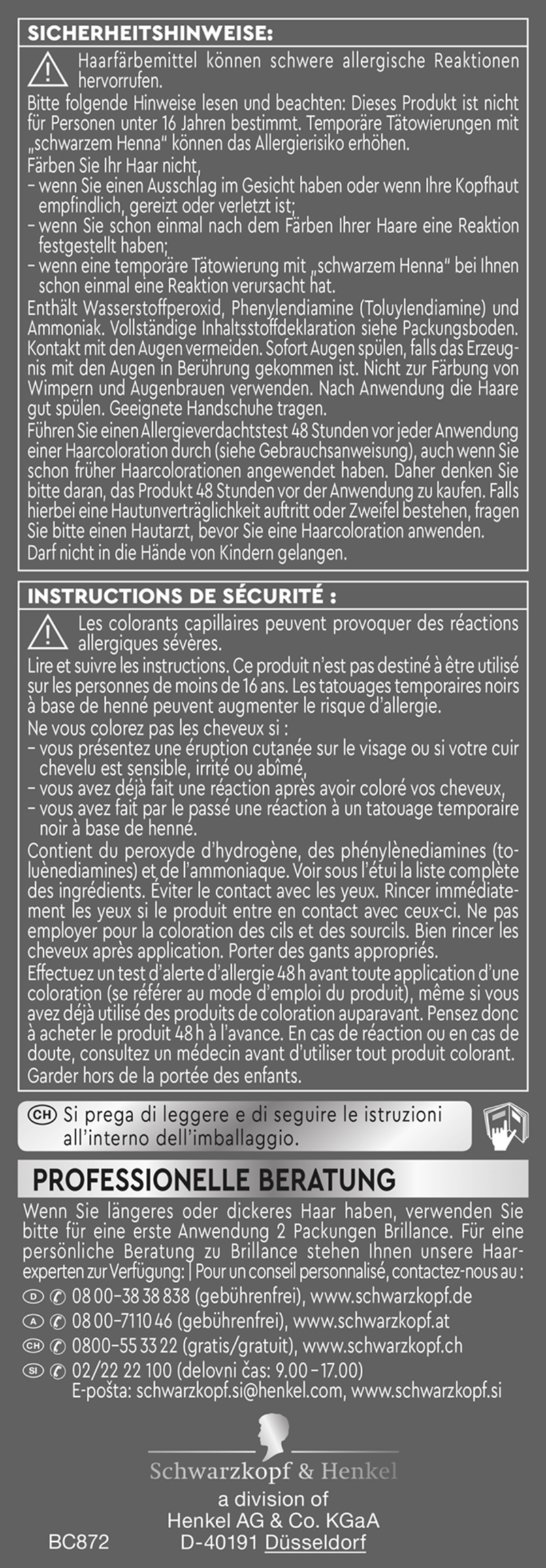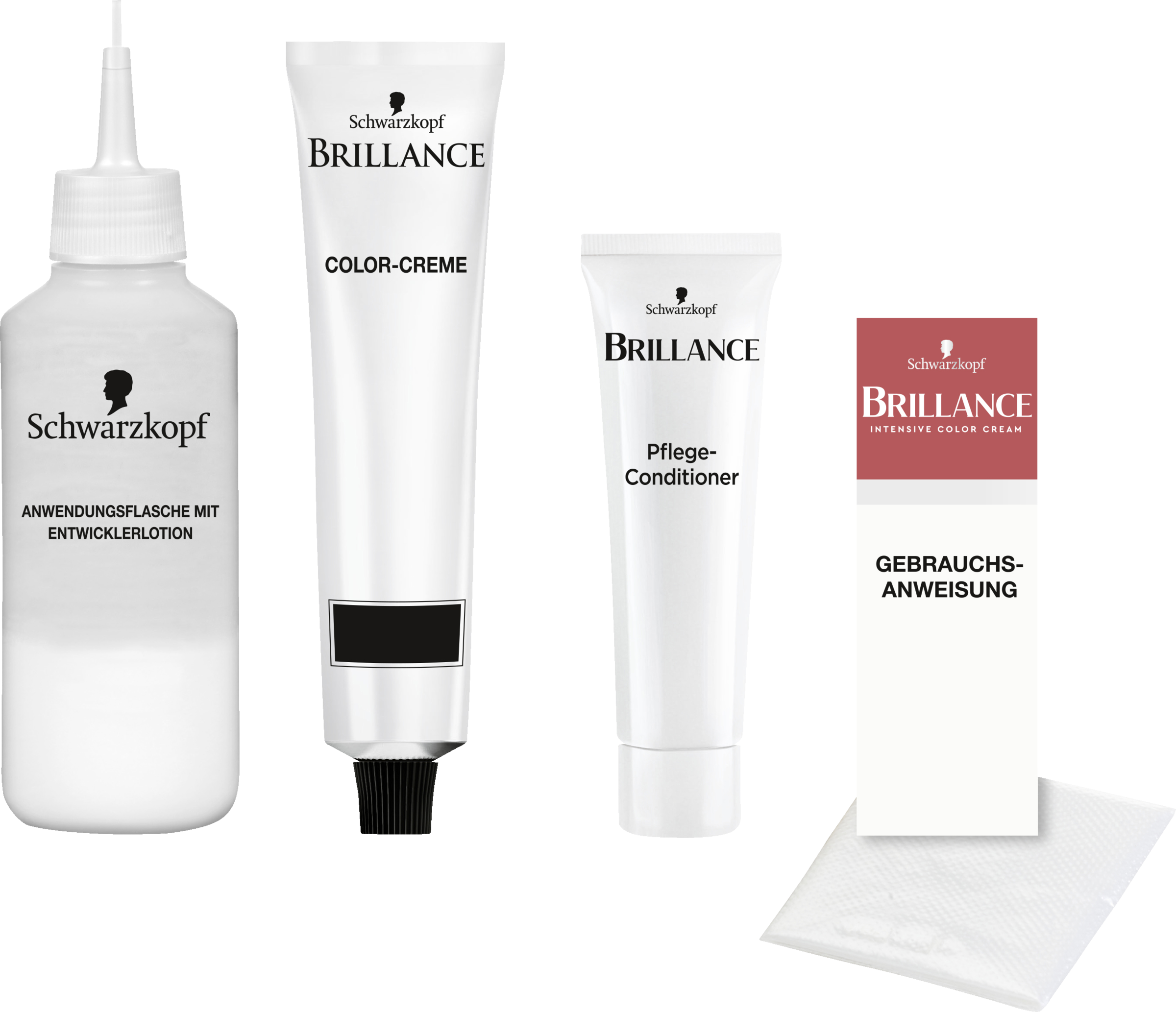 Setzen Sie ihr Haarfarben-Statement mit BRILLANCE. Dank der Schwarzkopf Farbexpertise bietet Ihnen BRILLANCE einzigartig intensive Haarfarben in professioneller Qualität für zuhause. Die BRILLANCE Coloration pflegt Ihr Haar mit Diamant-Glanz-Nachbehandlung. Bis zu 10 Wochen Farbintensität. Unwiderstehliche Leuchtkraft & atemberaubender Glanz. 100% Grauabdeckung, permanente Coloration.