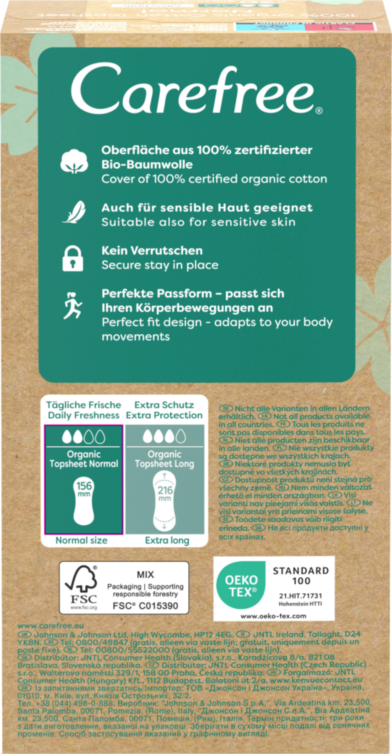 Bio-Baumwolle: Die Carefree 100% Organic Cotton Topsheet Normal Slipeinlagen haben eine dermatologisch getestete Oberfläche aus 100% zertifizierter Bio-Baumwolle. Sie sind 100% atmungsaktiv und sorgen für ein natürliches, frisches Gefühl. Die Slipeinlagen sind parfümfrei, enthalten 0% Farbstoffe & elementare Chlorbleiche und sind auch für sensible Haut geeignet. Ihre perfekte Passform passt sich deinen Körperbewegungen an, ohne zu Verrutschen.