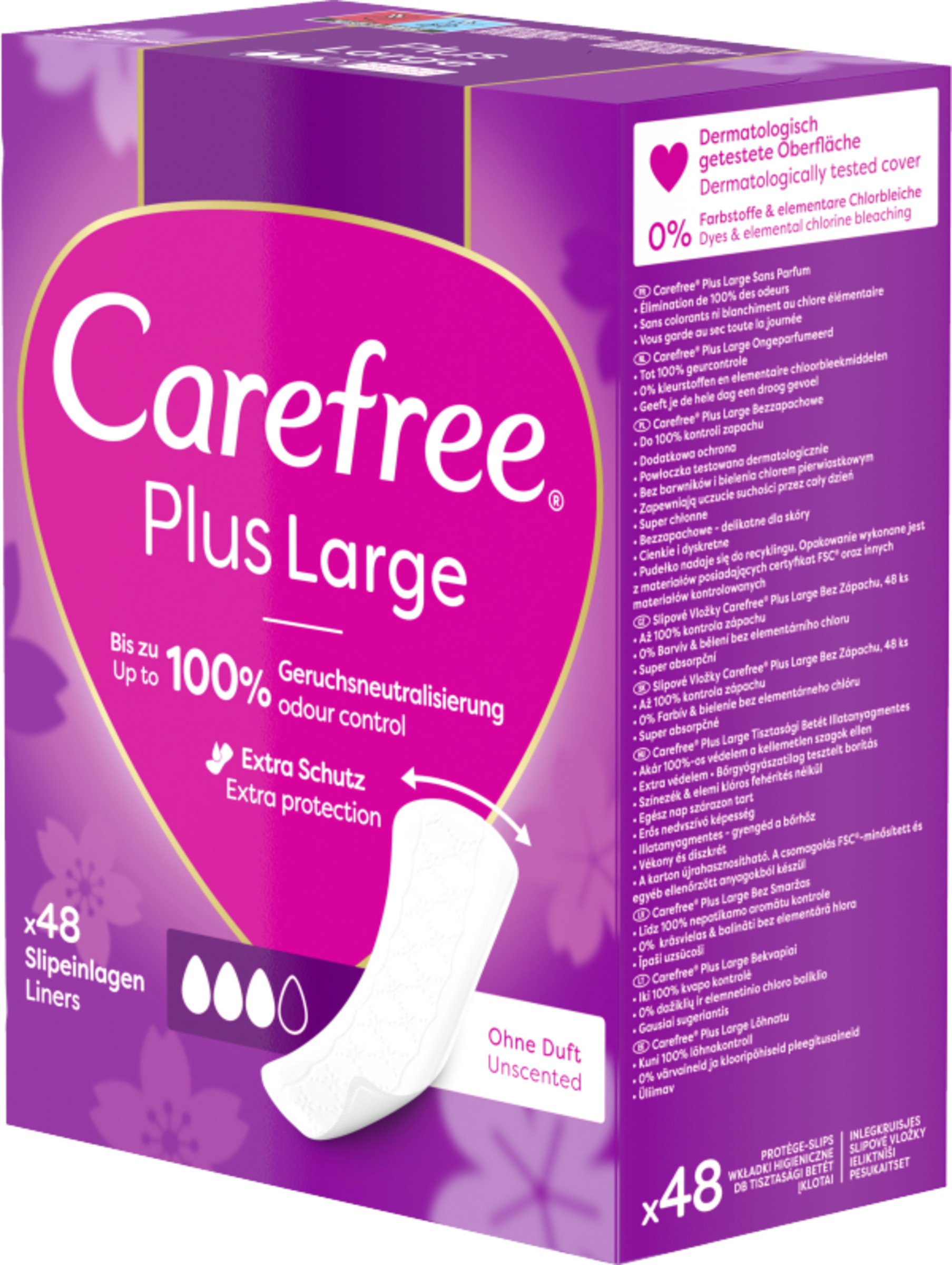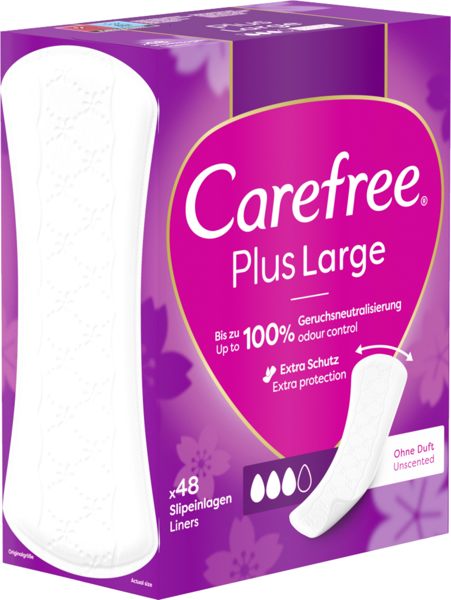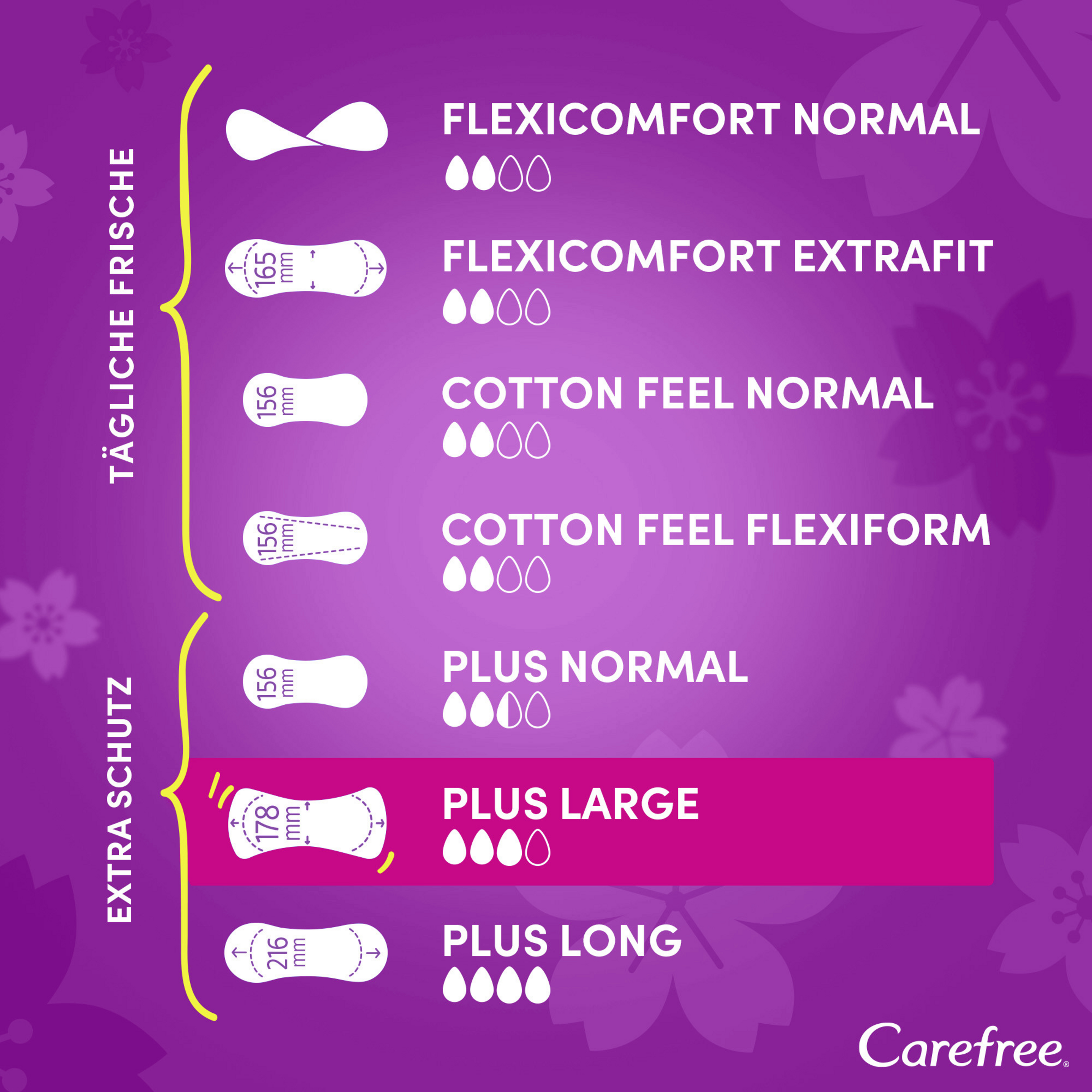 Neuer Slipeinlagenkern und neues Design: Breiter und länger als Carefree Cotton Feel Slipeinlagen für extra Schutz. Die extra breiten und langen Carefree Plus Large Slipeinlagen mit leichtem Duft haben einen super saugstarken Kern der hilft, Flüssigkeiten sofort einzuschließen, selbst Gerüche werden bis zu 12 Stunden lang kontrolliert. Die Soft Touch Oberfläche bietet besonders weichen Tragekomfort. Die Carefree Slipeinlagen sind in verschiedenen Designs erhältlich, ob parfümfrei oder mit frischem Duft, lang oder kurz – unter den Slipeinlagen von Carefree ist für jeden etwas Passendes dabei.