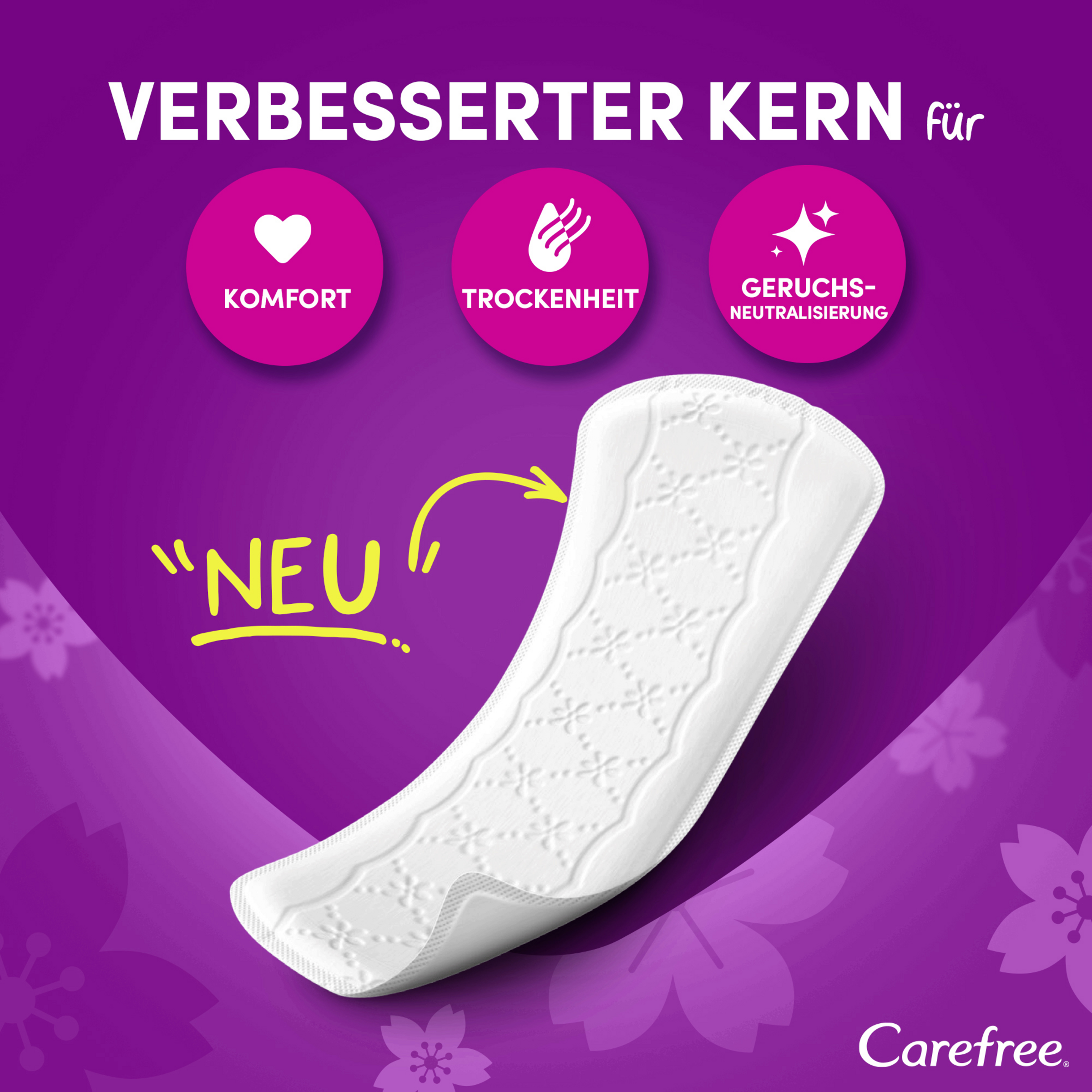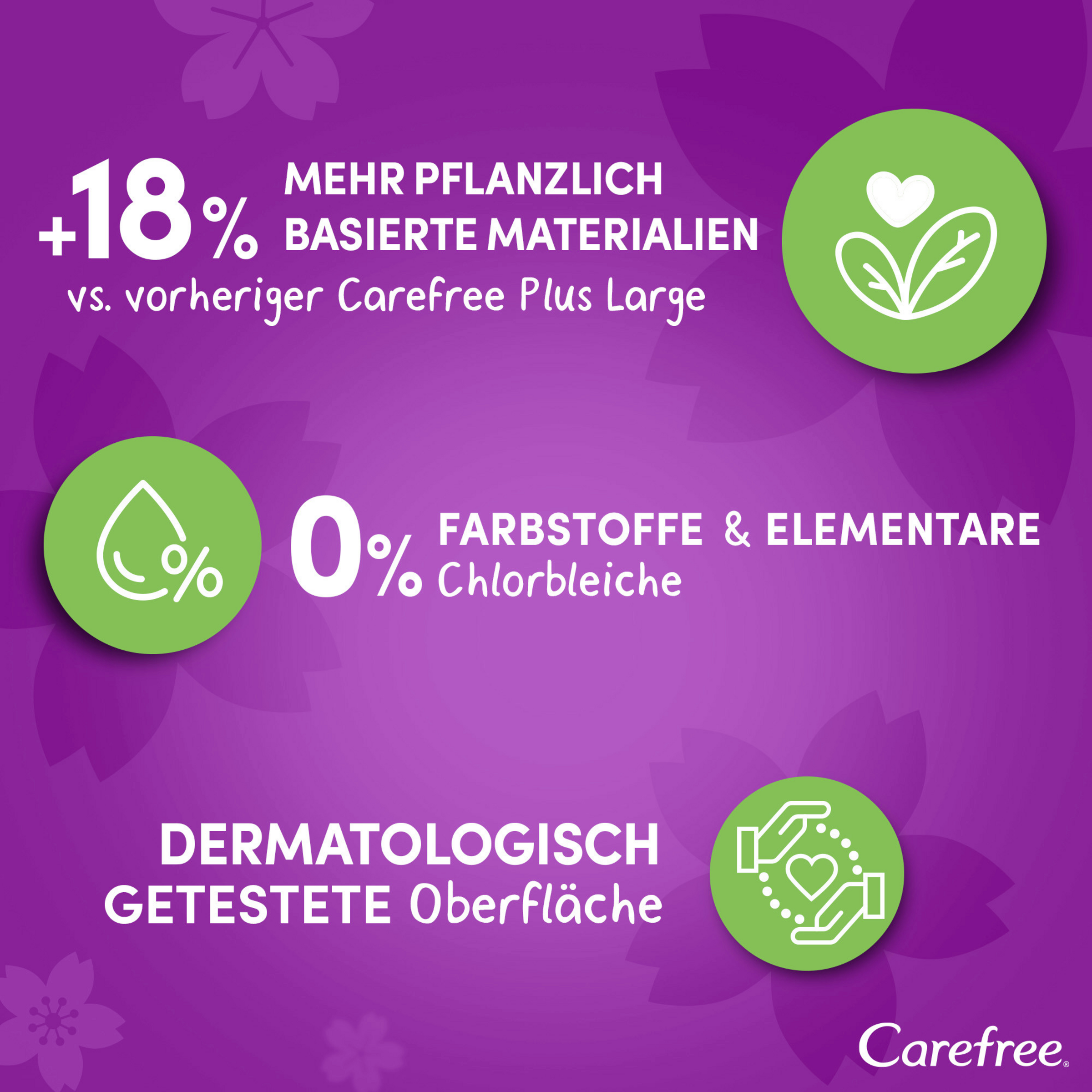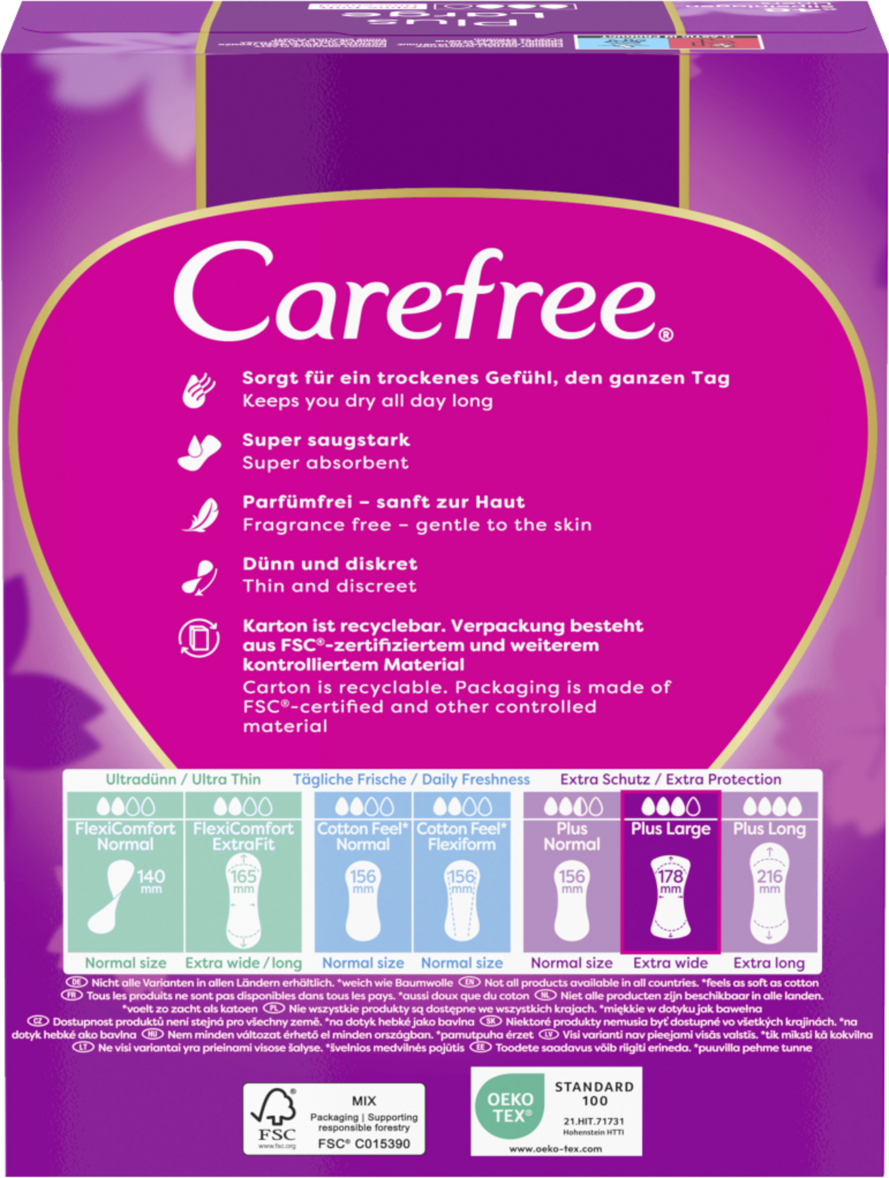 Neuer Slipeinlagenkern und neues Design: Breiter und länger als Carefree Cotton Feel Slipeinlagen für extra Schutz. Die extra breiten und langen Carefree Plus Large Slipeinlagen mit leichtem Duft haben einen super saugstarken Kern der hilft, Flüssigkeiten sofort einzuschließen, selbst Gerüche werden bis zu 12 Stunden lang kontrolliert. Die Soft Touch Oberfläche bietet besonders weichen Tragekomfort. Die Carefree Slipeinlagen sind in verschiedenen Designs erhältlich, ob parfümfrei oder mit frischem Duft, lang oder kurz – unter den Slipeinlagen von Carefree ist für jeden etwas Passendes dabei.