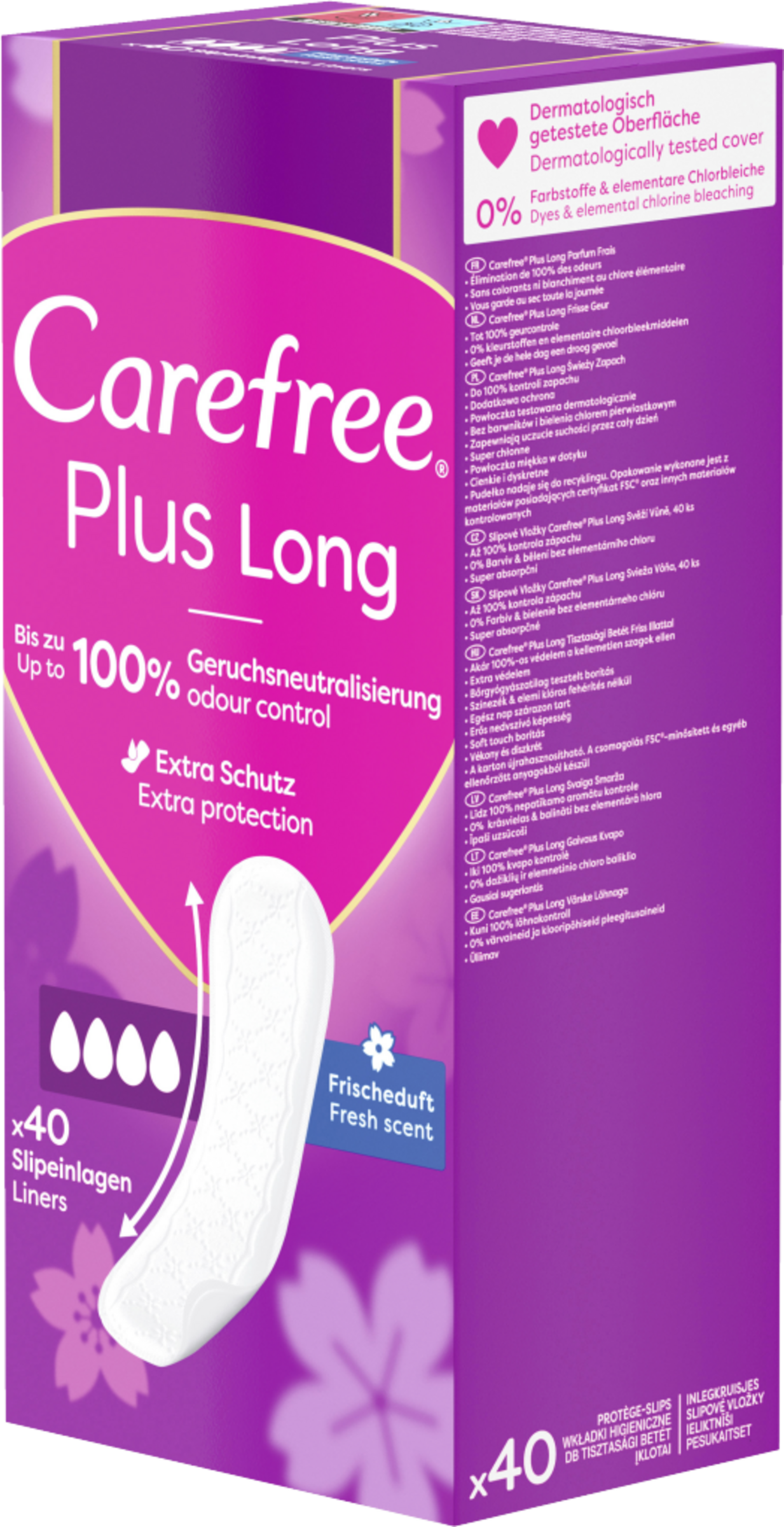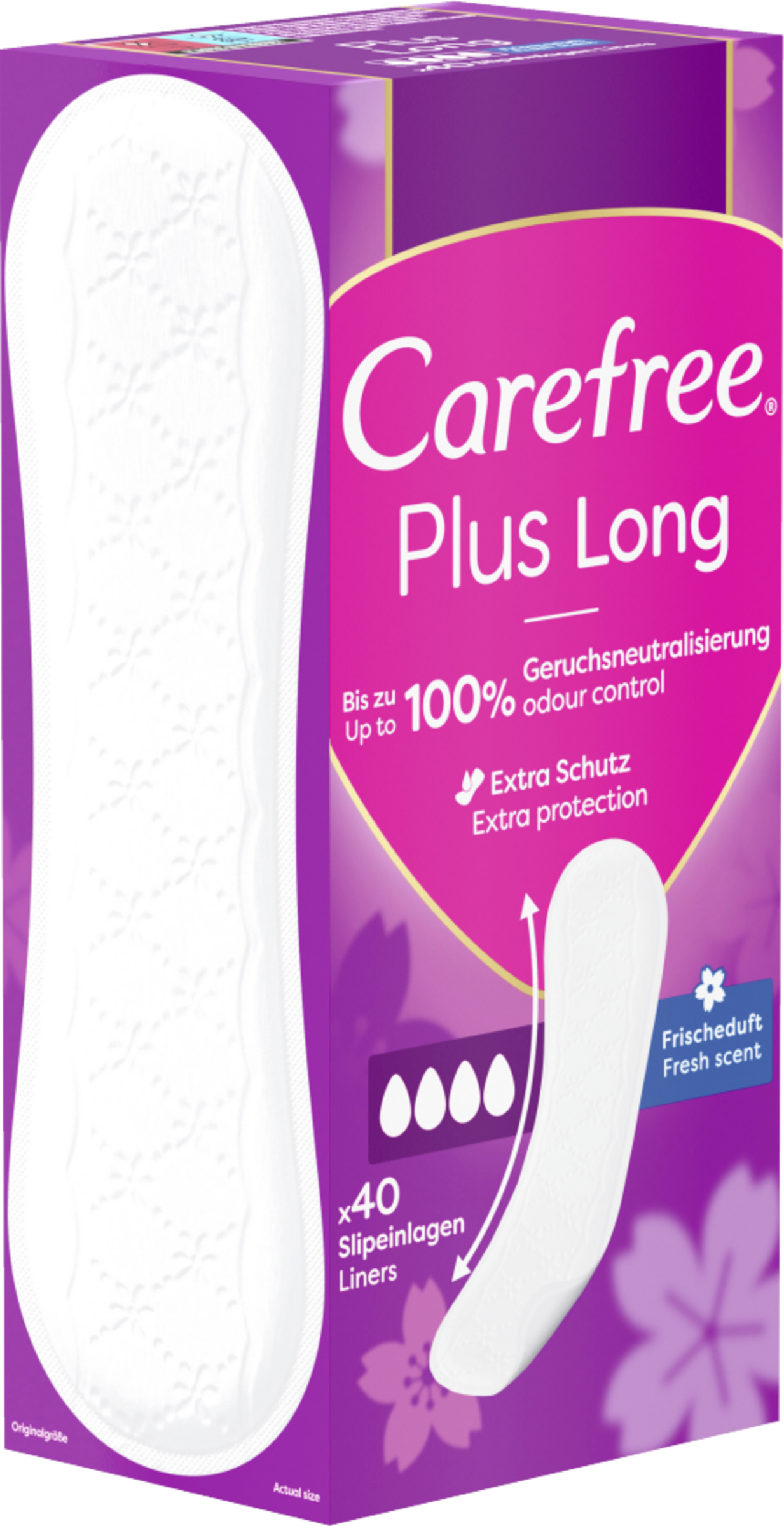 - die extra langen Carefree Plus Long Slipeinlagen sorgen für bis zu 100% Geruchsneutralisierung und extra Schutz für ein sicheres Tragegefühl