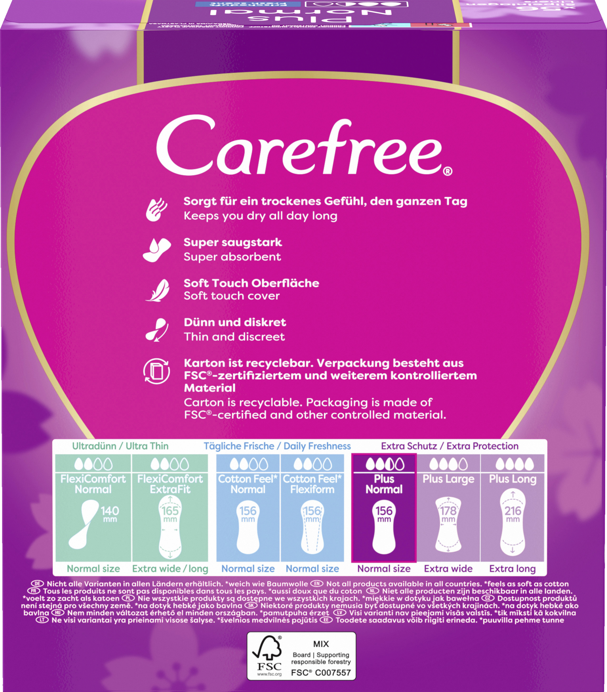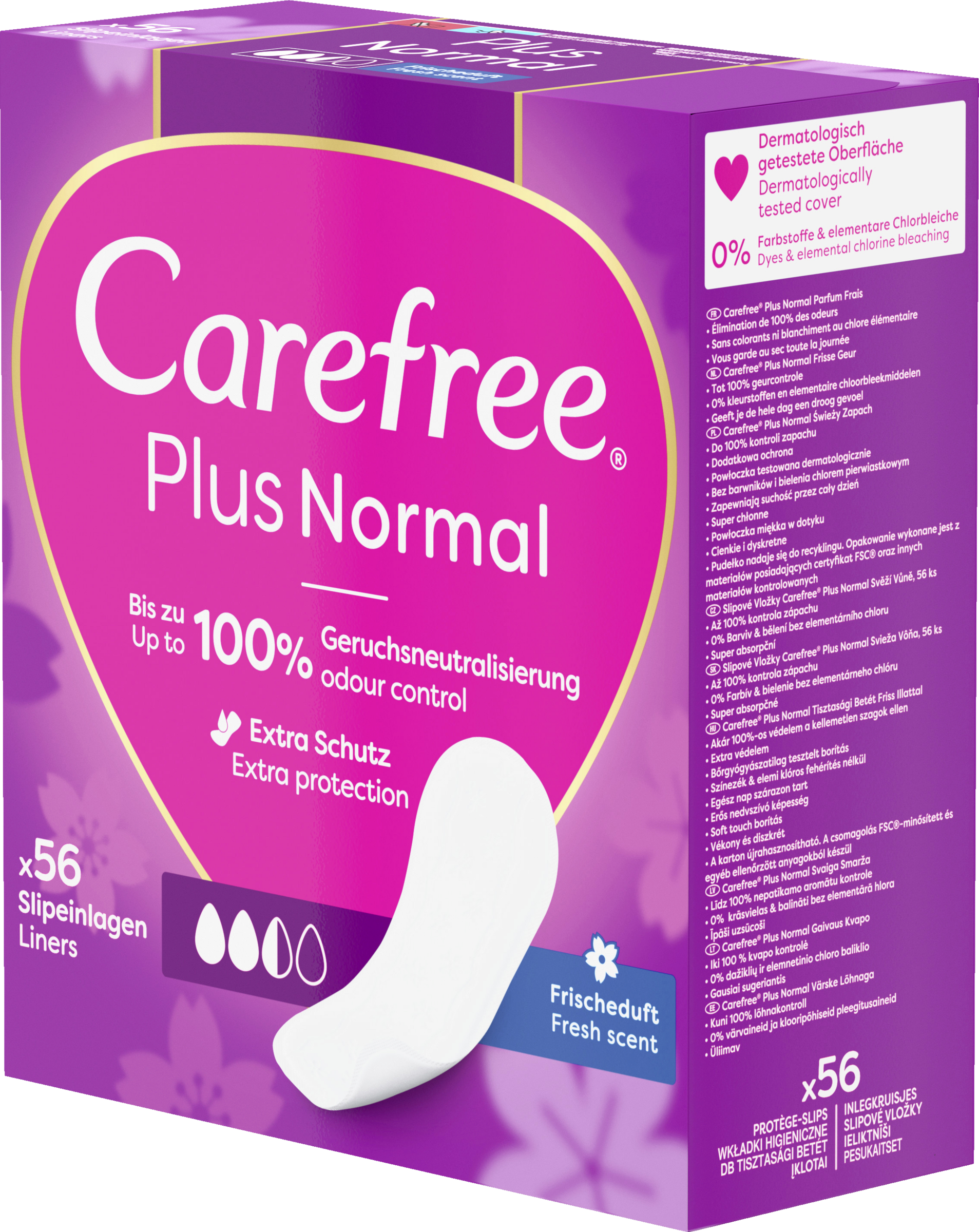 Neue Technologie für extra Schutz: Die Carefree Plus Normal Slipeinlagen mit Frischeduft sind super saugstark, um Flüssigkeiten sofort einzuschließen. Sie verfügen über einen verbesserten Kern für Komfort, Trockenheit und Geruchsneutralisierung. Sie sind weich wie Baumwolle, frei von Farbstoffen & elementarer Chlorbleiche und enthalten eine dermatologisch getestete Oberfläche.