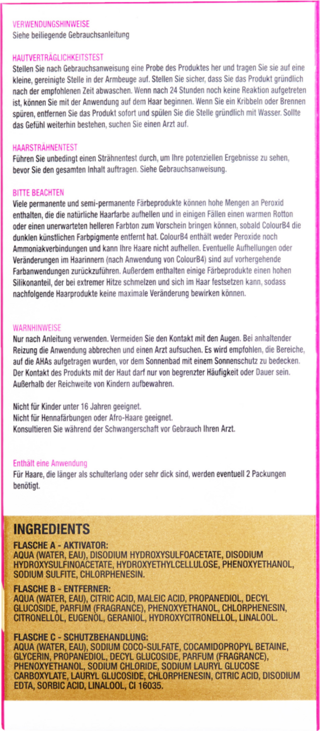 FLASCHE A – AKTIVATOR: AQUA (WATER, EAU), DISODIUM HYDROXYSULFOACETATE, DISODIUM HYDROXYSULFINOACETATE, HYDROXYETHYLCELLULOSE, PHENOXYETHANOL, SODIUM SULFITE, CHLORPHENESIN.