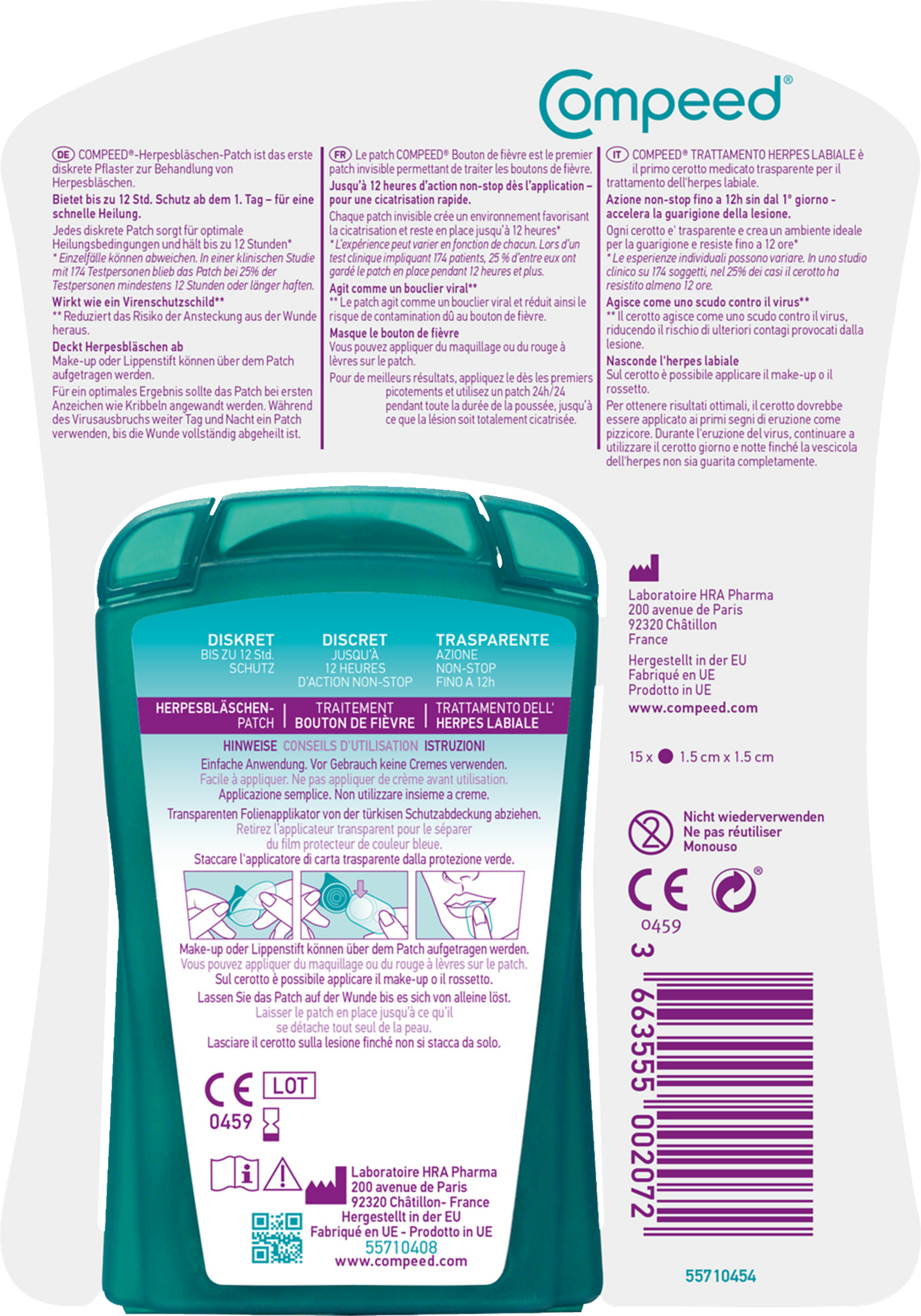 Anwendung des COMPEED® Herpesbläschen-Patch Wasche vor der Anwendung deine Hände. Entferne die Schutzhülle vom Patch und halte die Enden der Trägerfolie mit beiden Händen. Dabei sollte das Patch auf gereinigter, trockener Haut angewendet werden. Ziehe vorsichtig an den Enden der Trägerfolie in die darauf angegebene Pfeilrichtung, bis die klebrige, haftende Seite halb freigelegt ist. Vermeide den Kontakt mit der haftenden Seite des Patchs. Drücke den halb freigelegten Teil des Patchs sanft mit dem Finger auf die betroffene Stelle, um das Patch zu fixieren. Ziehe das Ende der Trägerfolie langsam nach unten, weg von der Haut, bis sich das Patch von der Trägerfolie löst. Wasche nach der Anwendung wieder deine Hände. Nun können Make-Up und Lippenstift wie gewohnt aufgetragen werden. Haftet das Patch auf der Wunde, sollte es nicht entfernt werden. Erst wenn es anfängt sich von selbst zu läsen, sollte es durch ein neues Patch ersetzt werden. Zum Entfernen das Patch vorsichtig entlang der Haut dehnen – nicht nach oben von der Haut wegziehen.