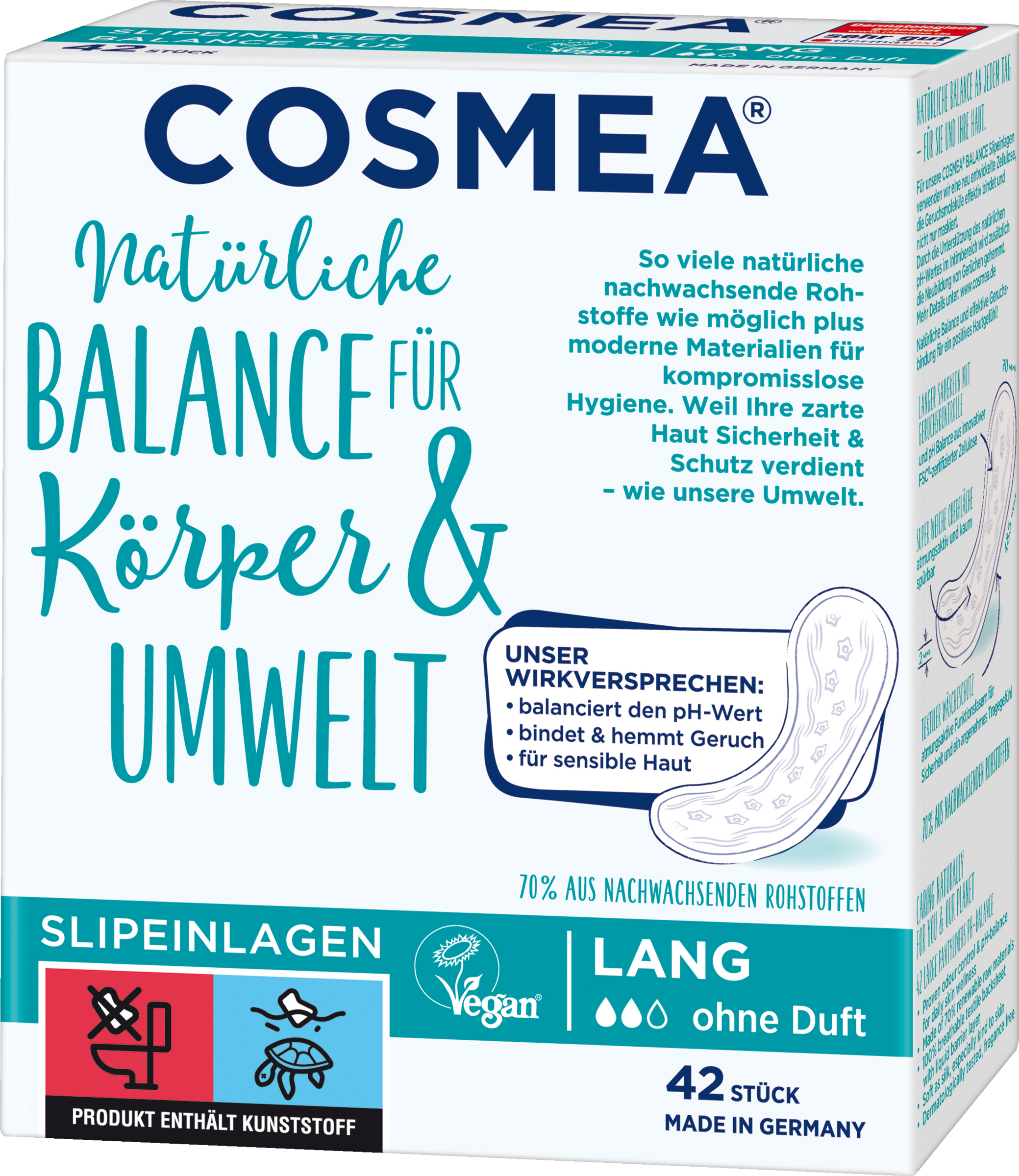 Die COSMEA® BALANCE Slipeinlagen Lang besitzen einen Saugkern aus einer neu entwickelten Zellulose, die Geruchsmoleküle effektiv bindet und nicht nur maskiert. Durch die Unterstützung des natürlichen pH-Wertes im Intimbereich wird zusätzlich die Neubildung von Gerüchen gehemmt – für ein frisches Gefühl den ganzen Tag.