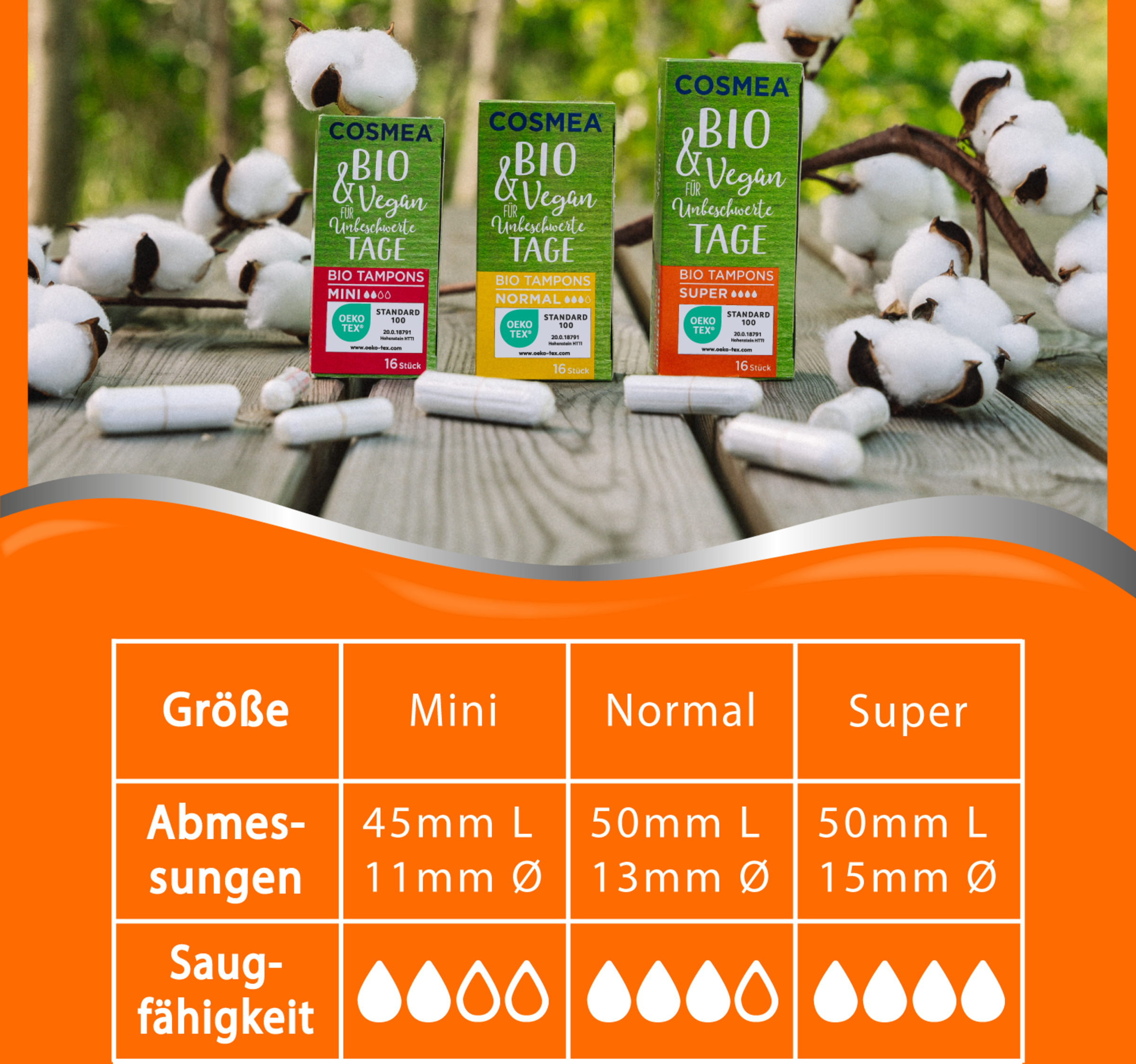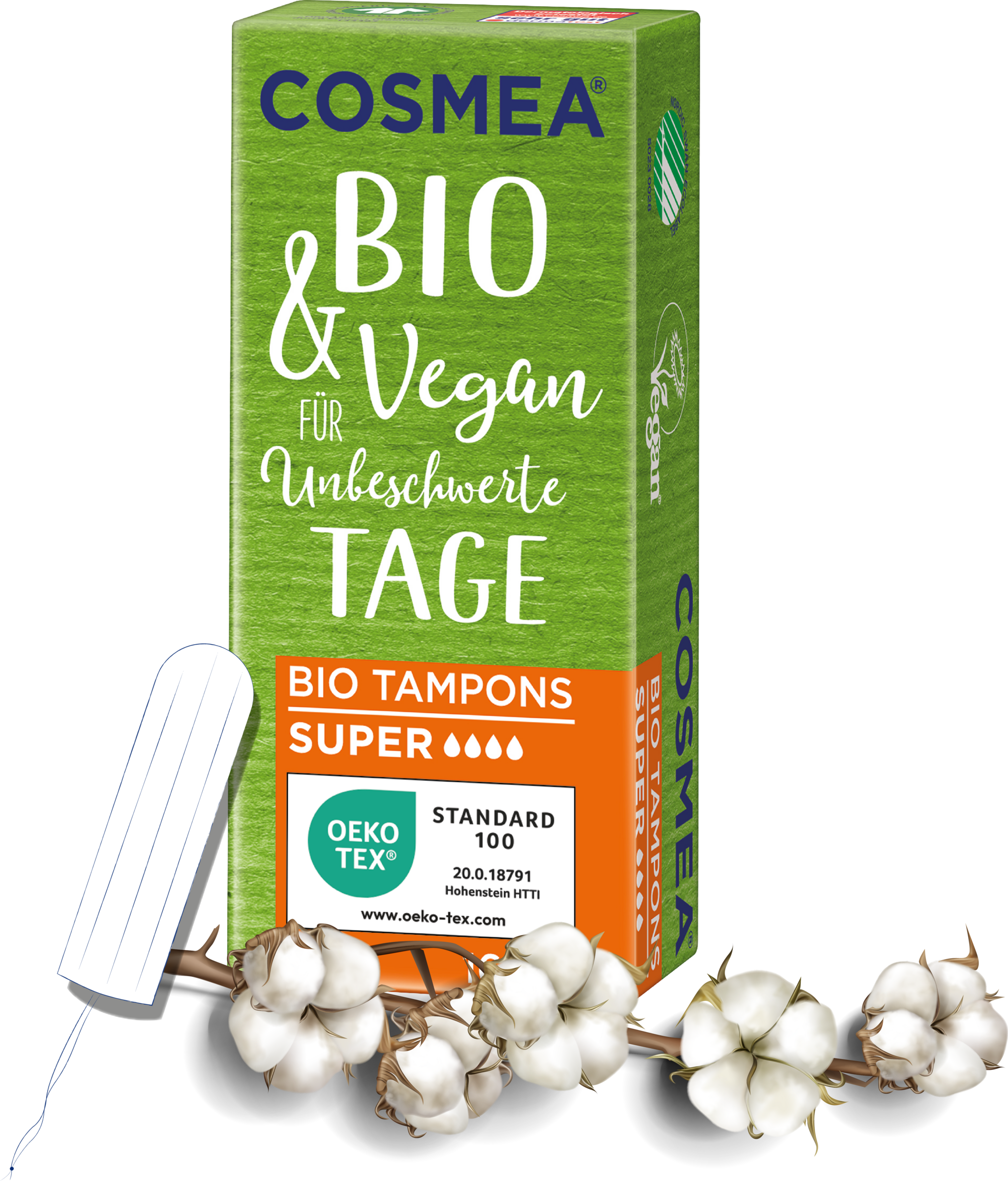Die COSMEA® Bio-Tampons Super bestehen aus 100% Bio-Baumwolle, zertifiziert gemäß „STANDARD 100 by OEKO-TEX®“ und „GOTS durch Ecocert Greenlife“. Die Rillenstruktur der Oberfläche sorgt für eine gleichmäßige Ausdehnung im Körperinneren und eine effiziente Flüssigkeitsaufnahme im Tampon-Kern. Der Umwelt zuliebe verzichten sie bei dem Saugkern auf eine Umhüllung aus Kunstfasern. Aus hygienischen Gründen sind die Tampons einzeln verpackt und mit einem praktischen Aufreißfaden versehen.