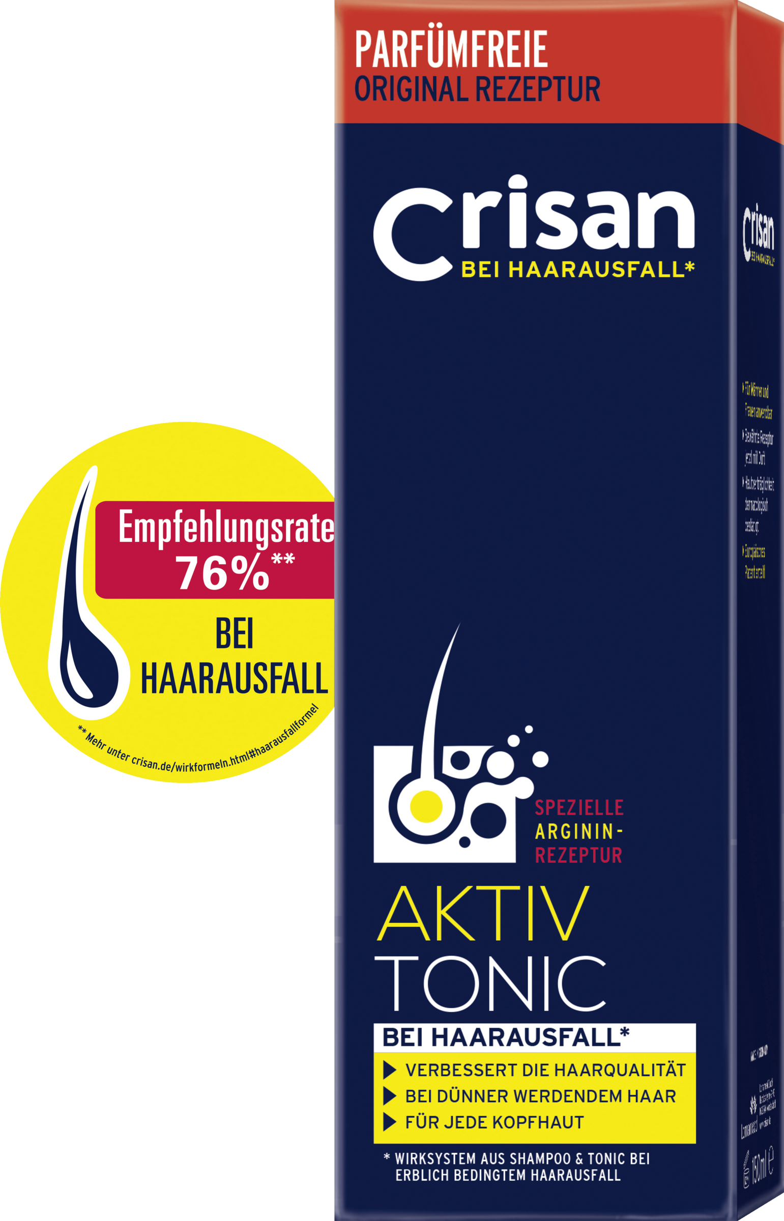 Mit spezieller Rezeptur und der körpereigenen Aminosäure ArgininDie spezielle CRISAN Aktiv-Tonic-Formel wurde für erblich bedingten Haarausfall entwickelt.