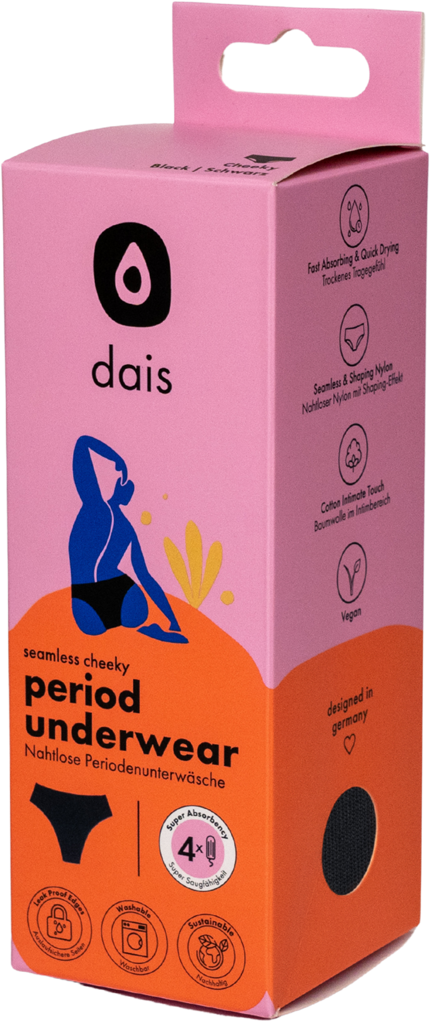 Waschbare Periodenunterwäsche im Cheeky Schnitt. Die 4-Lagen-Technologie garantiert eine starke Saugfähigkeit, die die Flüssigkeit von bis zu 4 normalen Tampons speichert. Zusätzliche auslaufsichere Seiten sorgen für extra Schutz.