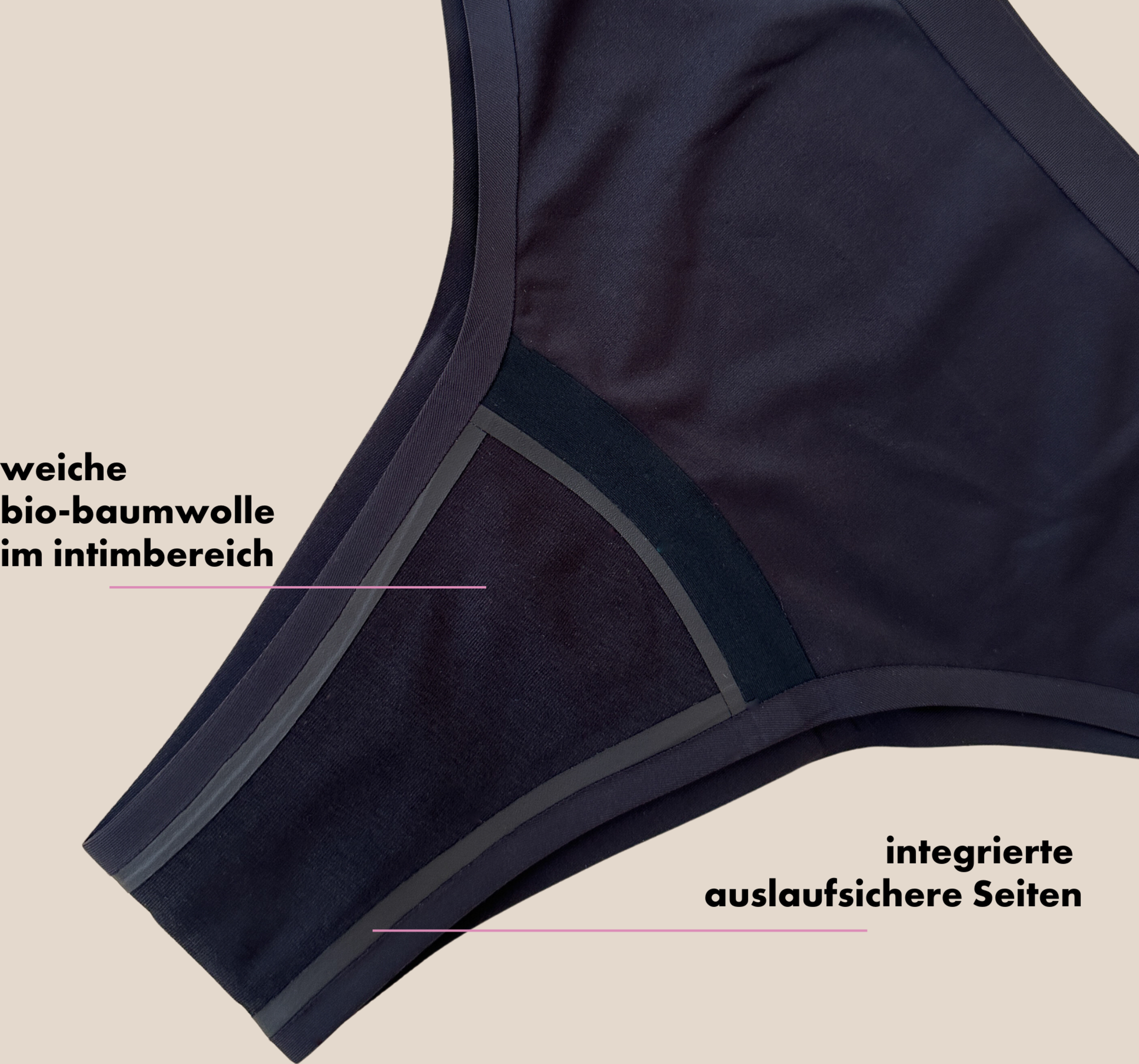 - der Slip ist vegan und besteht aus elastischem Nylon, weiche Bio-Baumwolle im Intimbereich