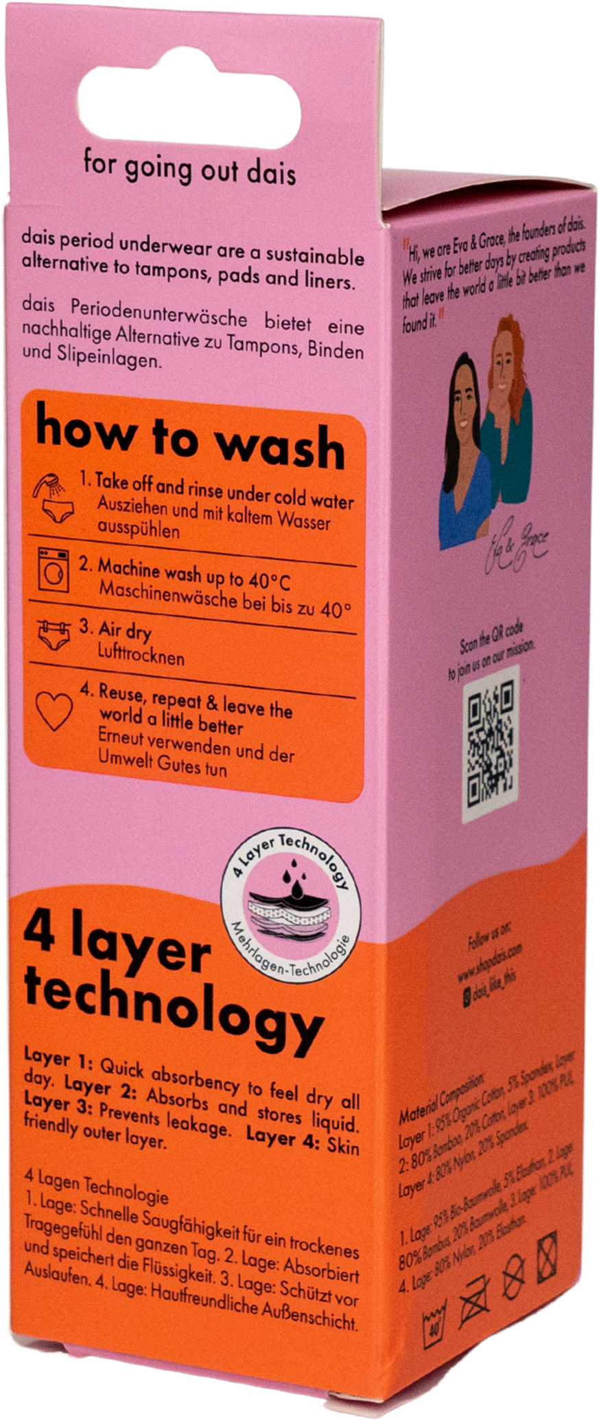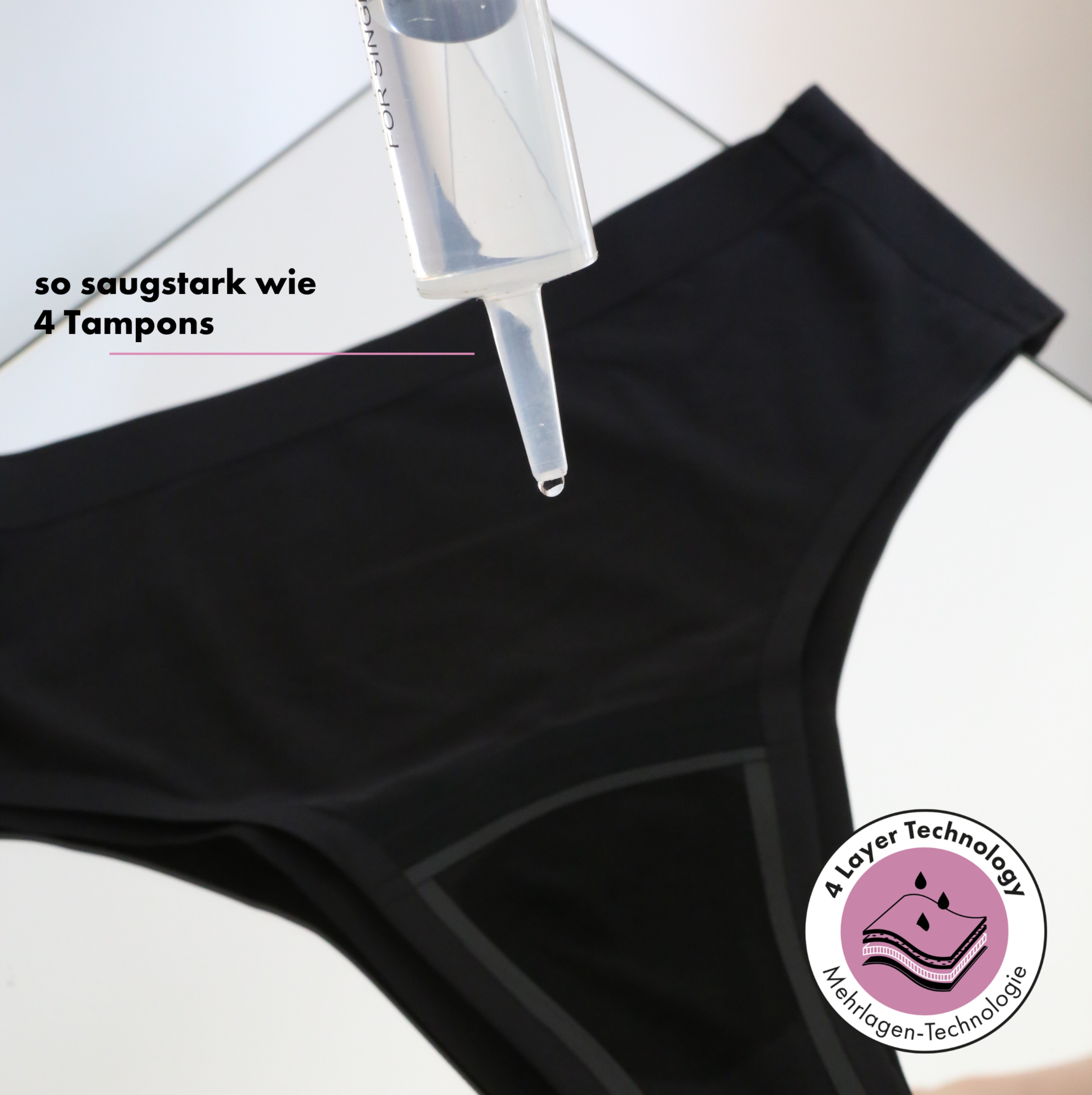 Waschbare Periodenunterwäsche im Cheeky Schnitt. Die 4-Lagen-Technologie garantiert eine starke Saugfähigkeit, die die Flüssigkeit von bis zu 4 normalen Tampons speichert. Zusätzliche auslaufsichere Seiten sorgen für extra Schutz.