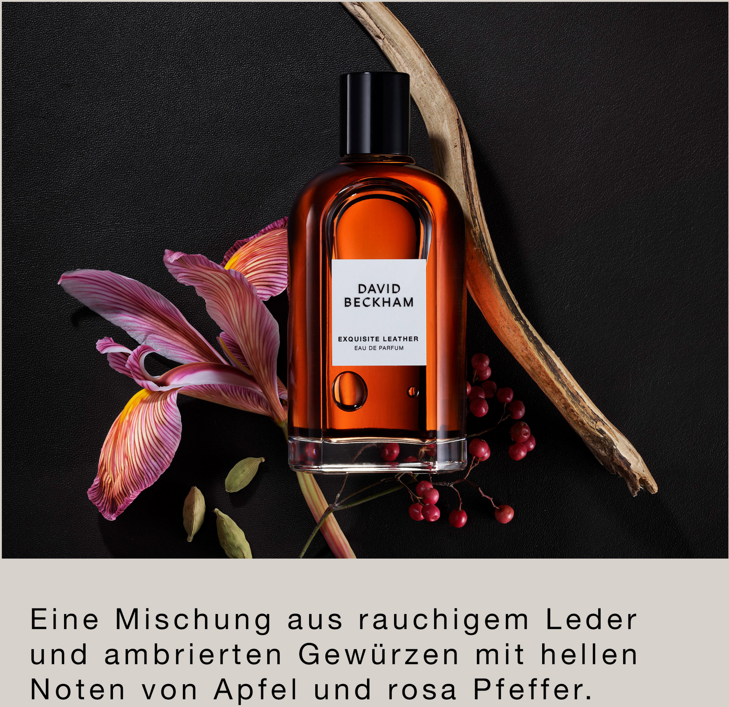 Die Essenz von maskulinem Luxus und markanter Eleganz – das verkörpert der Herren-Duft Exquisite Leather Eau de Parfum von David Beckham in Perfektion. Als Hommage an feine Lederwaren und die Freude an exquisiten Materialien entfaltet sich dieser Duft mit Noten von hellem Apfel, Himbeere, rosa Pfeffer und Kardamom-Essenz. In der Herznote offenbart sich die samtige Textur des Bourbon-Leder-Akkords, der durch die Frische von Wacholder-Essenz, Jasmin und pudriger Iriswurzel akzentuiert wird. Noten von weichem Sandelholz, Zedernholz, Cashmeran, Moschus und Moos runden den Herren-Duft ab.