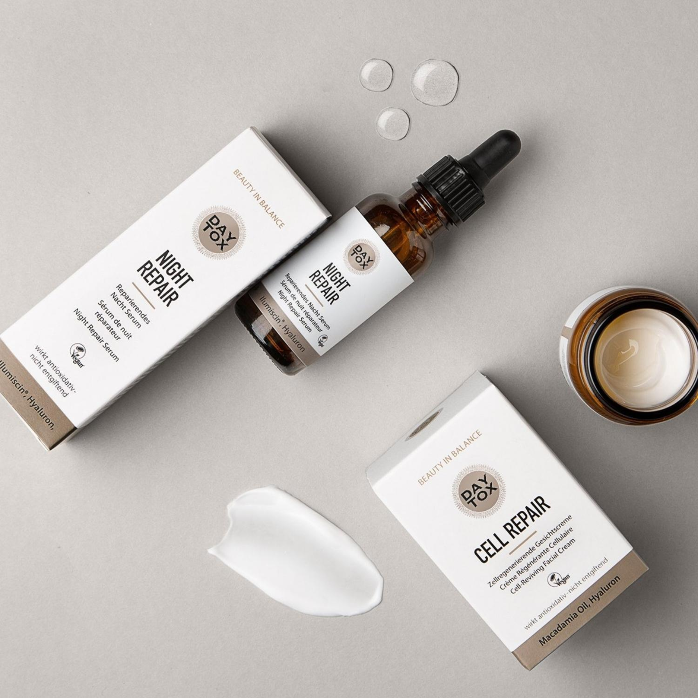 - kurz- und langkettiges Hyaluron durchfeuchtet und strafft die Haut