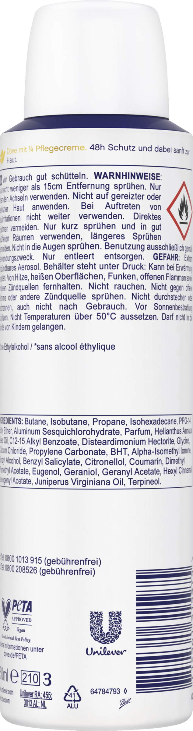 - Die Deo-Sprays von Dove sind „PETA-vegan“ zertifiziert (weitere Informationen auf der Dove Webseite)
