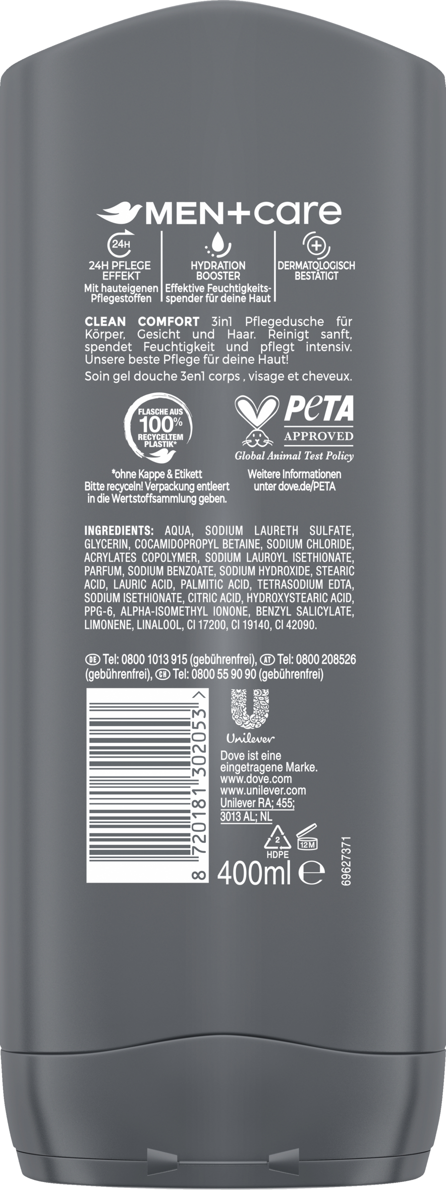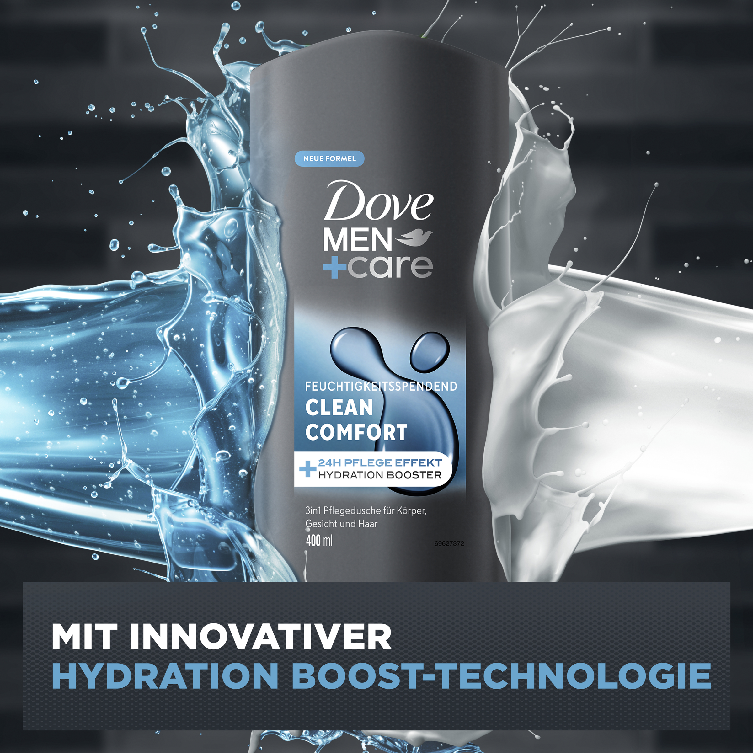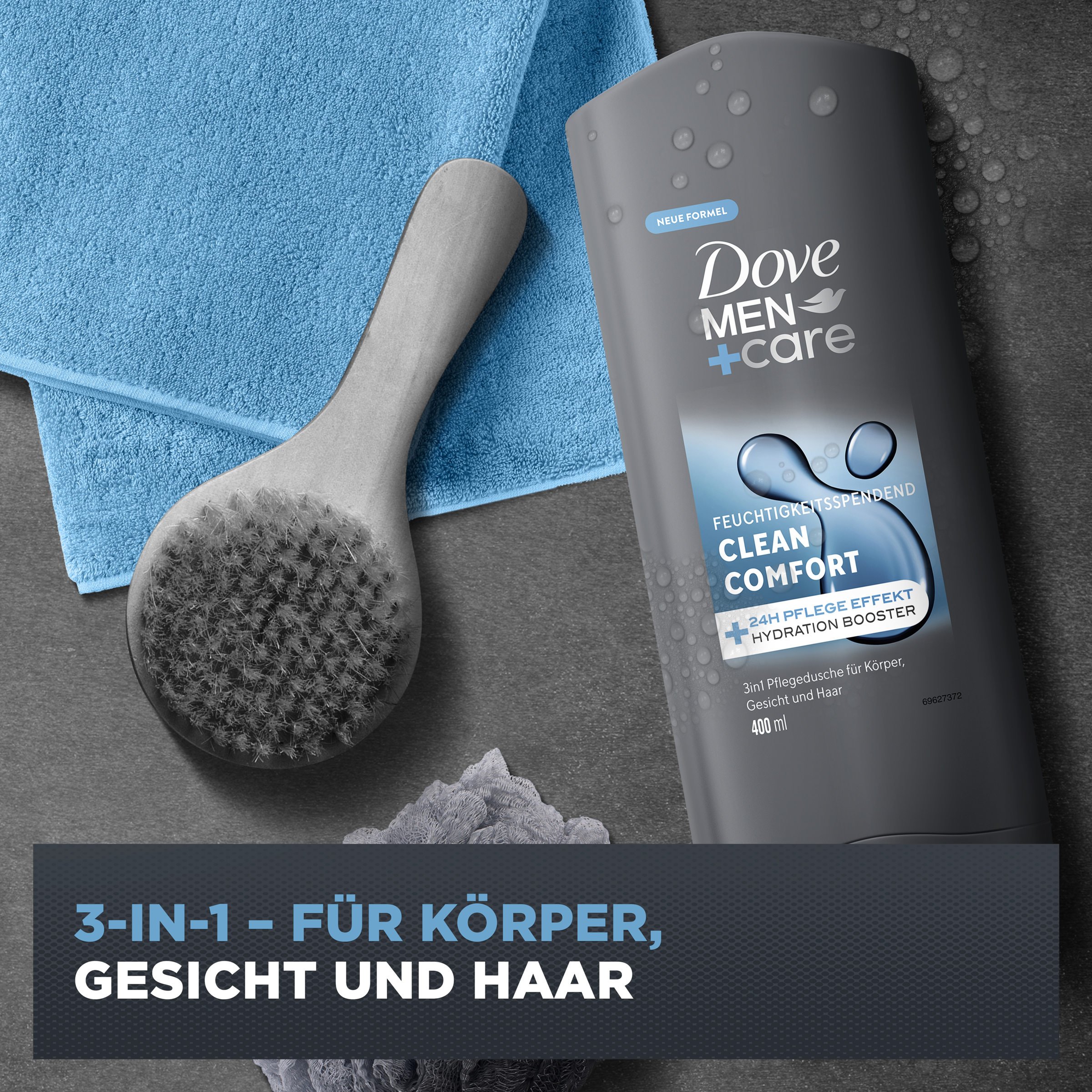 Eine gepflegte Haut beginnt mit der richtigen Dusche: Sie sollte gründlich reinigen und gleichzeitig die Haut mit Feuchtigkeit versorgen, um sie so vor dem Austrocknen zu schützen. Dove Men+Care 3-in-1 Pflegedusche Clean Comfort für Körper, Gesicht und Haar spendet Feuchtigkeit mit der Hydration Booster-Technologie und schützt die Haut nach dem Duschen vor dem Austrocknen. Die hocheffiziente Formel mit hauteigenen Pflegestoffen lässt sich leicht abspülen und hinterlässt ein angenehmes Hautgefühl. Mit diesem Duschgel starten Männer jetzt erfrischt und besser geschützt in den Tag. Die Flasche dieser Duschgele besteht aus 100% recyceltem Plastik*.