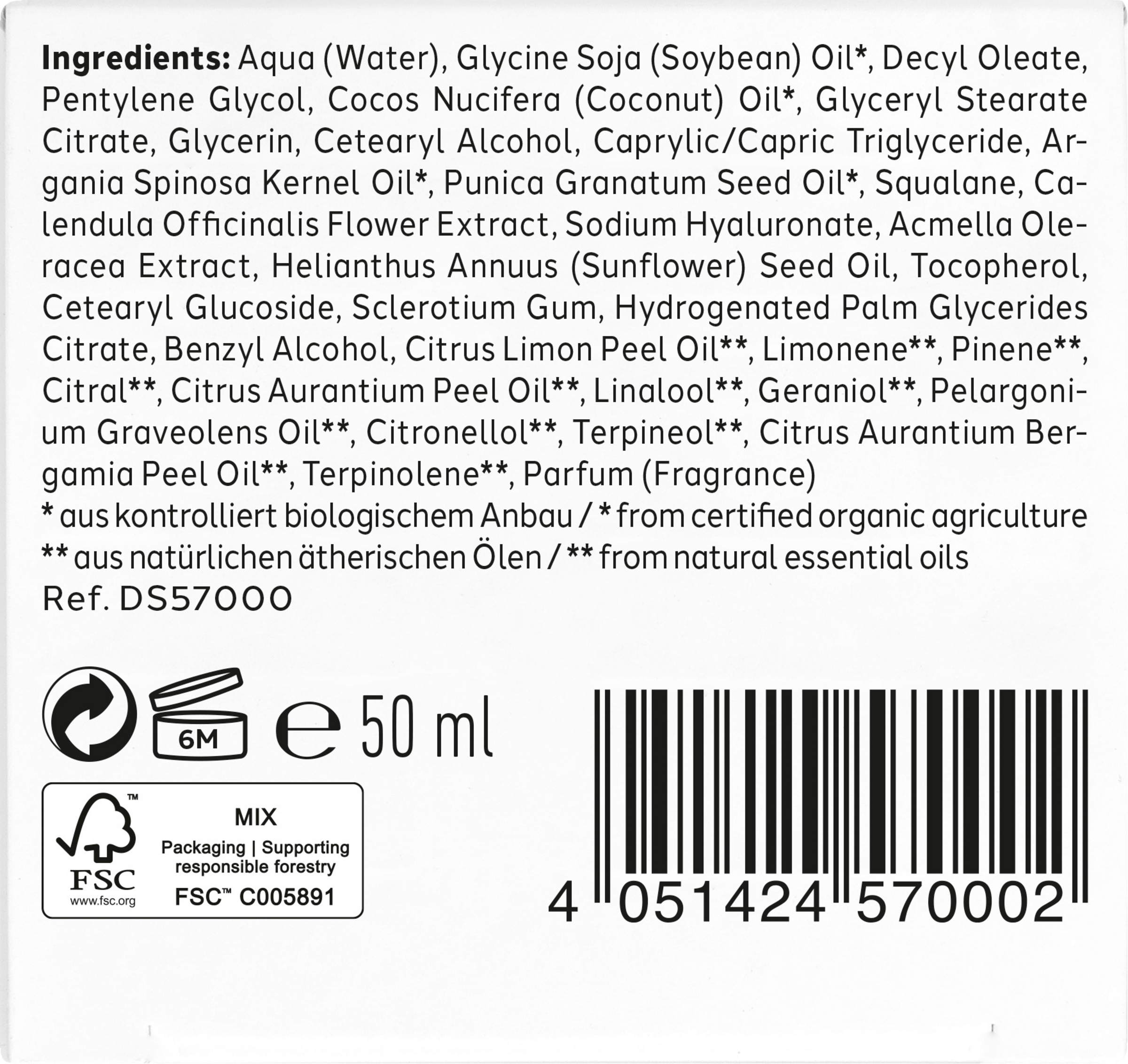 AQUA (WATER), GLYCINE SOJA (SOYBEAN) OIL*, DECYL OLEATE, PENTYLENE GLYCOL, COCOS NUCIFERA (COCONUT) OIL*, GLYCERYL STEARATE CITRATE, GLYCERIN, CETEARYL ALCOHOL, CAPRYLIC/CAPRIC TRIGLYCERIDE, ARGANIA SPINOSA KERNEL OIL*, PUNICA GRANATUM SEED OIL*, SQUALANE, CALENDULA OFFICINALIS FLOWER EXTRACT, SODIUM HYALURONATE, ACMELLA OLERACEA EXTRACT, HELIANTHUS ANNUUS (SUNFLOWER) SEED OIL, TOCOPHEROL, CETEARYL GLUCOSIDE, SCLEROTIUM GUM, HYDROGENATED PALM GLYCERIDES CITRATE, BENZYL ALCOHOL, CITRUS LIMON PEEL OIL**, LIMONENE**, PINENE**, CITRAL**, CITRUS AURANTIUM PEEL OIL**, LINALOOL**, GERANIOL**, PELARGONIUM GRAVEOLENS OIL**, CITRONELLOL**, TERPINEOL**, CITRUS AURANTIUM BERGAMIA PEEL OIL**, TERPINOLENE**, PARFUM (FRAGRANCE).