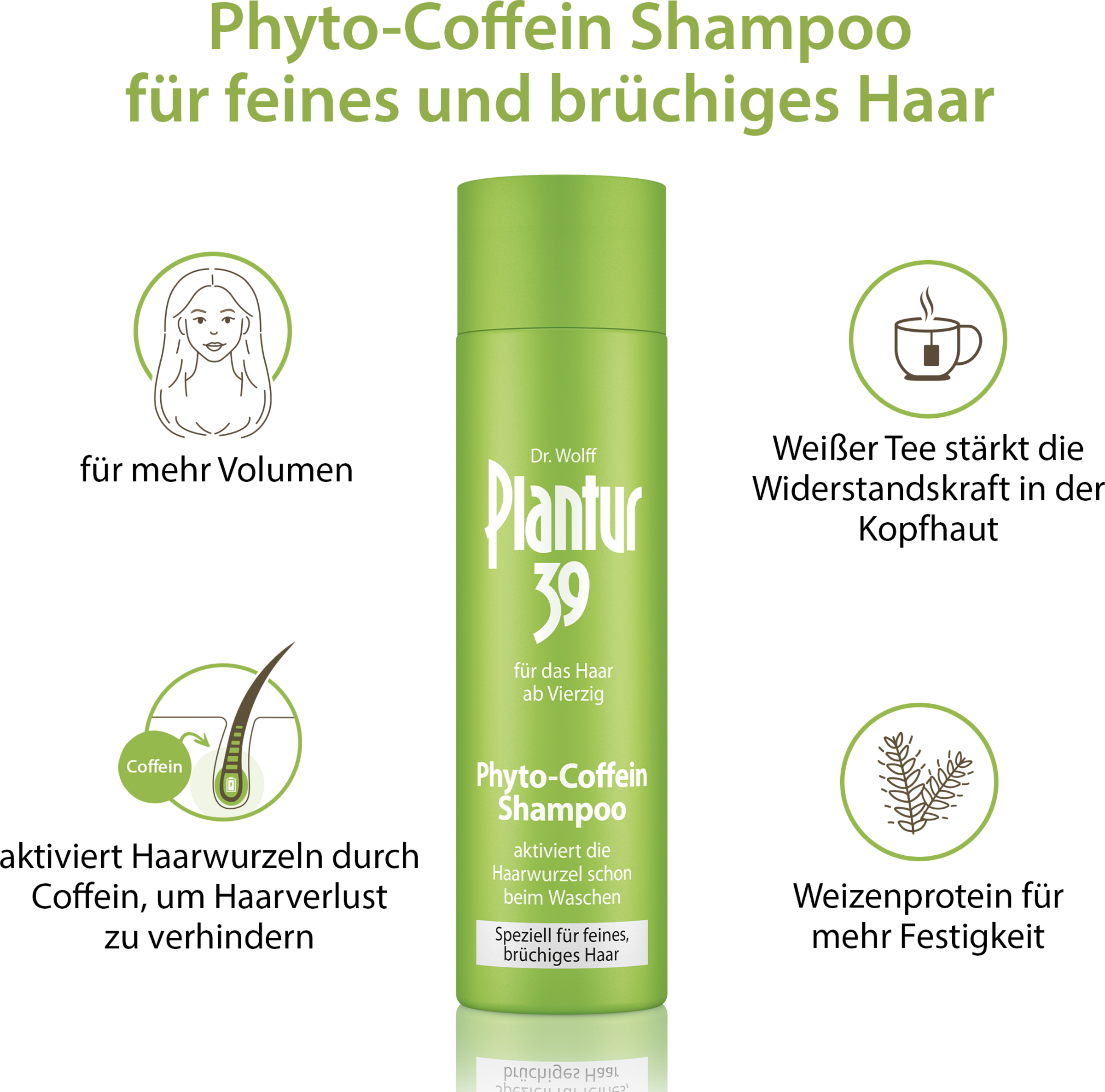 Die Haarwurzel der Frau ist bis zur Menopause (Wechseljahre) durch einen hohen Anteil weiblicher Hormone (Östrogen) geschützt. Danach sinkt dieser Anteil und der Einfluss der männlichen Hormone nimmt zu. Die Folge: Haarausfall. Das aktivierende Coffein in diesem Shampoo dringt schon bei der Haarwäsche bis in den Haarfollikel vor (nach 120 Sek. Einwirkzeit nachweisbar). Phyto-Aktivstoffe aus der Natur helfen der Kopfhaut, sich vor den Folgen des sinkenden Östrogenspiegels zu schützen.