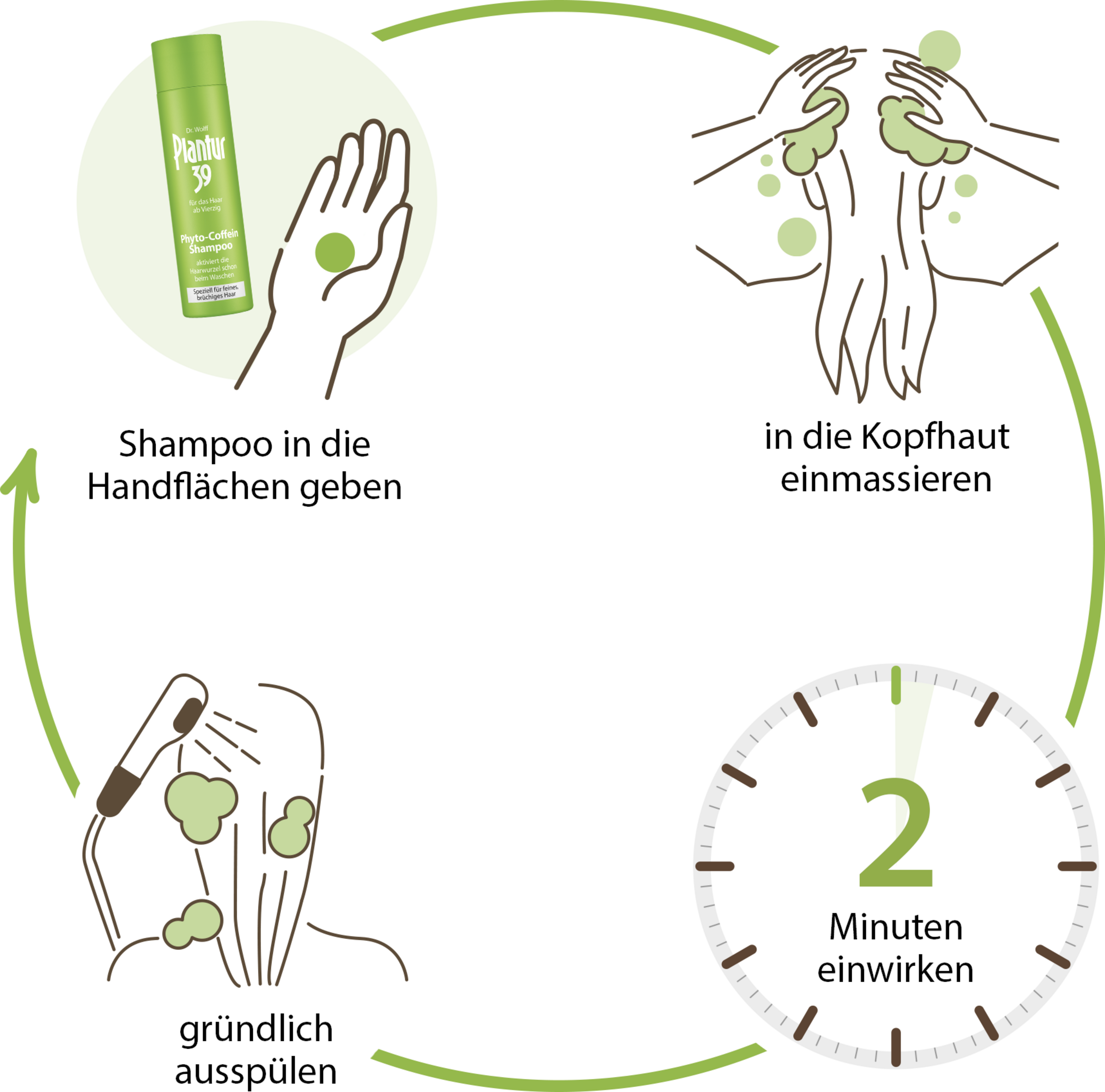 Empfehlung: 2 Minuten auf der Kopfhaut lassen - vom Auftragen bis zum Ausspülen.