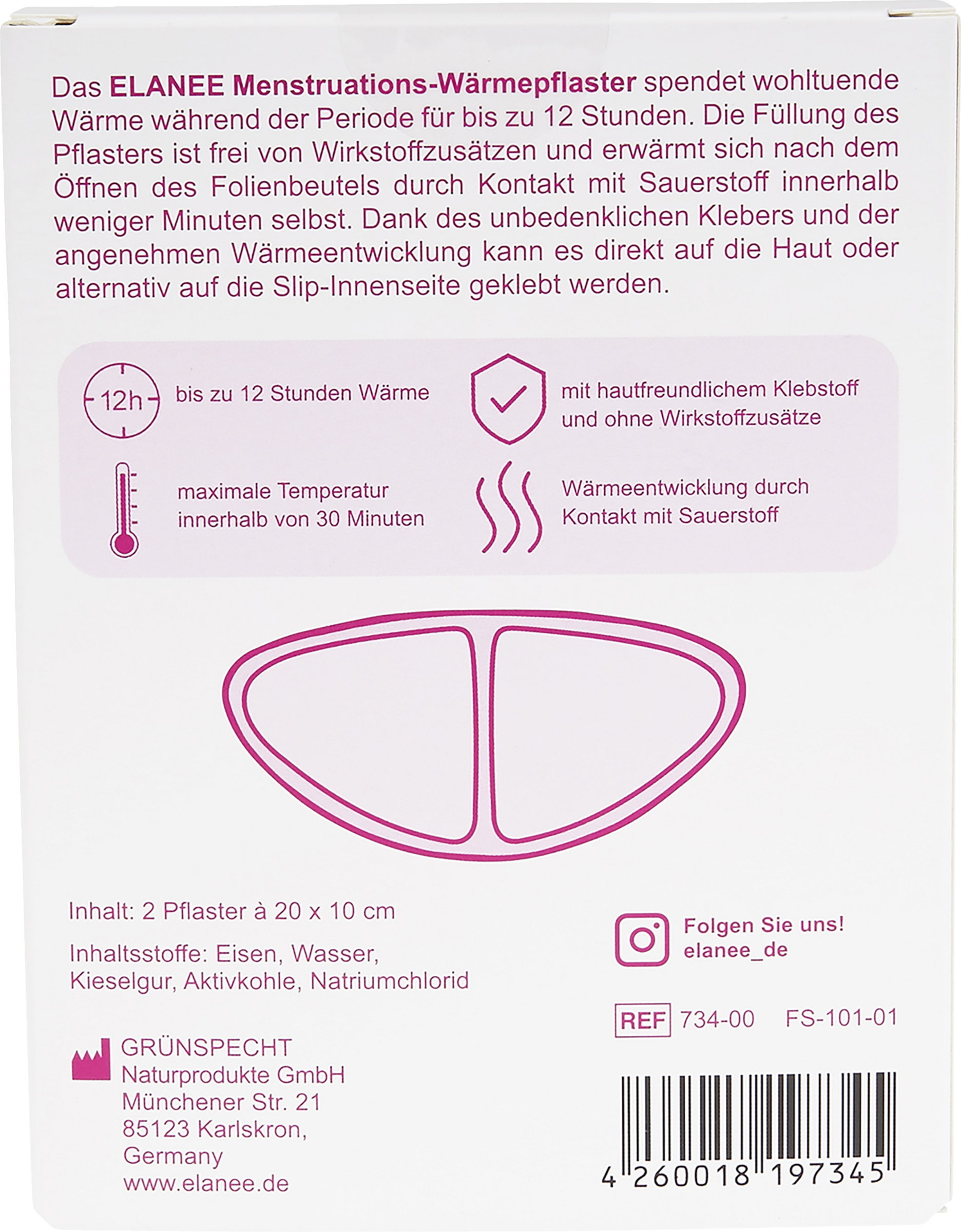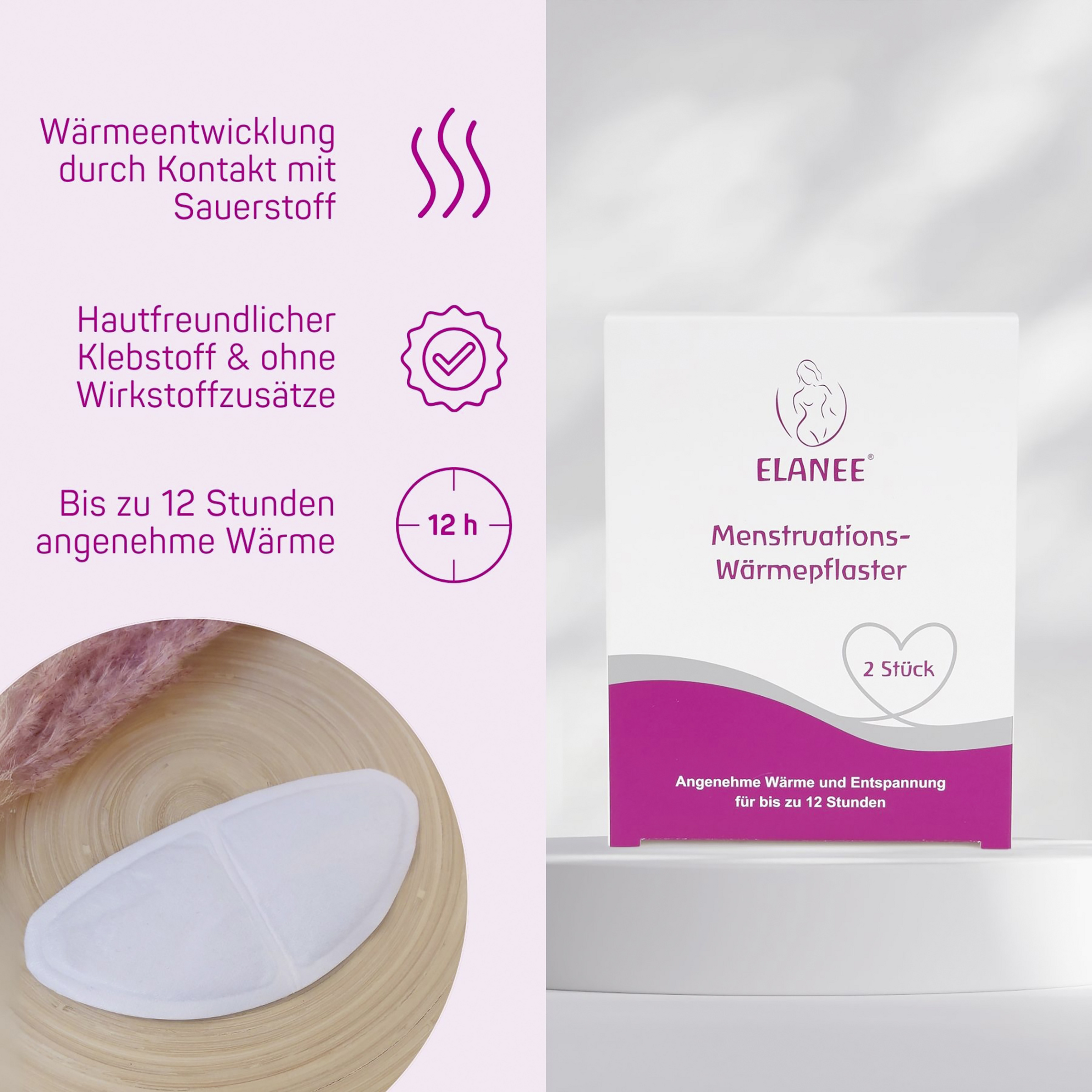 Das ELANEE Menstruations-Wärmepflaster spendet wohltuende Wärme während der Periode für bis zu 12 Stunden. Die Füllung des Pflasters ist frei von Wirkstoffen und erwärmt sich nach dem Öffnen des Folienbeutels durch Kontakt mit Sauerstoff innerhalb weniger Minuten selbst. Dank des unbedenklichen Klebers und der angenehmen Wärmeentwicklung kann es direkt auf die Haut oder alternativ auf die Slip-Innenseite geklebt werden. Eine Packung enthält zwei einzeln verpackte Wärmepflaster.