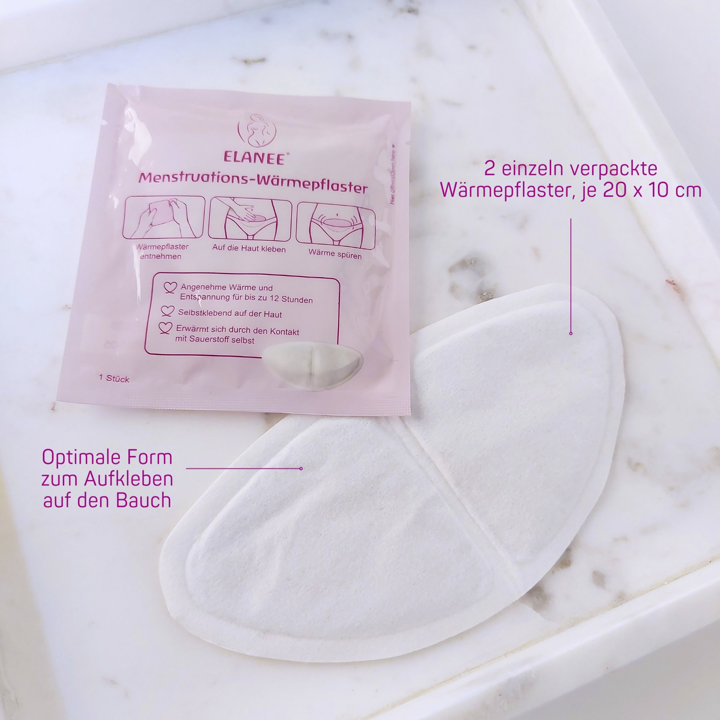 Das ELANEE Menstruations-Wärmepflaster spendet angenehme Wärme in der gewünschten Körperregion und hilft dabei zu entspannen. Das Wärmepflaster eignet sich neben der Anwendung auf dem Bauch auch zum Aufkleben auf Rücken, Schultern oder Nacken. Prüfen Sie vor der Anwendung, ob der Folienbeutel sowie das Wärmepflaster unversehrt sind. Wenden Sie das Produkt nicht an, wenn es beschädigt ist.