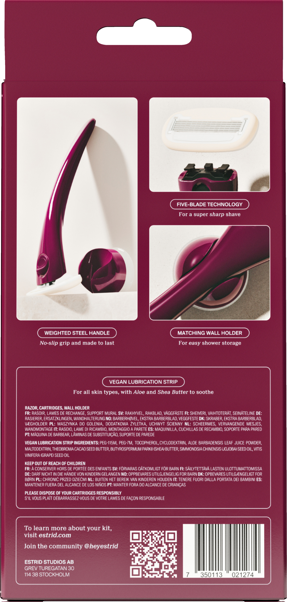 Der Estrid Rasierer wurde speziell für empfindliche Haut entwickelt und überzeugt mit fünf super-scharfen und dünnen Edelstahlklingen für eine gründliche und komfortable Rasur – immer und immer wieder. Die Rasierklingen sind von unserem speziellen veganen Feuchtigkeitsstreifen mit Sheabutter und Aloe vera umrandet, um die Haut zu schützen, Irritationen zu vermeiden und ein sanftes Gleiten zu ermöglichen. Der ergonomisch geformte Griff des Rasierers aus Stahl bietet sicheren, rutschfesten Halt. Der Rasierer wird mit einer passenden Wandhalterung geliefert, sodass er immer einsatzbereit ist.