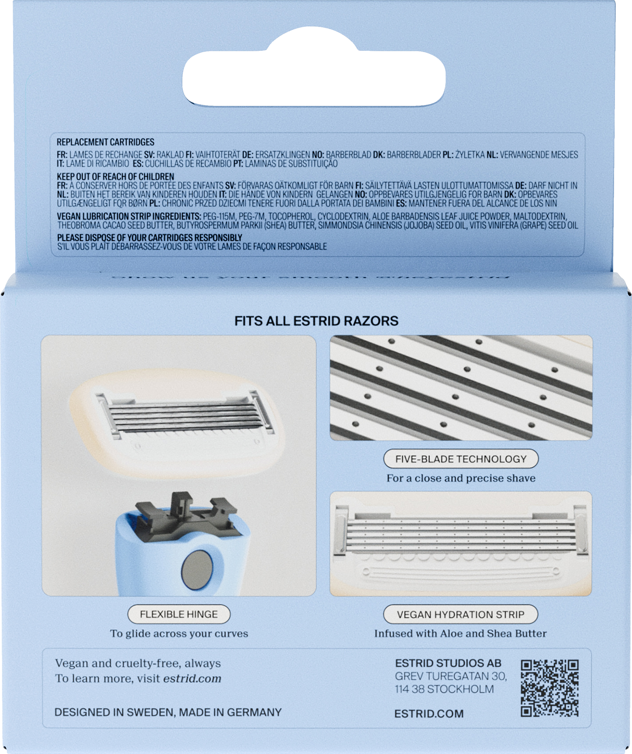 Die Ersatzköpfe von Estrid wurden speziell für empfindliche Haut entwickelt und verfügen über fünf super-scharfe Edelstahlklingen für eine gründliche Rasur bei jeder Anwendung. Die Rasierklingen sind von unserem speziellen veganen Feuchtigkeitsstreifen mit Sheabutter und Aloe vera umrandet, um die Haut zu schützen, Irritationen zu vermeiden und ein sanftes Gleiten zu ermöglichen.Die Ersatzköpfe sind mit jedem Rasiergriff von Estrid kompatibel.