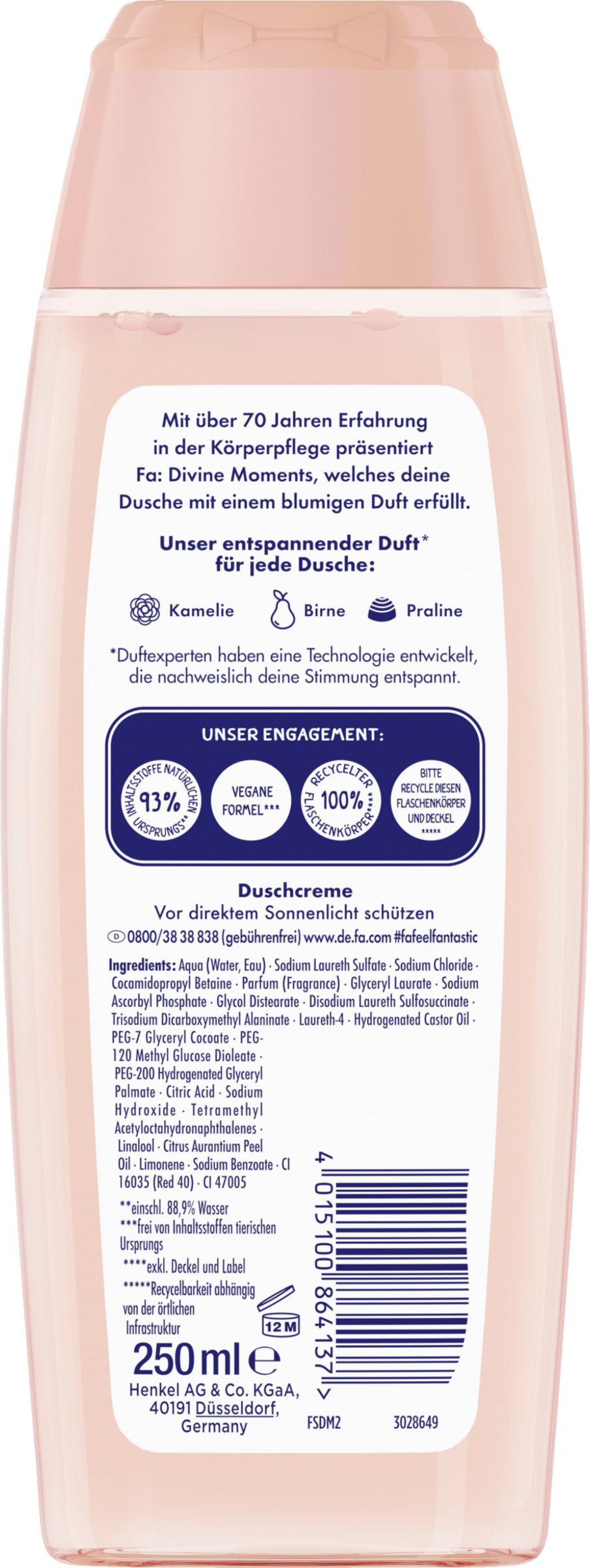Mit mehr als 70 Jahren Erfahrung in der Körperpflege präsentiert FA die Divine Moments Duschcreme, die deine Dusche mit einem blumigen Duft erfüllt. Das Duschgel für Frauen ist sanft zur Haut und hat einen beruhigenden Duft nach Kamelie, Birne und Praline, der speziell von Duftexperten entwickelt wurde und nachweislich deine Stimmung entspannt. Gut für dich & den Planeten: Das FA Duschbad enthält 95 % Inhaltsstoffe natürlichen Ursprungs¹, hat eine vegane Formel², einen 100 % recycelten Flaschenkörper³ und ist recycelbar⁴.