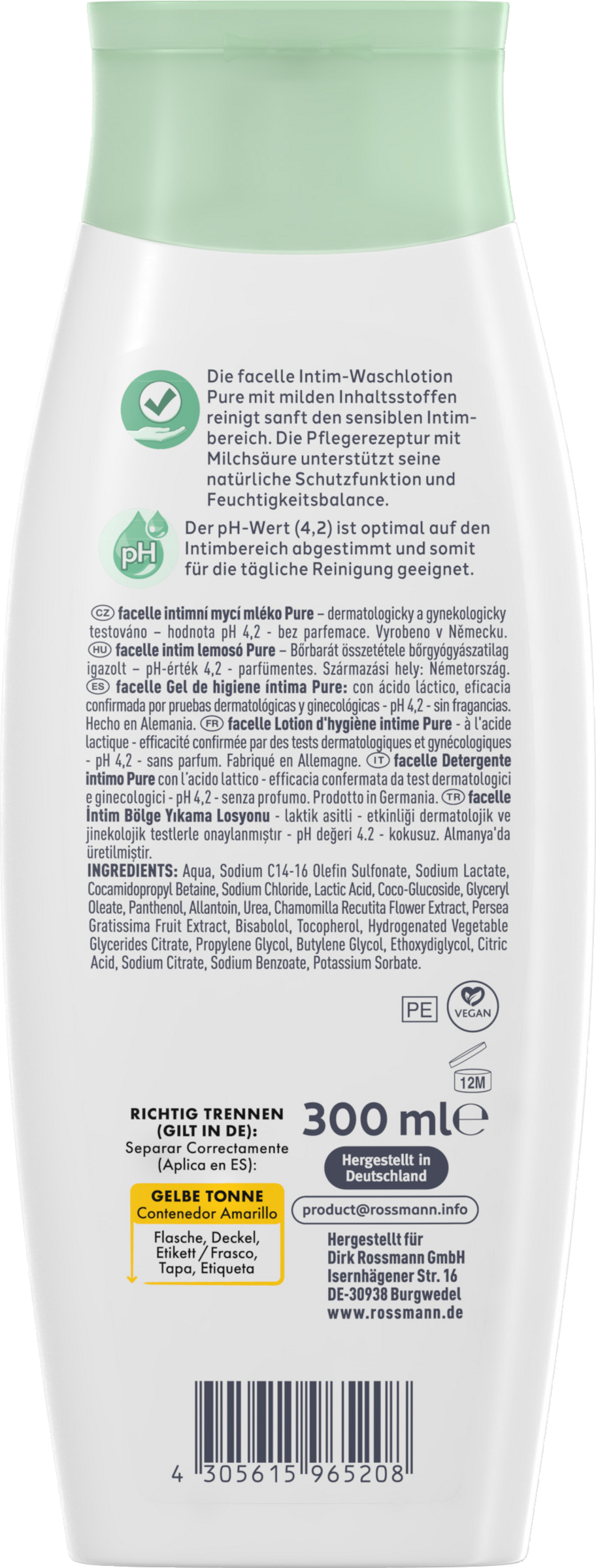 Die facelle Intim-Waschlotion Pure mit milden Inhaltsstoffen wurde für die sanfte Reinigung des sensiblen Intimbereichs entwickelt. Die Pflegeformel mit Milchsäure unterstützt seine natürliche Schutzfunktion und Feuchtigkeitsbalance.