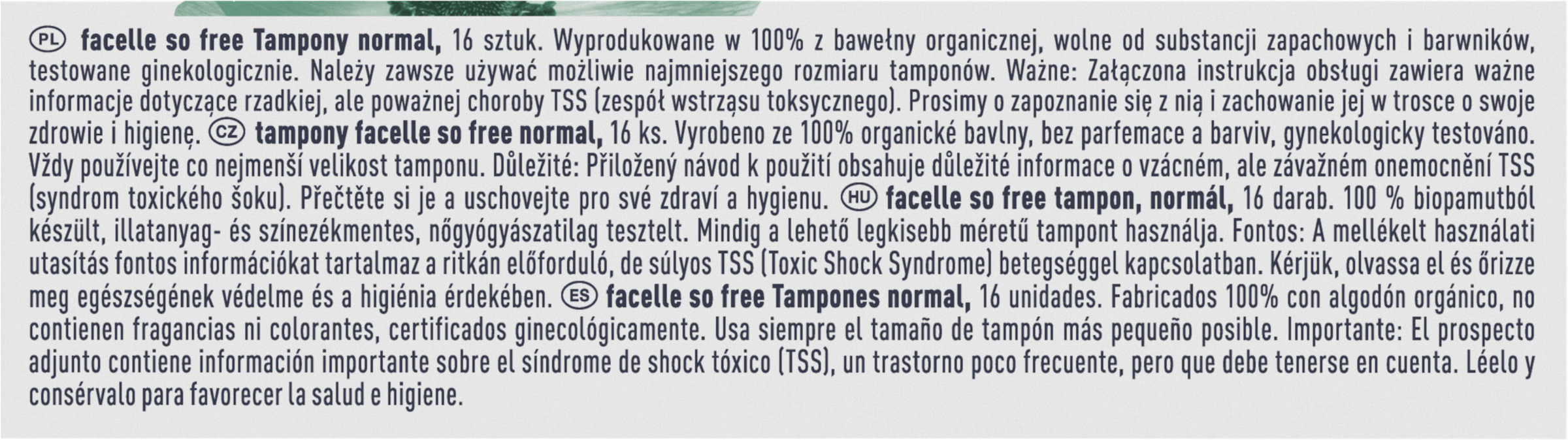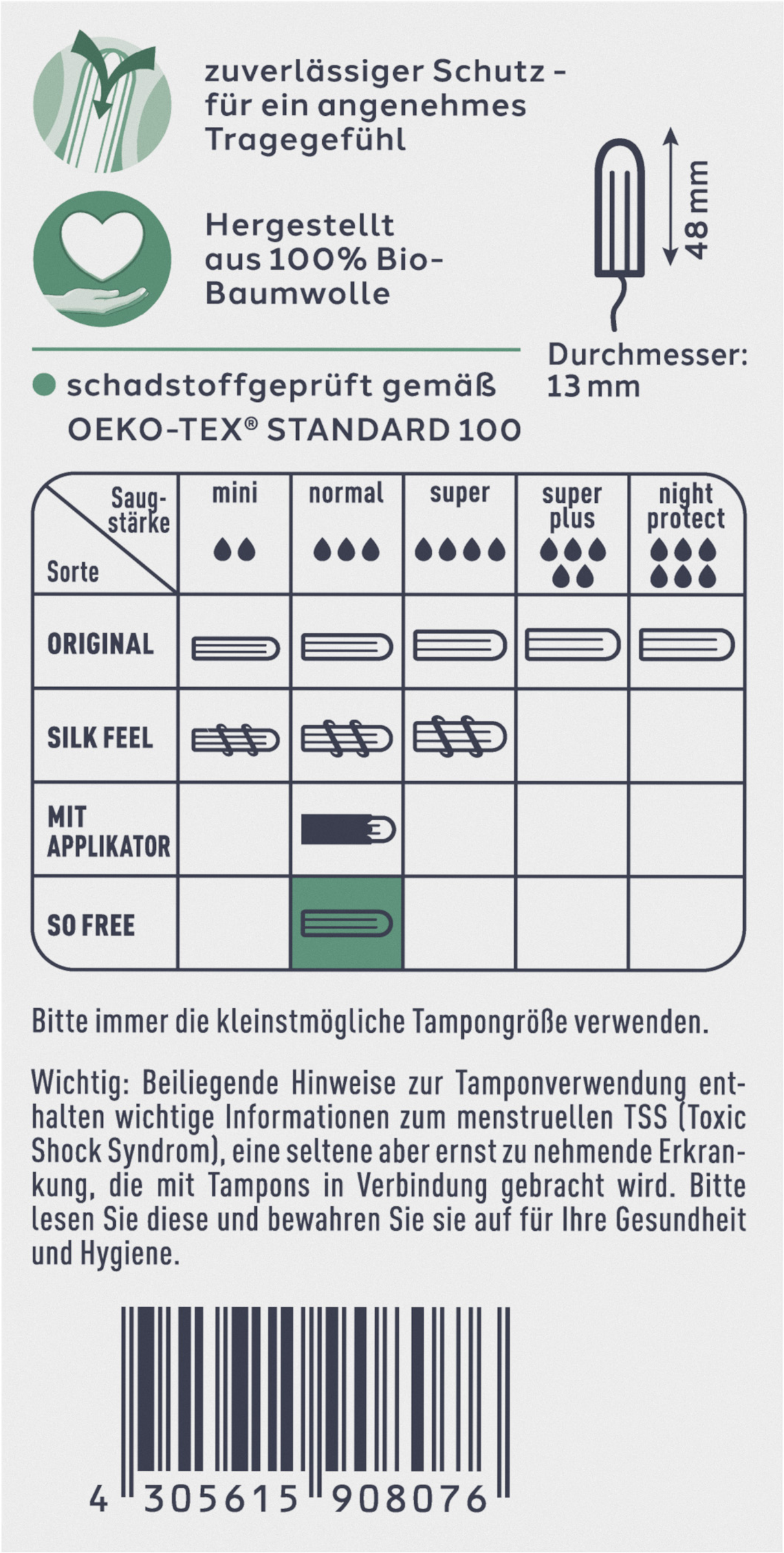 Beiliegende Hinweise zur Tamponverwendung enthalten wichtige Informationen zum menstruellen TSS (Toxic Shock Syndrom), eine seltene aber ernst zu nehmende Erkrankung, die mit Tampons in Verbindung gebracht wird. Bitte lesen Sie diese und bewahren Sie sie auf für Ihre Gesundheit und Hygiene.