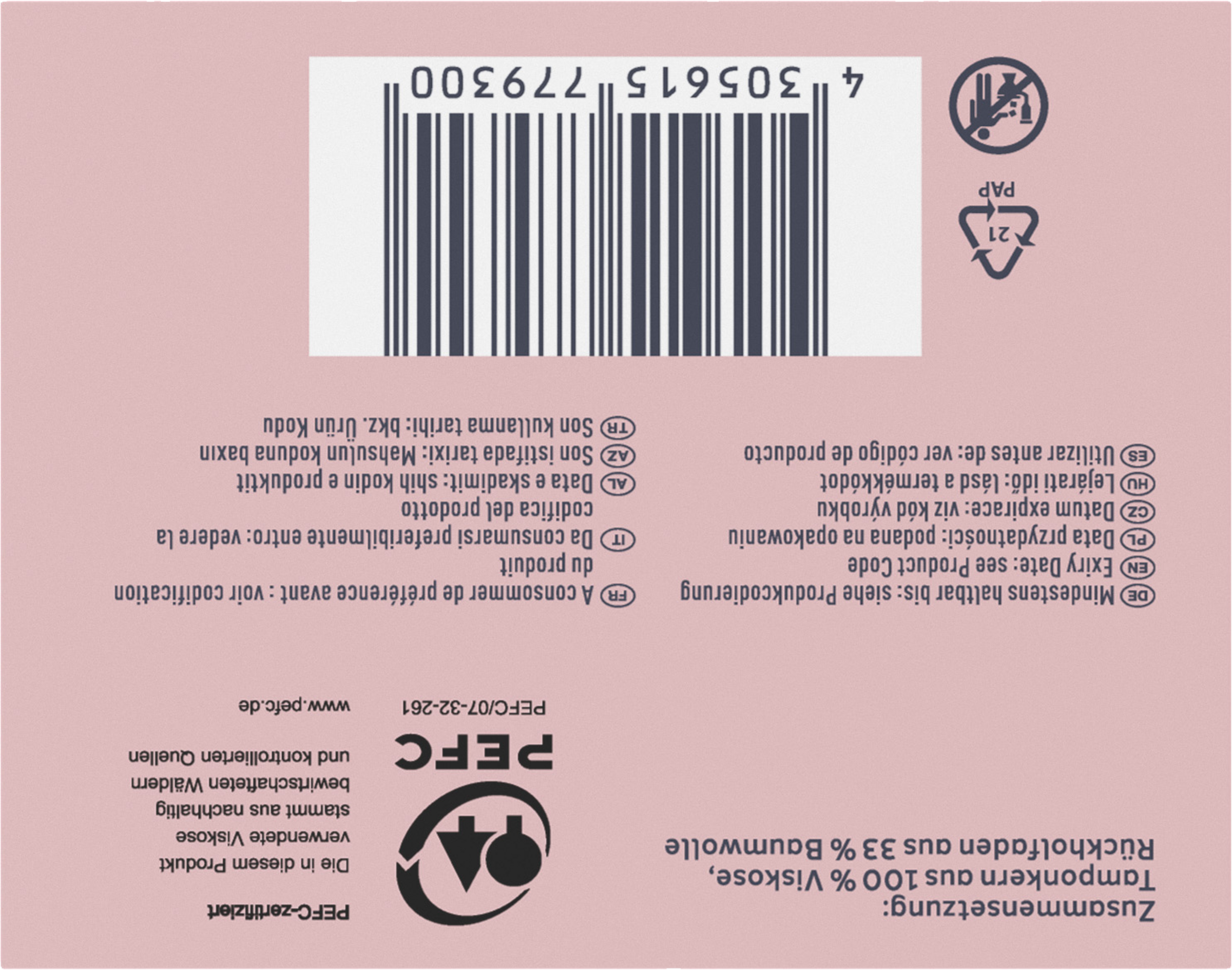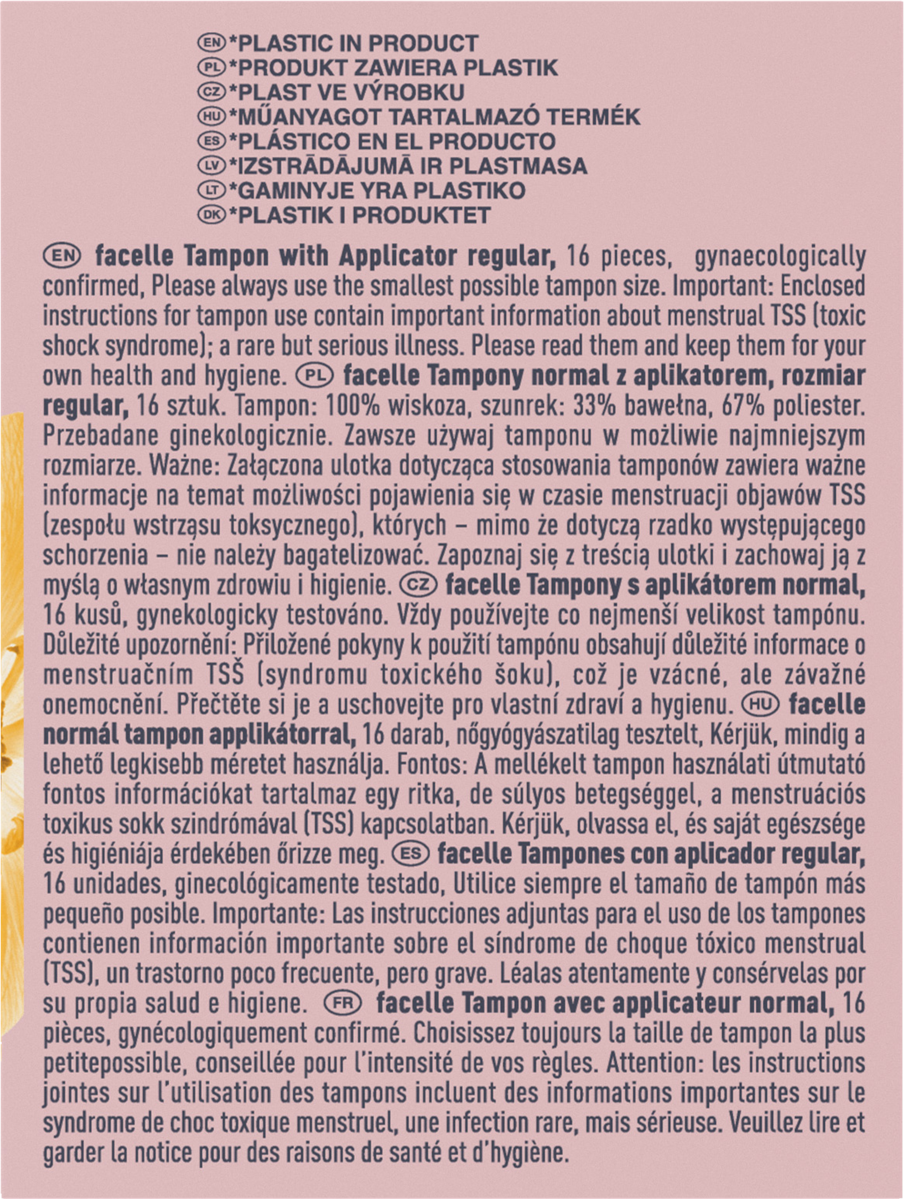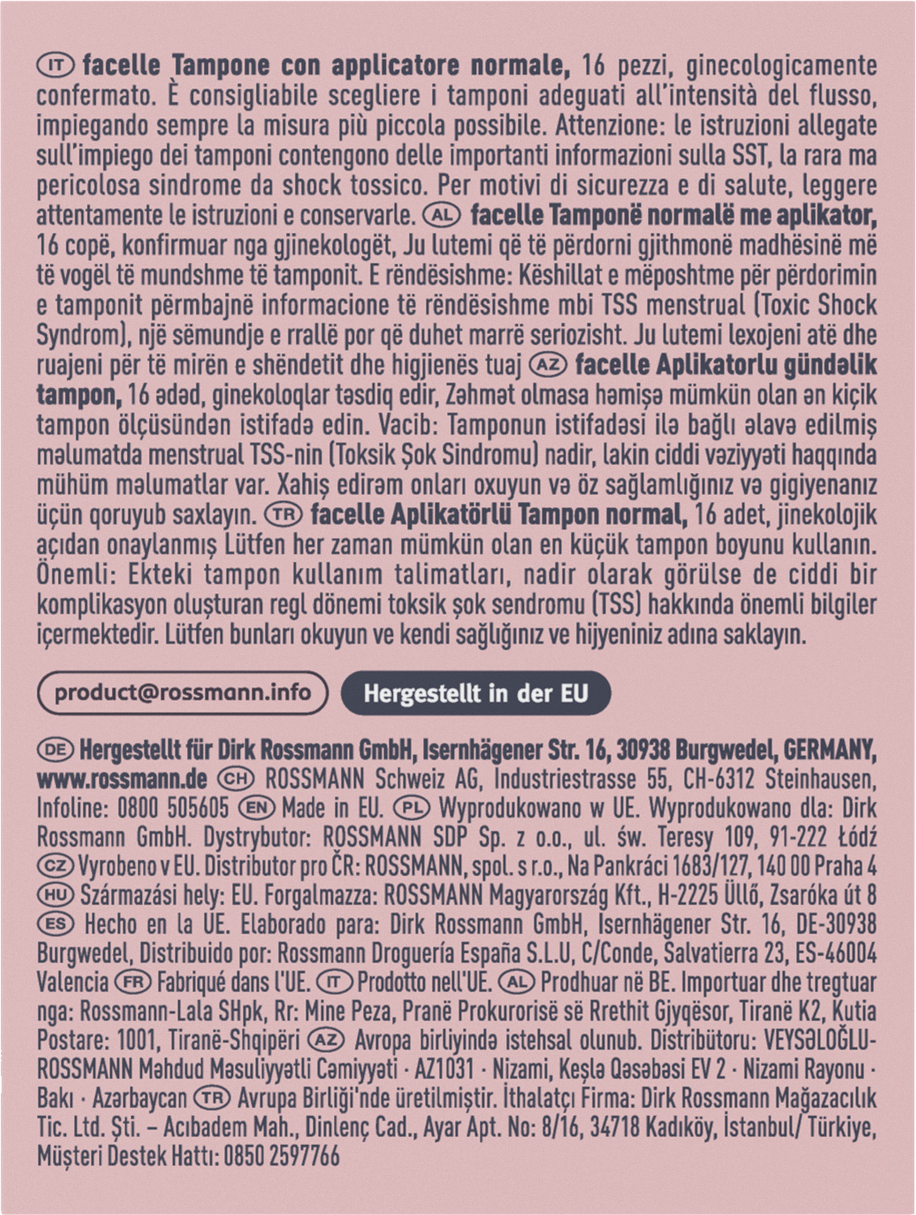 Beiliegende Hinweise zur Tamponverwendung enthalten wichtige Informationen zum menstruellen TSS (Toxic Shock Syndrom), eine seltene aber ernst zu nehmende Erkrankung. Bitte lesen Sie diese und bewahren Sie sie im Sinne Ihrer eigenen Gesundheit und Hygiene auf. Weitere Produktinformationen finden Sie unter www.rossmann.de/facelle